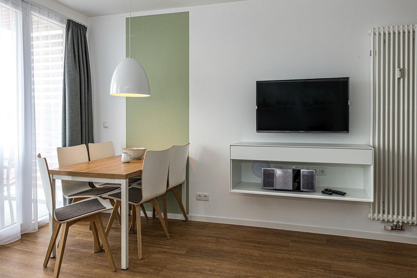 Das geschmackvoll eingerichtete Nichtraucher-Apartment verfügt über kostenfreies WLAN. Der Wohnbereich bietet eine voll ausgestattete offene Küchenzeile mit Geschirrspüler, Gefrierfach, Backofen, Kaffeemaschine, Toaster, Wasserkocher und Mikrowelle sowie einen großen Flatscreen-TV und ein Radio. Das Apartment verfügt über einen Esstisch für 5 Personen und einen behaglichen Sitzbereich mit Schlafcouch. Zwei separate Schlafzimmer mit jeweils einem Doppelbett stehen euch zur Verfügung. Eines davon verfügt zudem über einen eigenen Flatscreen-TV. Im stilvollen Badezimmer befinden sich eine große begehbare Dusche sowie ein Waschtisch mit Föhn und Kosmetikspiegel. Nach einem erlebnisreichen Urlaubstag entspannt ihr auf dem überdachten und mit Gartenmöbeln für 5 Personen ausgestatteten Balkon. Der Balkon ist vom Wohnbereich und vom Hauptschlafzimmer aus zugänglich.