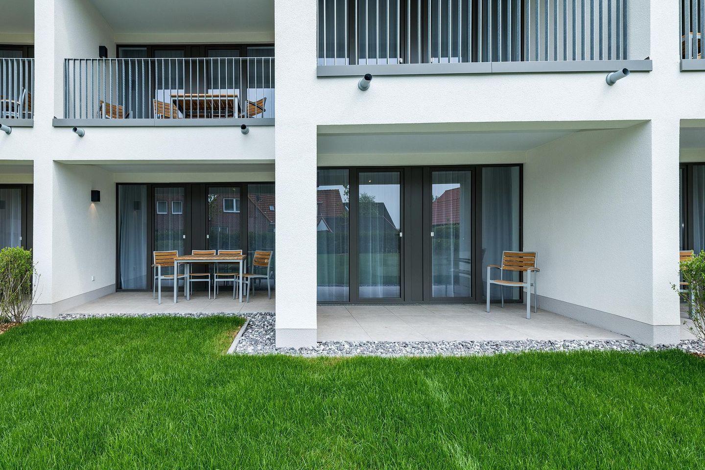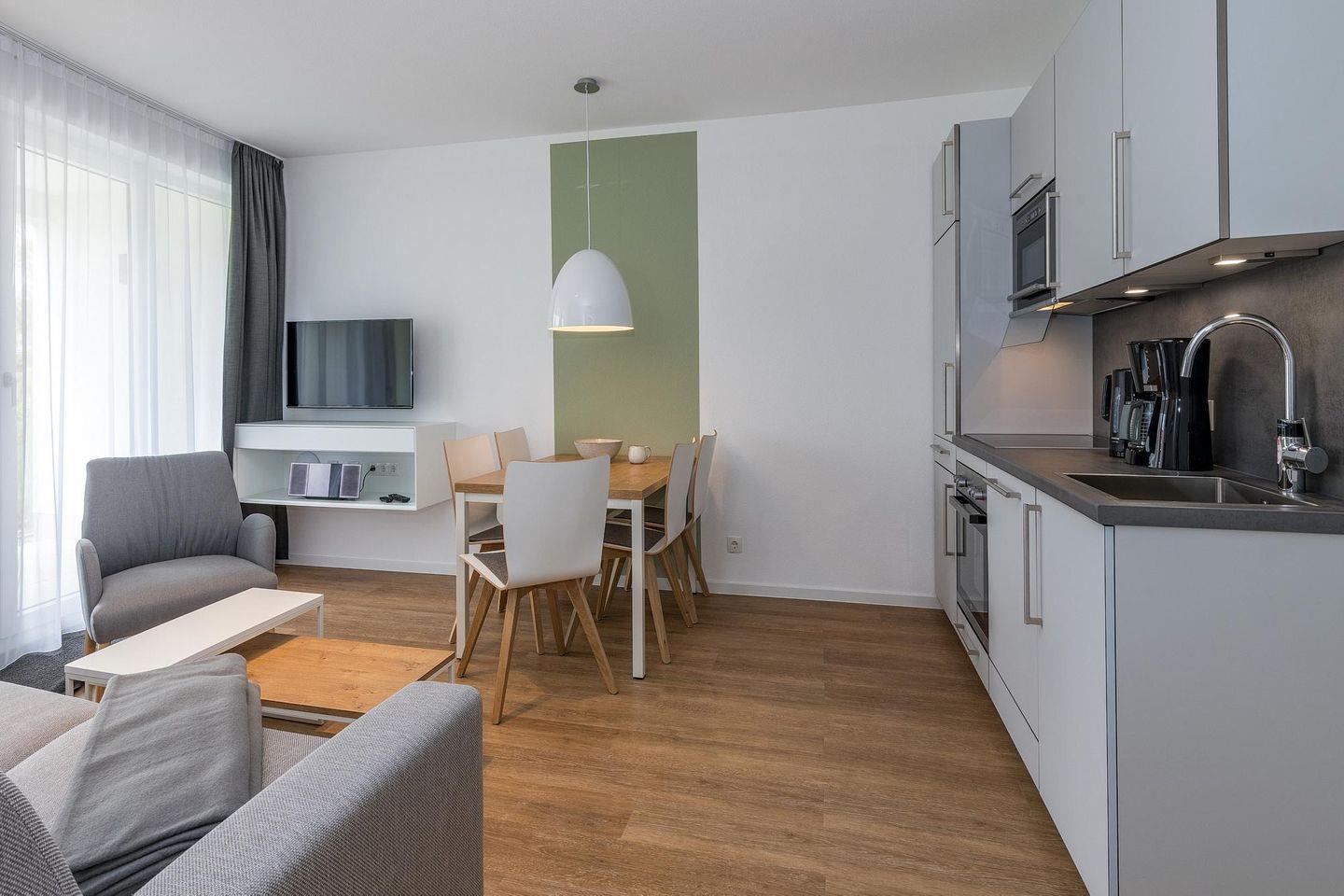 Das geschmackvoll eingerichtete Nichtraucher-Apartment verfügt über kostenfreies WLAN. Der Wohnbereich mit einer Schlafcouch bietet eine voll ausgestattete offene Küchenzeile mit Geschirrspüler, Gefrierfach, Backofen, Kaffeemaschine, Toaster, Backofen, Wasserkocher und Mikrowelle sowie einen großen Flatscreen-TV und ein Radio. Das Apartment verfügt über einen Esstisch für 5 Personen und einen behaglichen Sitzbereich. Zwei separate Schlafzimmer mit einem Doppelbett bzw. zwei Einzelbetten (Alkoven-Zimmer) stehen euch zur Verfügung. Eines davon verfügt zudem über einen eigenen Flatscreen-TV. Ein Kinderbett kann gegen Entgelt aufgestellt werden. Im stilvollen Badezimmer befinden sich eine große begehbare Dusche sowie ein Waschtisch mit Föhn und Kosmetikspiegel. Nach einem erlebnisreichen Urlaubstag entspannt ihr auf den überdachten und mit Gartenmöbeln für 5 Personen ausgestatteten Terrassen.