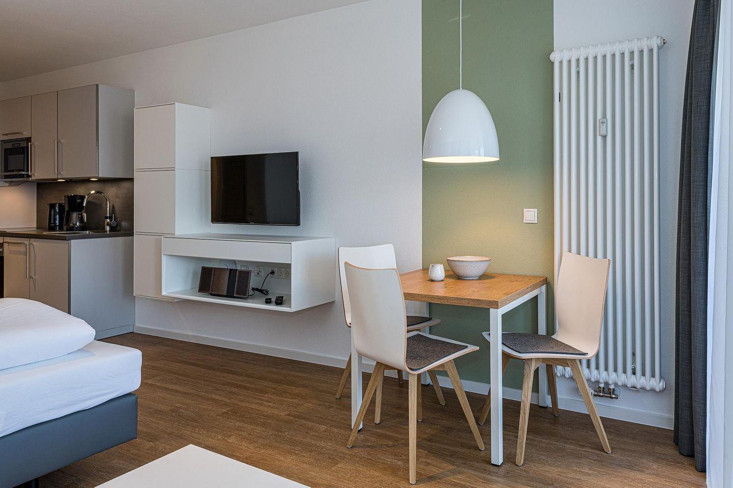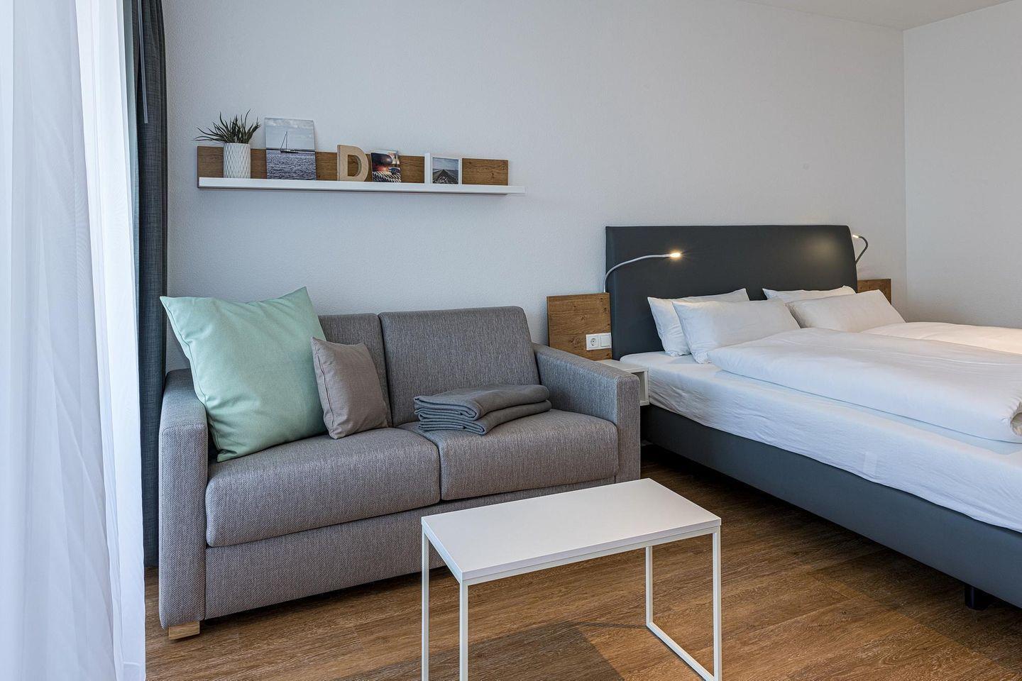 Das geschmackvoll eingerichtete Nichtraucher-Apartment verfügt über kostenfreies WLAN. Der Wohn-Schlafbereich bietet eine voll ausgestattete offene Küchenzeile mit Geschirrspüler, Gefrierfach, Backofen, Kaffeemaschine, Toaster, Wasserkocher und Mikrowelle sowie ein Doppelbett, einen großen Flatscreen-TV und ein Radio. Das Apartment verfügt über einen Esstisch für 3 Personen und einen behaglichen kleinen Sitzbereich mit Schlafcouch. Ein Kinderbett kann gegen Entgelt aufgestellt werden. Im stilvollen Badezimmer befinden sich eine große begehbare Dusche sowie ein Waschtisch mit Föhn und Kosmetikspiegel. Nach einem erlebnisreichen Urlaubstag entspannt ihr auf dem überdachten und mit Gartenmöbeln für 3 Personen ausgestatteten Balkon.