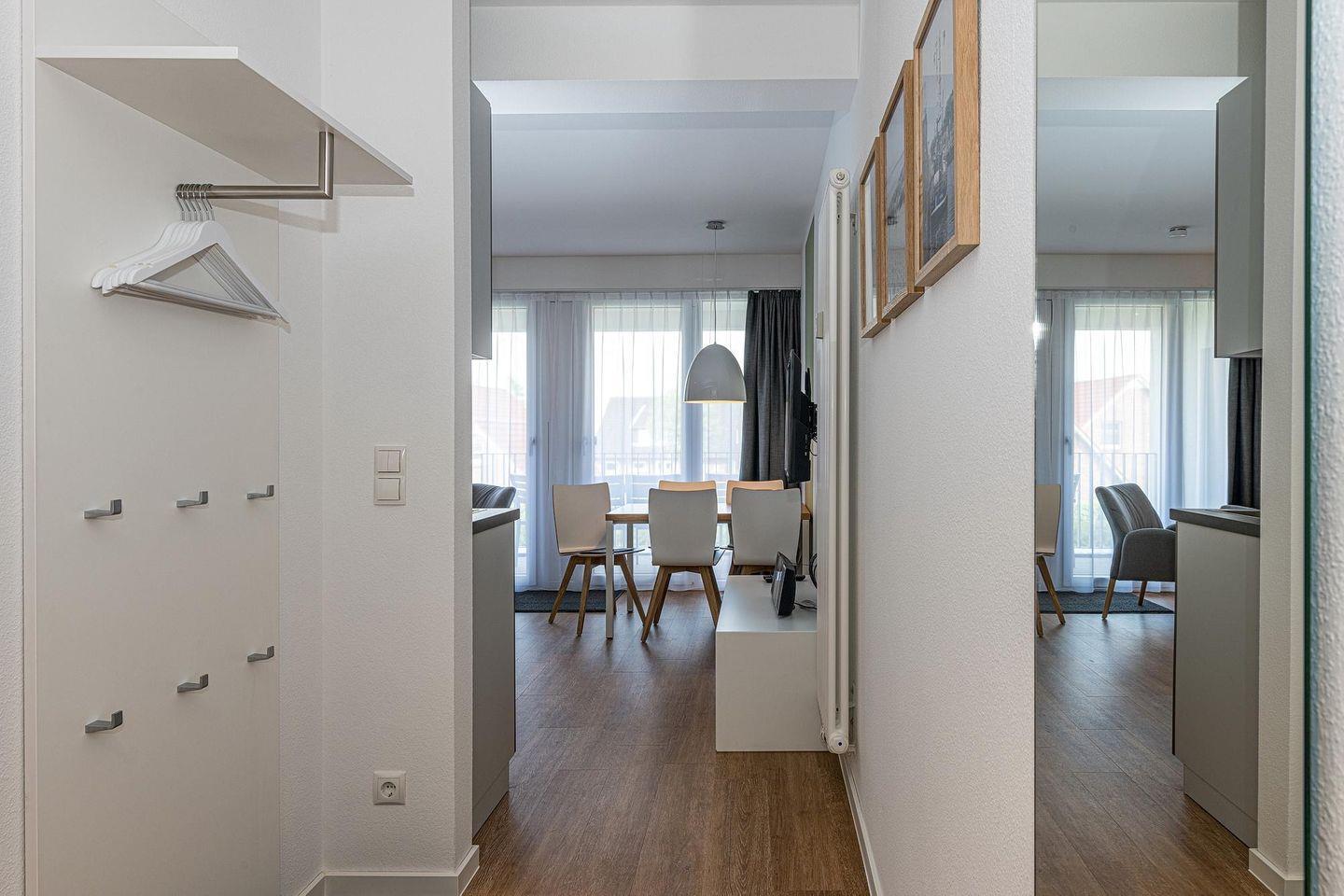 Die 58 m² große 3-Zimmer Ferienwohnung ist für bis zu 5 Personen geeignet. Besonders hervorzuheben ist der großzügige und überdachte Balkon, ähnlich einer Loggia, in sonniger Süd-West-Lage. Hier lässt sich bis zum Abend das wohltuende Meeresklima und die Sonne genießen.