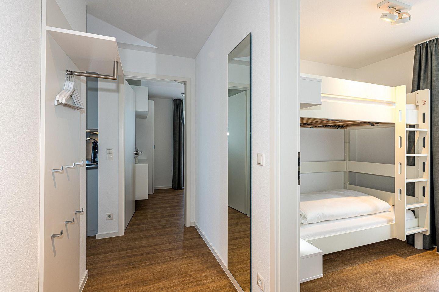 Das geschmackvoll eingerichtete Nichtraucher-Apartment verfügt über kostenfreies WLAN. Der Wohnbereich bietet eine voll ausgestattete offene Küchenzeile mit Geschirrspüler, Gefrierfach, Backofen, Kaffeemaschine, Toaster, Wasserkocher und Mikrowelle sowie einen großen Flatscreen-TV und ein Radio. Das Apartment verfügt über einen Esstisch für 4 Personen und einen behaglichen Sitzbereich. Zwei separate Schlafzimmer stehen euch zur Verfügung. Eines davon verfügt über ein Doppelbett und einen eigenen Flatscreen-TV, ein weiteres über ein Etagenbett. Ein Kinderbett kann gegen Entgelt aufgestellt werden. Im stilvollen Badezimmer befinden sich eine große begehbare Dusche sowie ein Waschtisch mit Föhn und Kosmetikspiegel. Nach einem erlebnisreichen Urlaubstag entspannt ihr auf dem überdachten und mit Gartenmöbeln für 4 Personen ausgestatteten Balkon.
