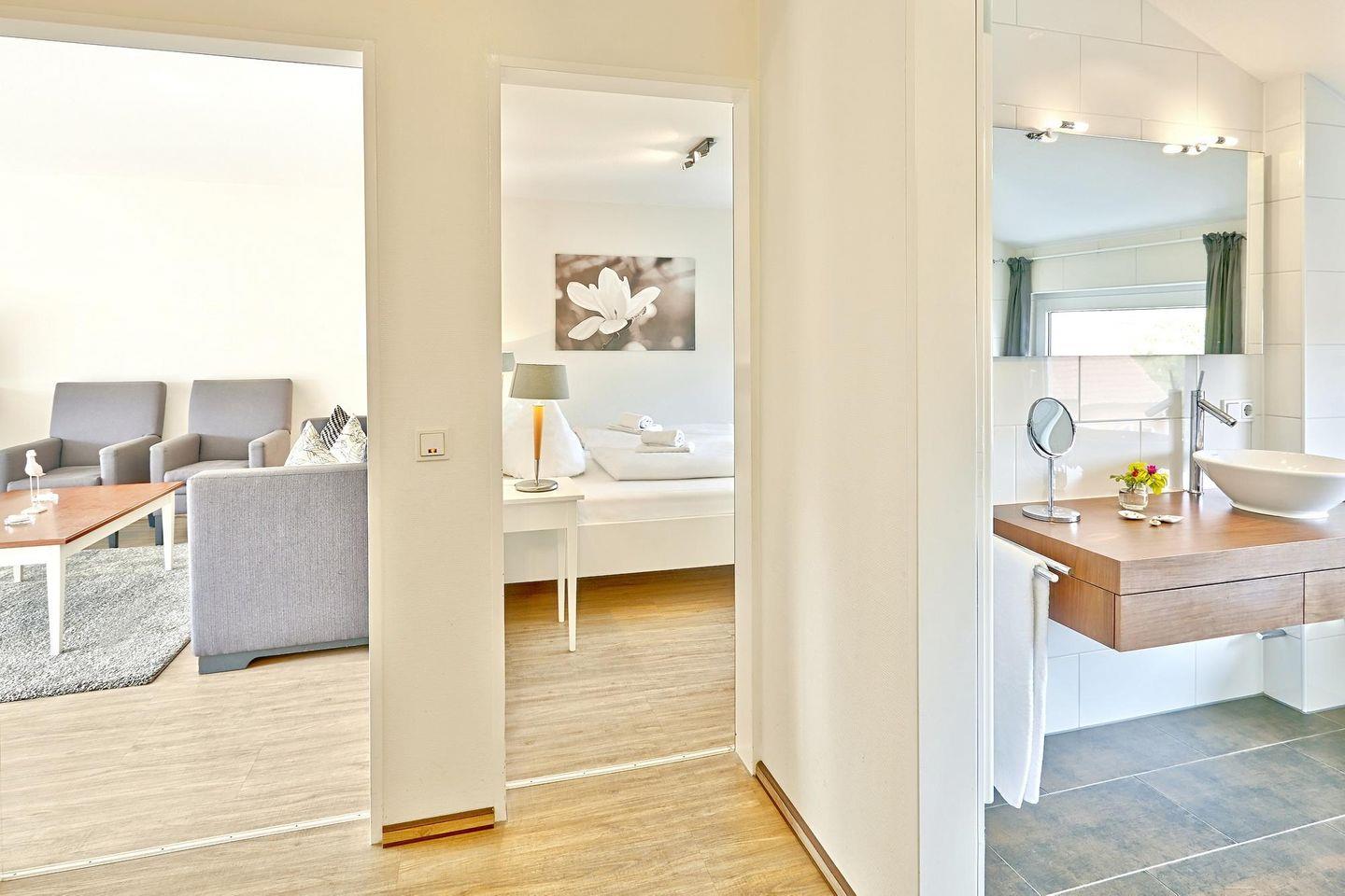 Die Wohnung verfügt über drei Schlafzimmer mit jeweils einem Doppelbett. Die beiden Badezimmer verfügen jeweils über Dusche, Waschtisch und Tageslicht.