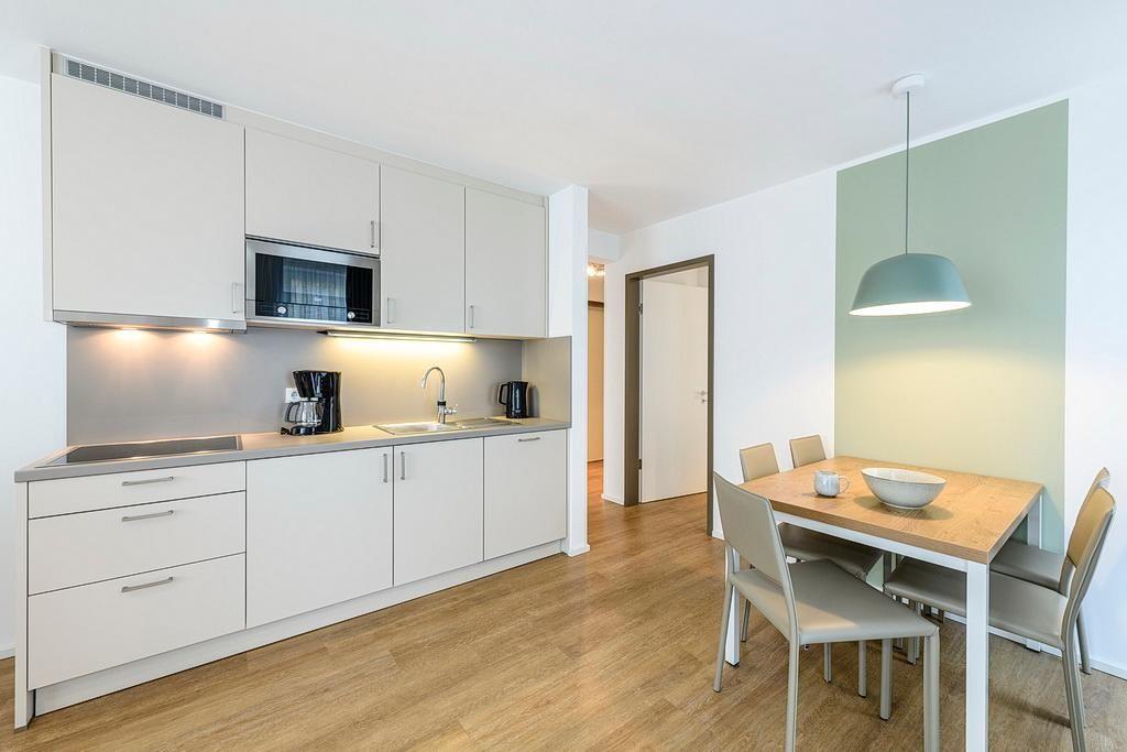 Das barrierearme Nichtraucher-Apartment verfügt über kostenfreies WLAN. Der Wohnbereich bietet eine voll ausgestattete offene Küchenzeile mit Geschirrspüler, Gefrierfach, Kaffeemaschine, Toaster, Wasserkocher und Mikrowelle mit Grillfunktion sowie einen großen Flatscreen-TV und Radio. Das Apartment verfügt über einen Esstisch und einen behaglichen Sitzbereich. In den beiden separaten Schlafzimmern befindet sich jeweils ein Doppelbett. Eines der Schlafzimmer verfügt zudem über einen zweiten Flatscreen-TV. Ein Kinderbett kann gegen Entgelt aufgestellt werden. Im stilvollen Badezimmer befinden sich eine große begehbare Dusche, eine Badewanne sowie ein Waschtisch mit Föhn und Kosmetikspiegel. Auf der privaten Terrasse mit Strandkorb und eigenem kleinem Garten lassen sich entspannte Tage verbringen.