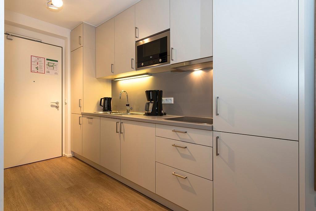 Das barrierearme Nichtraucher-Apartment verfügt über kostenfreies WLAN. Der Wohn-Schlafraum bietet eine voll ausgestattete offene Küchenzeile mit Geschirrspüler, Gefrierfach, Kaffeemaschine, Toaster, Wasserkocher und Mikrowelle mit Grillfunktion sowie ein Doppelbett, eine Schlafcouch einen großen Flatscreen-TV und Radio. Das Apartment verfügt über einen kleinen Esstisch und einen behaglichen Sitzbereich. Ein Kinderbett kann gegen Entgelt aufgestellt werden. Im stilvollen Badezimmer befinden sich eine große begehbare Dusche sowie ein Waschtisch mit Föhn und Kosmetikspiegel. Nach einem erholsamen Urlaubstag lässt sich auf der mit Gartenmöbeln ausgestatteten Terrasse in West-Lage herrlich entspannen.