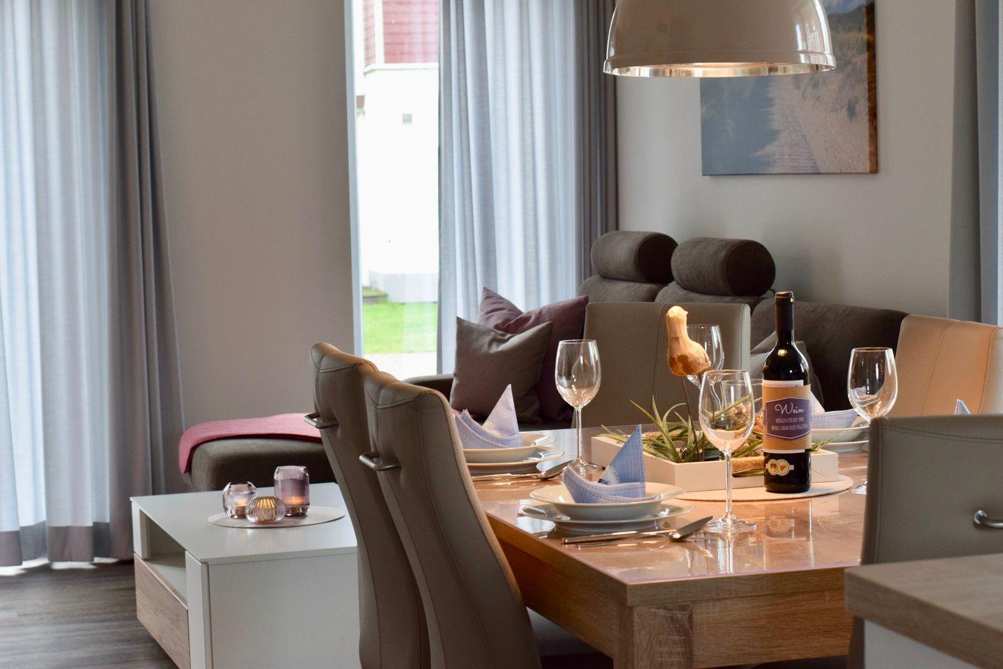 Das geschmackvolle und helle Nichtraucher-Ferienhaus verfügt über Fußbodenheizung, kostenfreies WLAN und bodentiefe Fenster. Im Erdgeschoss befindet sich die moderne und voll ausgestattete offene Küche mit Kaffeevollautomat, Kaffeefiltermaschine, Geschirrspülmaschine, 4-Felder Ceranherd und Backofen, Mikrowelle, Toaster, Wasserkocher und Kühlschrank mit Tiefkühlfach. Im kombinierten Wohn-Essbereich stehen euch ein großer SMART-TV (45 Zoll) und ein Kamin zur Verfügung (Kaminholz ist nicht inbegriffen). Sowohl der Esstisch, als auch der behagliche Sitzbereich bieten euch viel Platz, um gesellige Stunden mit der Familie oder Freunden nach einem schönen Tag am Strand zu verbringen. Bereits beim Frühstück könnt ihr auf der großzügigen und südlich gelegenen Terrasse die idyllische Lage genießen. Die Terrasse verfügt über Gartenmöbel-Möbel und Sonnenschirm und ist vom Wohnbereich aus begehbar.
