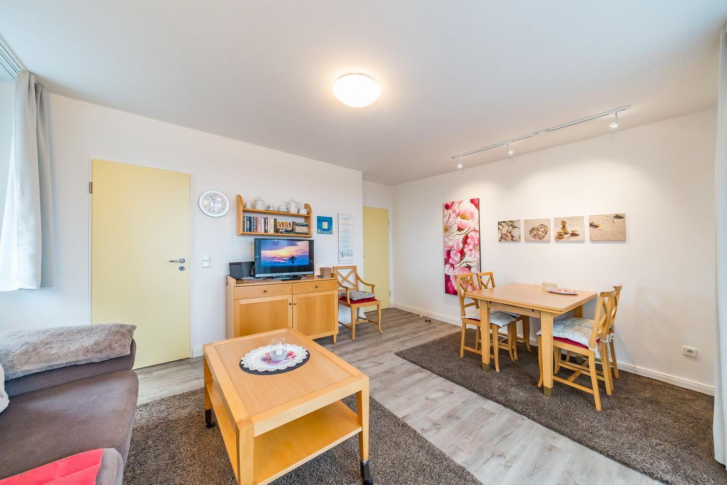 Der Wohn-Essbereich bietet euch einen Flatscreen-TV (32 Zoll), HiFi-Anlage, CD-Player, Gesellschaftsspiele und Bücher. Von hier aus habt ihr auch Zugang zum überdachten Balkon in Südwest-Lage mit seitlichem Meerblick!