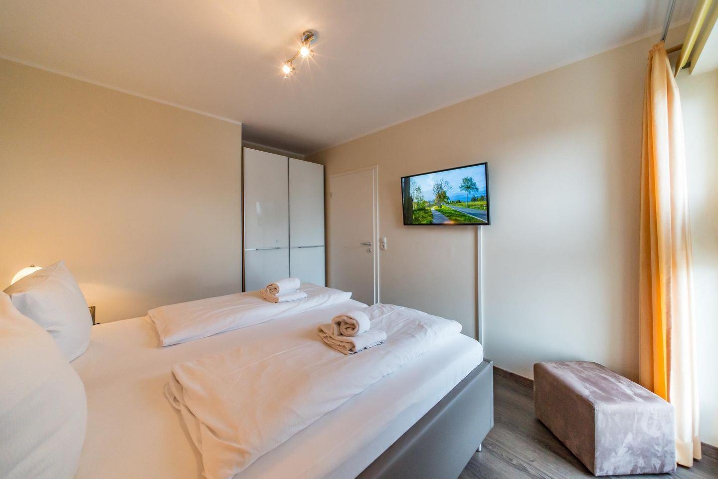 Das Apartment besteht aus einem Schlafzimmer, einem großzügigen Wohn-Essbereich mit Kaminofen, einem hochwertigem Bad mit Whirlbadewanne und Fußbodenheizung sowie aus der sonnigen Dachterrasse in Süd-Lage