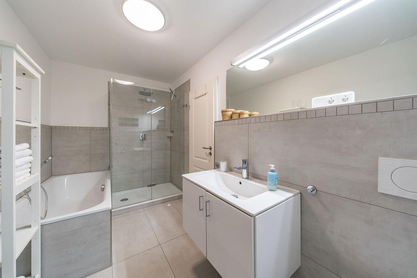 Die zweite Ebene beinhaltet zwei separate Schlafzimmer mit einem Doppelbett bzw. zwei Einzelbetten sowie das hochwertige Badezimmer mit Sauna, Badewanne, Waschtisch, WC, begehbarer Dusche, Handtuchwärmer, Kosmetikspiegel, Föhn und Waschmaschine mit Trocknerfunktion.