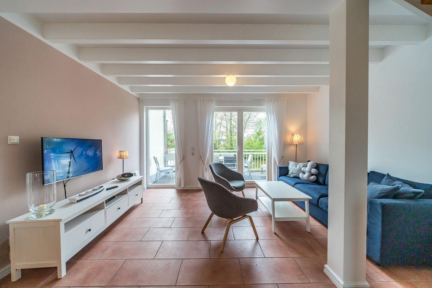 Das lichtdurchflutete Nichtraucherhaus verfügt über Fußbodenheizung, bodentiefe Fenster und kostenfreies WLAN. Auf der ersten Wohnebene befindet sich die moderne und voll ausgestattete offene Küche mit Geschirrspülmaschine, Mikrowelle, Backofen, Toaster, Kaffeekapselmaschine (Cafissimo), Wasserkocher, Kühlschrank mit Tiefkühlfach sowie 4-Felder Ceranherd. Auf dieser Ebene liegt auch der behaglich-skandinavisch eingerichtete Wohn-Essbereich mit Kaminofen (Kaminholz ist nicht inbegriffen), SMART-TV und DVD-Player. Sowohl der Esstisch, als auch der Sitzbereich bieten viel Platz um gesellige Stunden mit der Familie oder Freunden nach einem schönen Tag am Strand zu verbringen. Von hier aus habt ihr Zugang zur wunderschön am Wasser gelegenen Terrasse - mitten im idyllischen Grün. Ein Sonnenschirm, Gartenmöbel und Sonnenliege stehen für euch bereit. Auf der ersten Etage befindet sich ein separates WC.