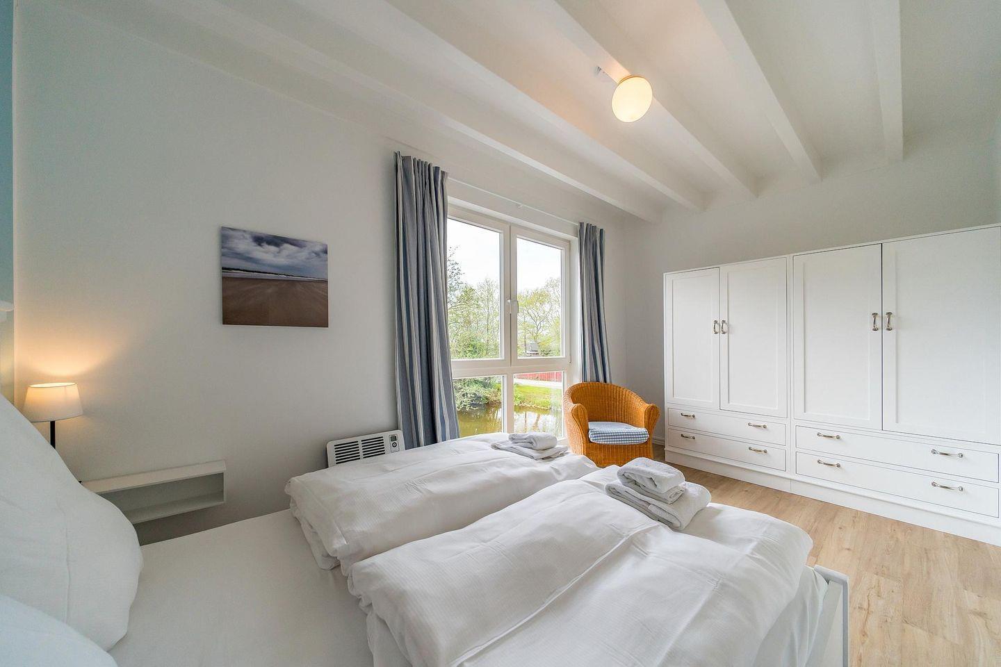 Das exklusive 102 qm große 5-Zimmer-Ferienhaus ist für bis zu 6 Personen geeignet. Einmalig schön sind der überdachte Balkon mit Blick bis zum Deich sowie die idyllisch gelegene Terrasse direkt am Wasserlauf. Das Apartment verfügt über Sauna, Badewanne und Kaminofen!