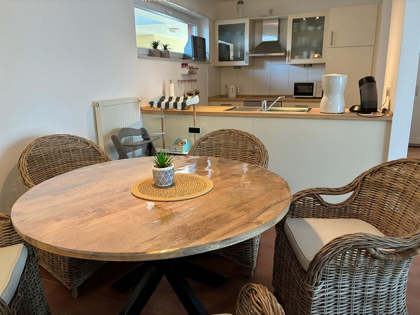 Die gehobene Ausstattung setzt sich in der offenen, voll ausgestatteten Küche fort: Hier findet ihr alles, was das Herz begehrt – Backofen, Geschirrspüler, Tiefkühlfach, Wasserkocher, eine Philips Senseo, Kaffeepadmaschine (Senseo), Toaster, Mikrowelle, Mixer, Sandwich-Maker, Eierkocher, Bügeleisen und Bügelbrett. Für Unterhaltung sorgen ein Blu-ray-Player, verschiedene Gesellschaftsspiele und eine Auswahl an Büchern.