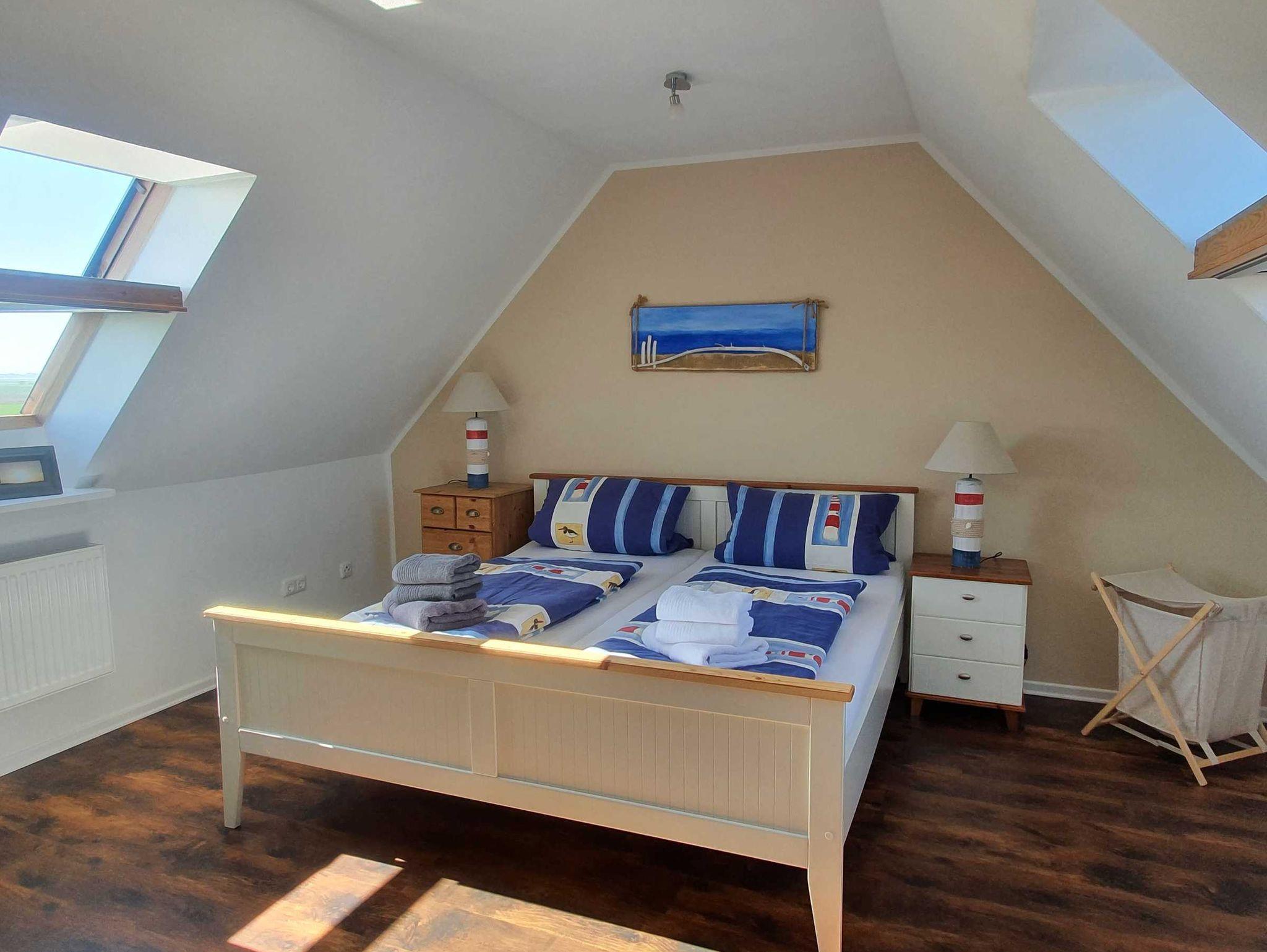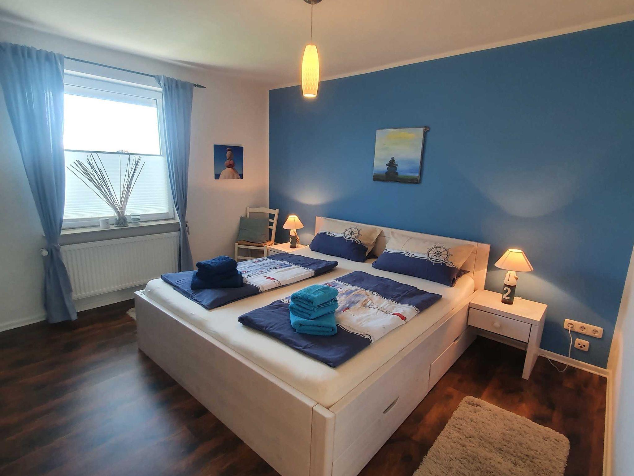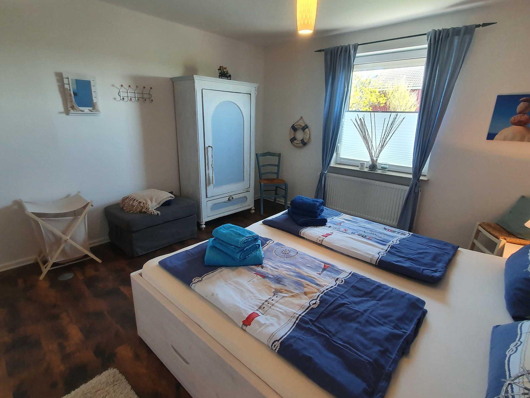 Das Schlafzimmer unten ist ausgestattet in maritimen hellblau-weiß-Tönen, mit einem neuen Doppelbett in komfortabler Höhe (54 cm, Liegefläche: 180 x 200 cm, 2 Matratzen), 2 Nachttischen, 1 Sitztruhe sowie einem Kleiderschrank.