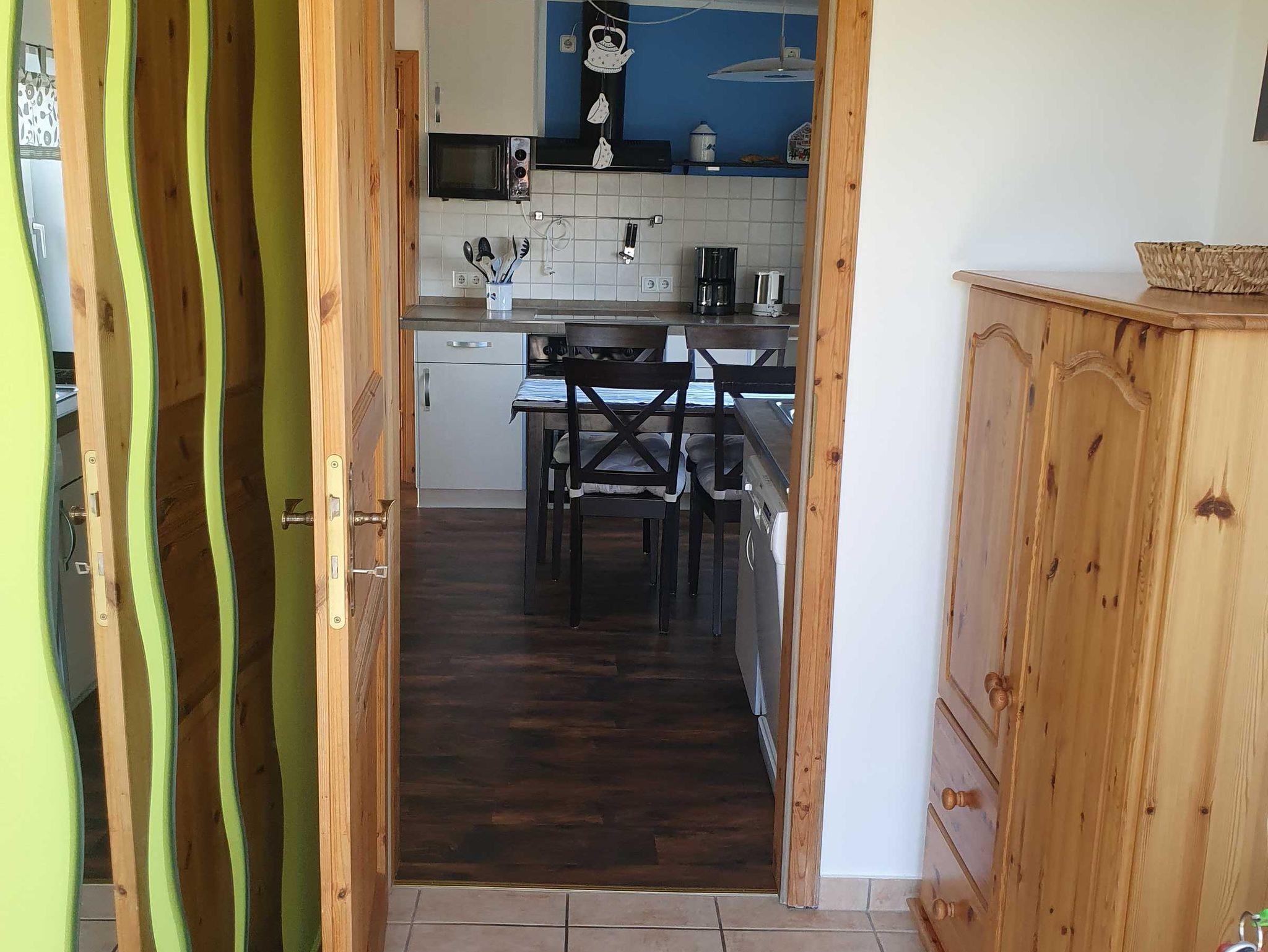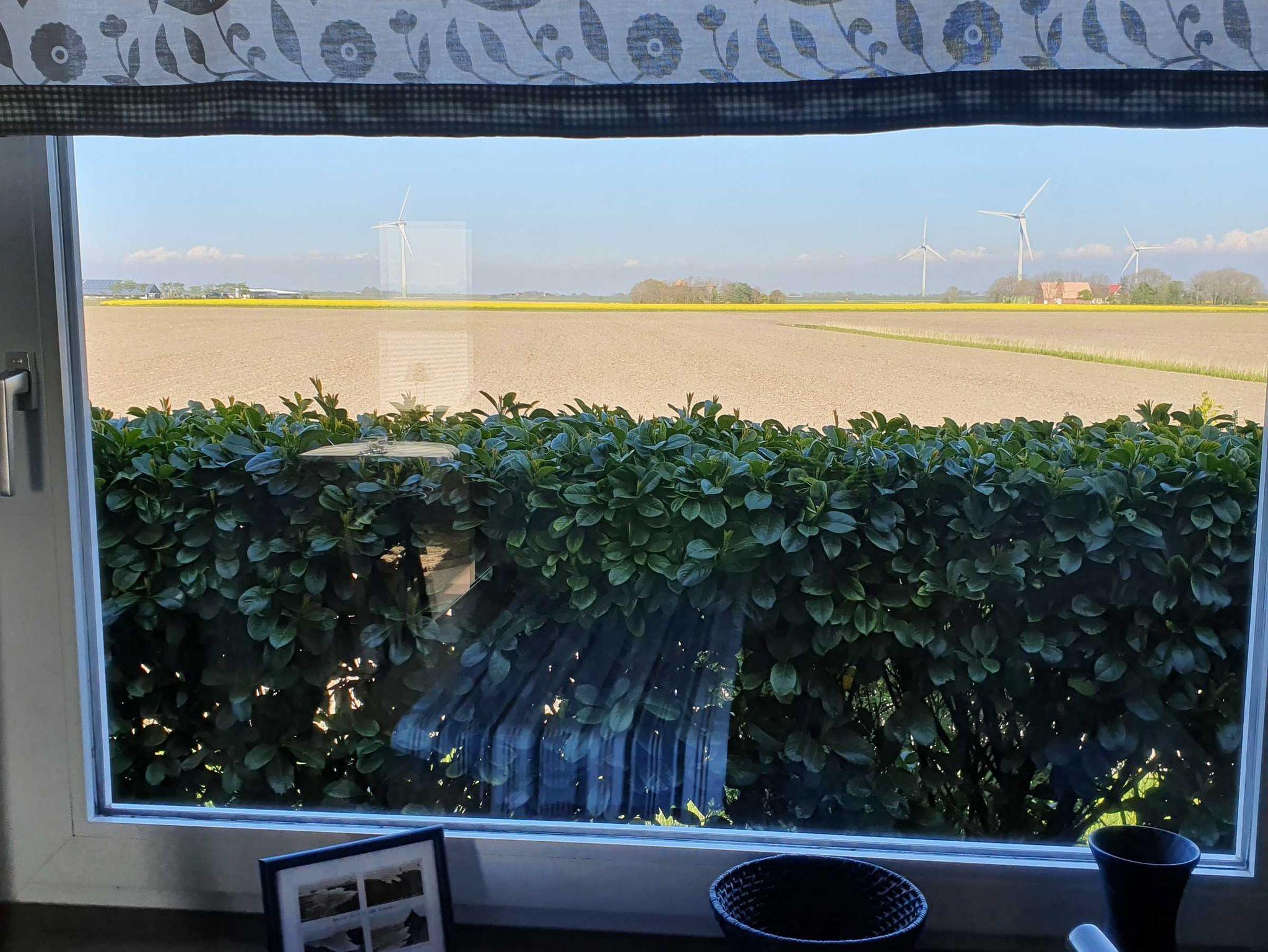 Die Küche des Deichhauses ist perfekt ausgestattet mit Spülmaschine, Mikrowelle, Herd mit Backofen und allem, was man braucht (Kaffeemaschine, Toaster, Wasserkocher, Mixer, umfangreiches, gut sortiertes, schönes Steingut-Geschirr u.v.m. verstehen sich von selbst), sowie einem schönen Essplatz mit Blick in die Weite der Felder der norddeutschen Landschaft, ebenso wie das Wohnzimmer in gleicher Blickachse. Den Hingucker der Küche bildet der hellgrüne Retro-Stand-Kühlschrank mit Gefrierfach.