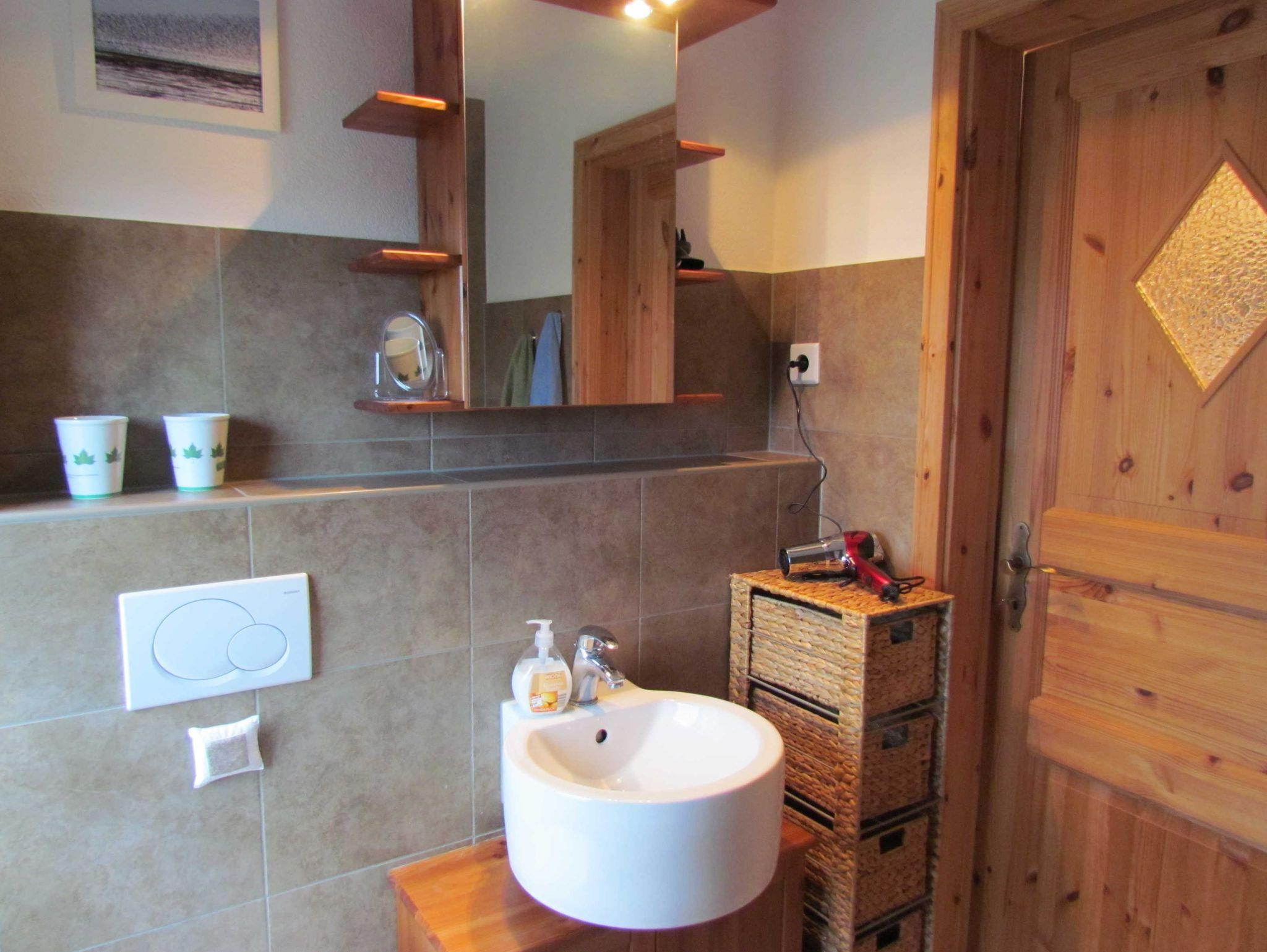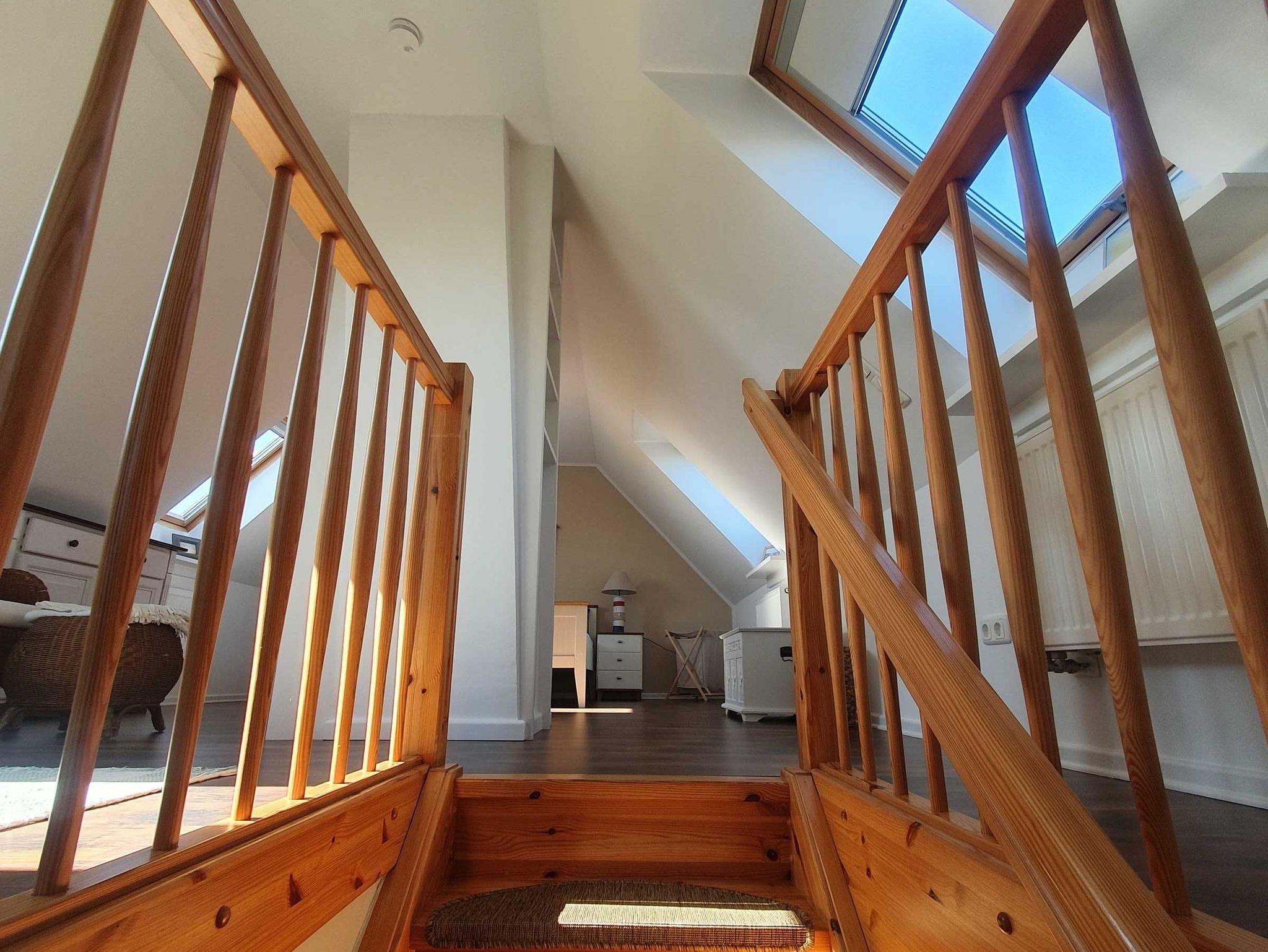 Es verfügt über1 Wohn-/Schlafzimmer im Dachgeschoß, 1 Schlafzimmer + 1 Wohnzimmer mit Schlafcouch im EG), 1 modernes ebenerdiges Wellness-Duschbad mit WC im EG mit viel Stauraum.