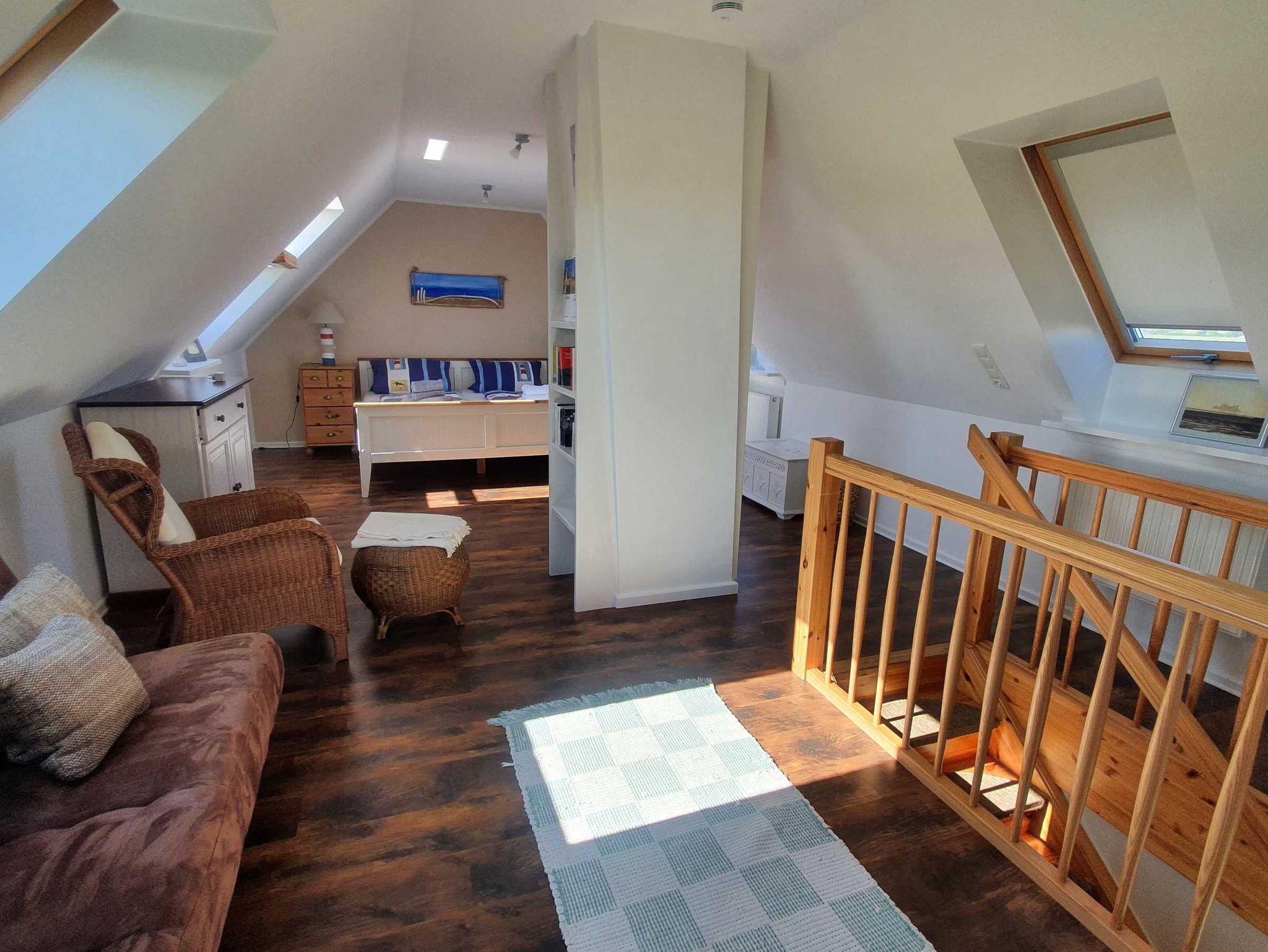 Der obere Bereich bietet ein großes, helles Wohn-Schlafstudio. Hier steht das 2. Bett mit einer Liegefläche von 180 x 200 cm (2 Matratzen à 90 cm), 2 Nachttisch-Kommoden, 2 weitere Wäschekommoden nebst Holzbank sowie einem weiteren Sitzbereich mit gemütlicher Schlafcouch und Lesesessel mit Fußhocker (und 2. kleiner Stereoanlage) zum Relaxen, Lesen oder Träumen.