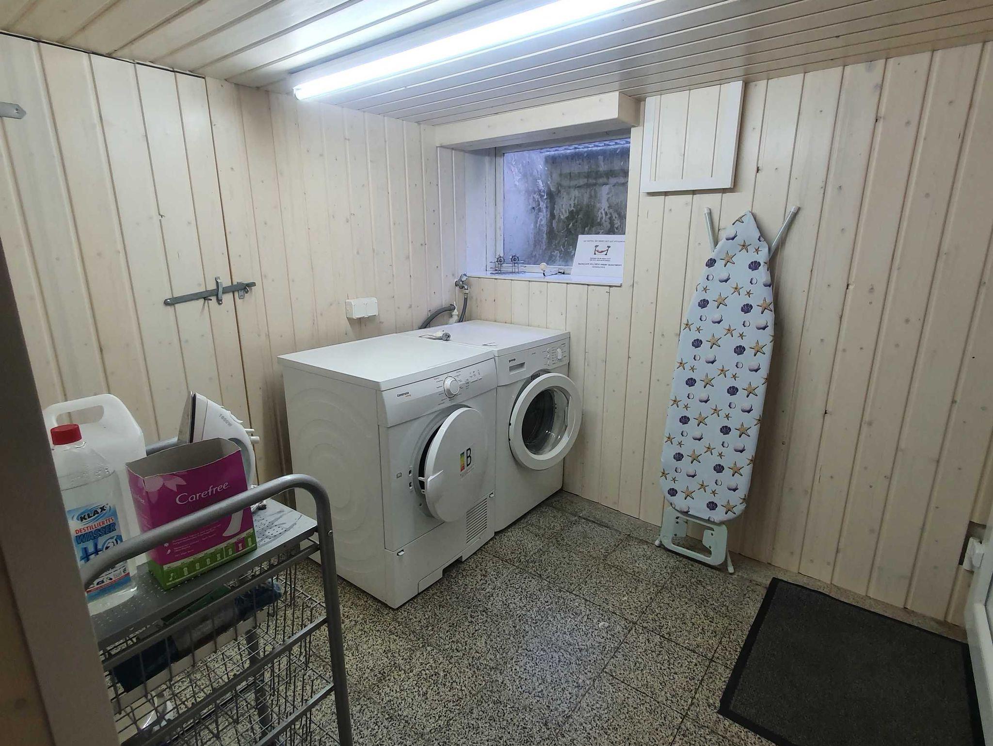 Der hauseigene helle Wirtschaftsraum im UG (der auch von den Mietern des Roten Atelierhauses mit genutzt werden kann) ist ausgestattet mit Waschmaschine, Trockner, Bügelbrett, Bügeleisen und Infrarot-Sauna und wurde ebenfalls 2020 renoviert.