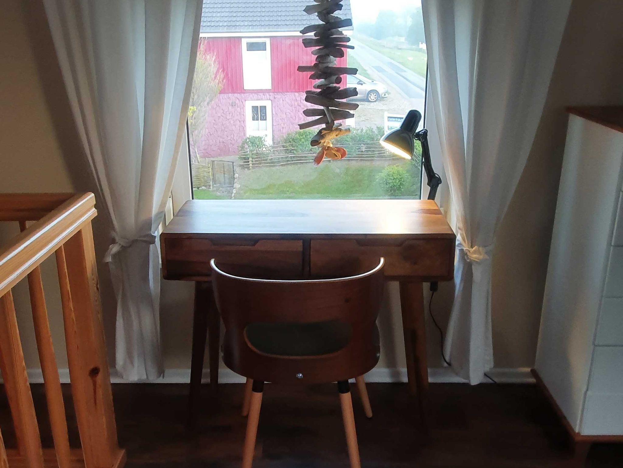 Neu: Der Retro-Schreibtisch mit Blick zum Garten und über die Felder, der den Raum abrundet und Lust macht, wieder mal eine Postkarte zu schreiben...