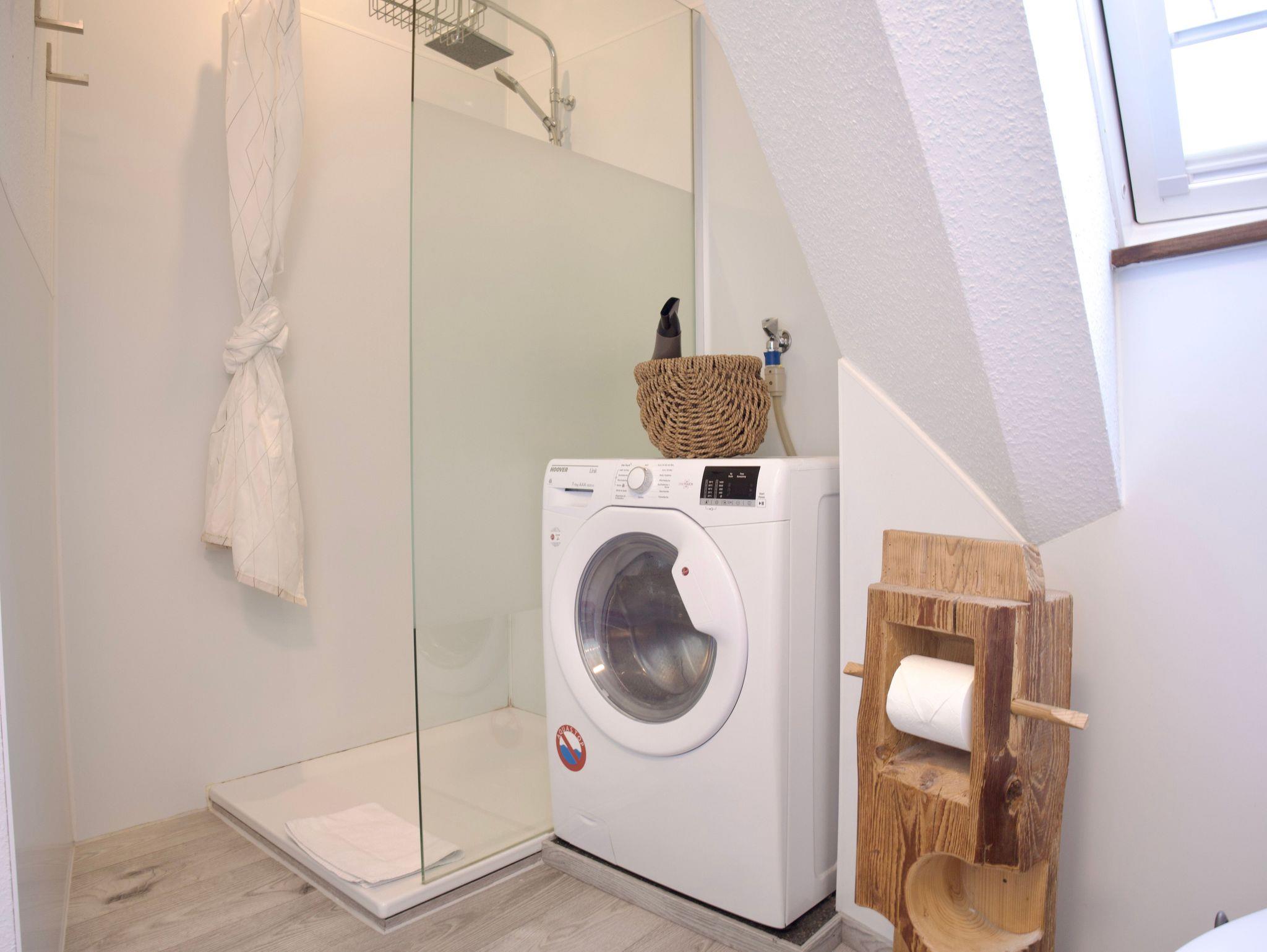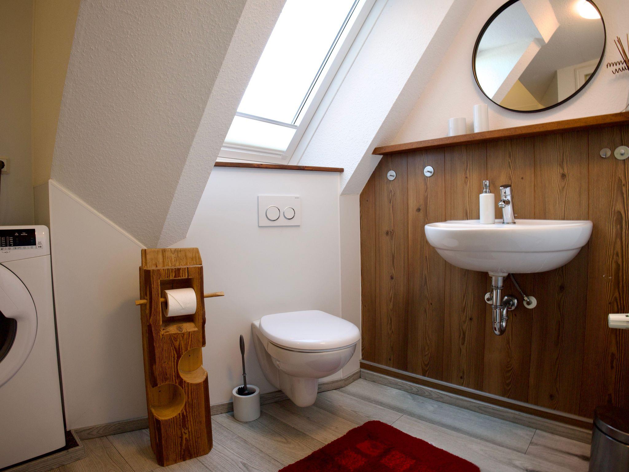 Das Badezimmer präsentiert sich hell und modern. Dunkle Holzakzente setzen stilvolle Kontraste, ein Fenster sorgt für natürliches Licht und ein angenehmes Raumgefühl. Eine Waschmaschine steht ebenfalls zur Verfügung und ergänzt die Ausstattung praktisch.