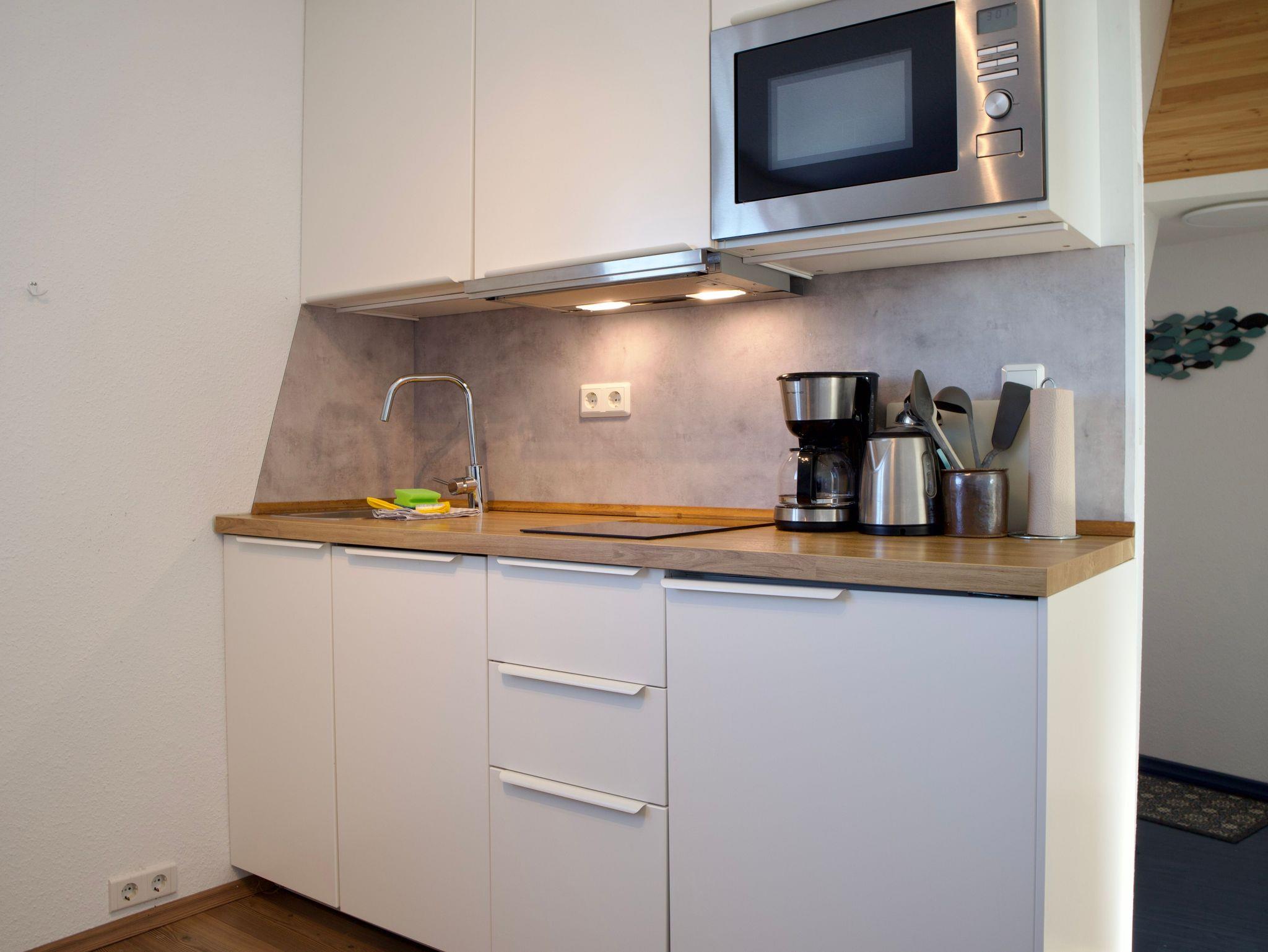 Die Wohnküche fügt sich harmonisch in den Wohnbereich ein und lässt keine Wünsche für die Selbstversorgung im Urlaub offen. Sie ist modern gestaltet, mit Holzakzenten versehen und verfügt unter anderem über eine Kaffeemaschine sowie eine Gefriermöglichkeit. Ein großes Fenster sorgt für viel Tageslicht und eröffnet den Blick ins Grüne.