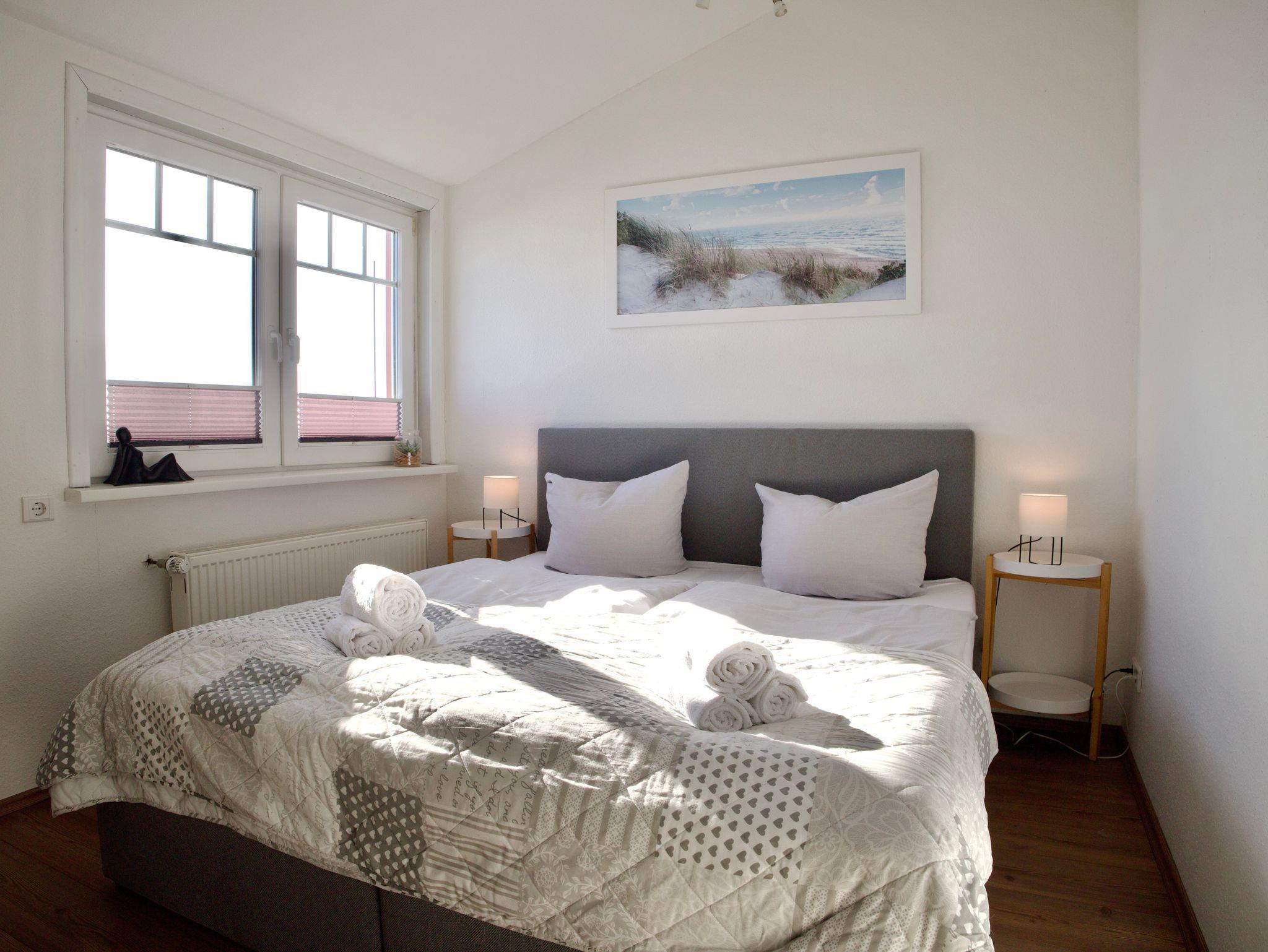 Zwei liebevoll eingerichtete Schlafzimmer mit komfortablen Doppelbetten bieten ruhige Rückzugsorte für erholsame Nächte. Die klare Gestaltung in warmen Farbtönen unterstreicht den gemütlichen Charakter der Wohnung und schafft eine entspannte Wohnatmosphäre.