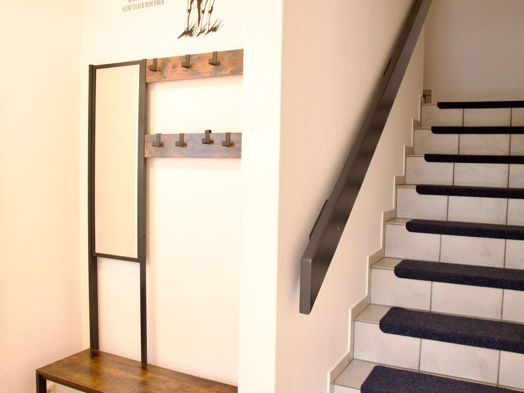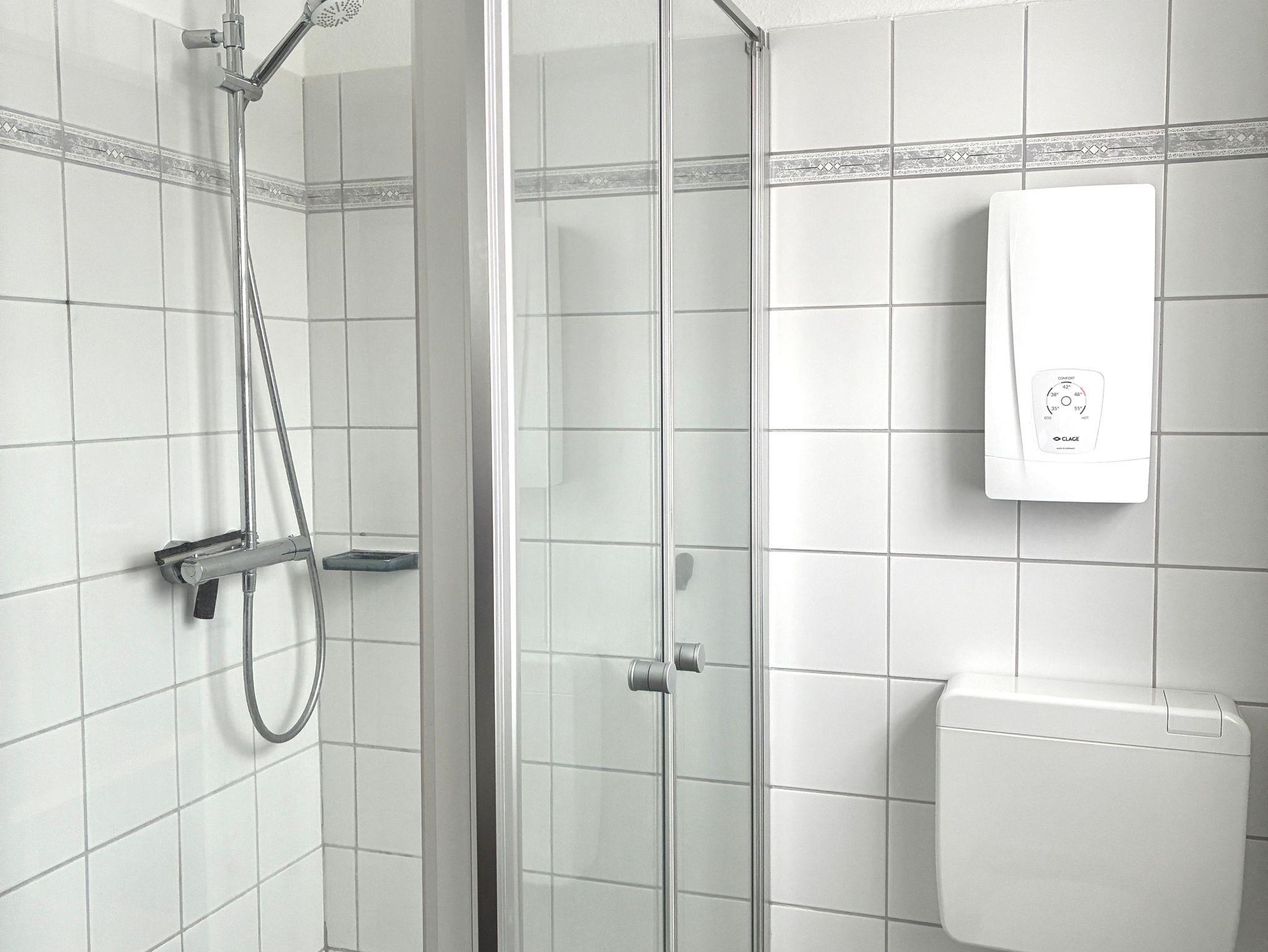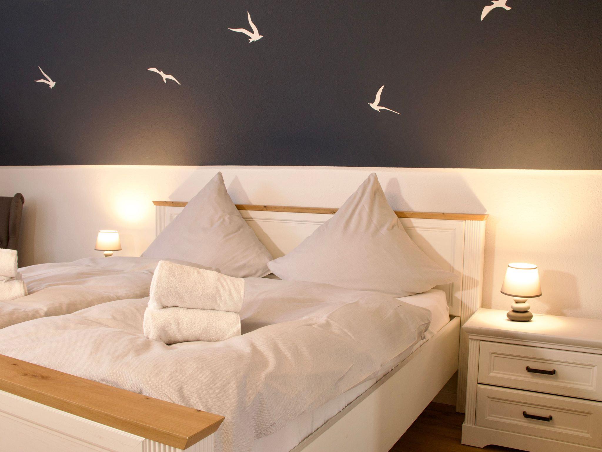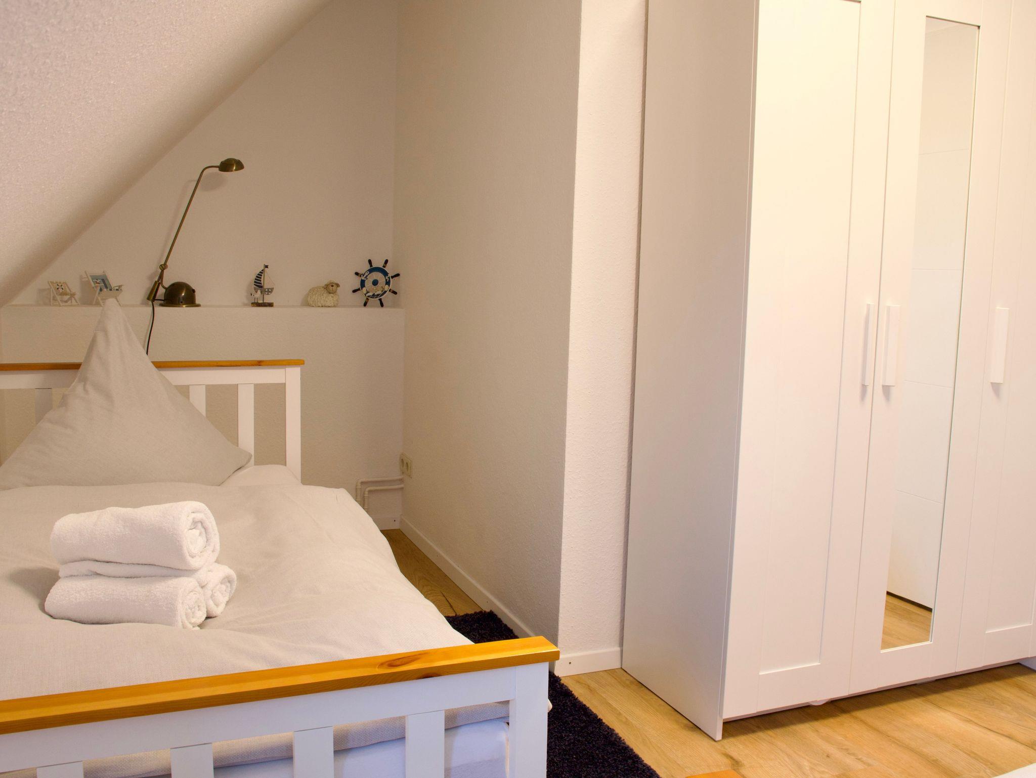 Im Obergeschoss befinden sich zwei Schlafzimmer sowie das Badezimmer. Ein Schlafzimmer ist mit einem Doppelbett in der Größe 180 x 200 Zentimeter ausgestattet, das zweite verfügt über zwei Einzelbetten mit den Maßen 90 x 200 Zentimeter. Das moderne Badezimmer bietet eine Walk-In-Dusche und ergänzt das Raumangebot zeitgemäß und funktional.