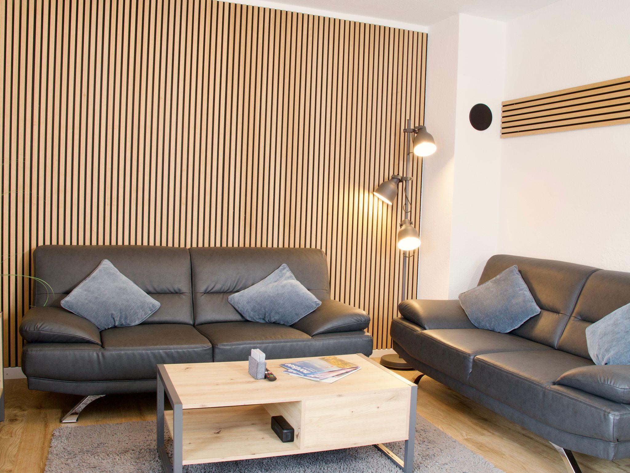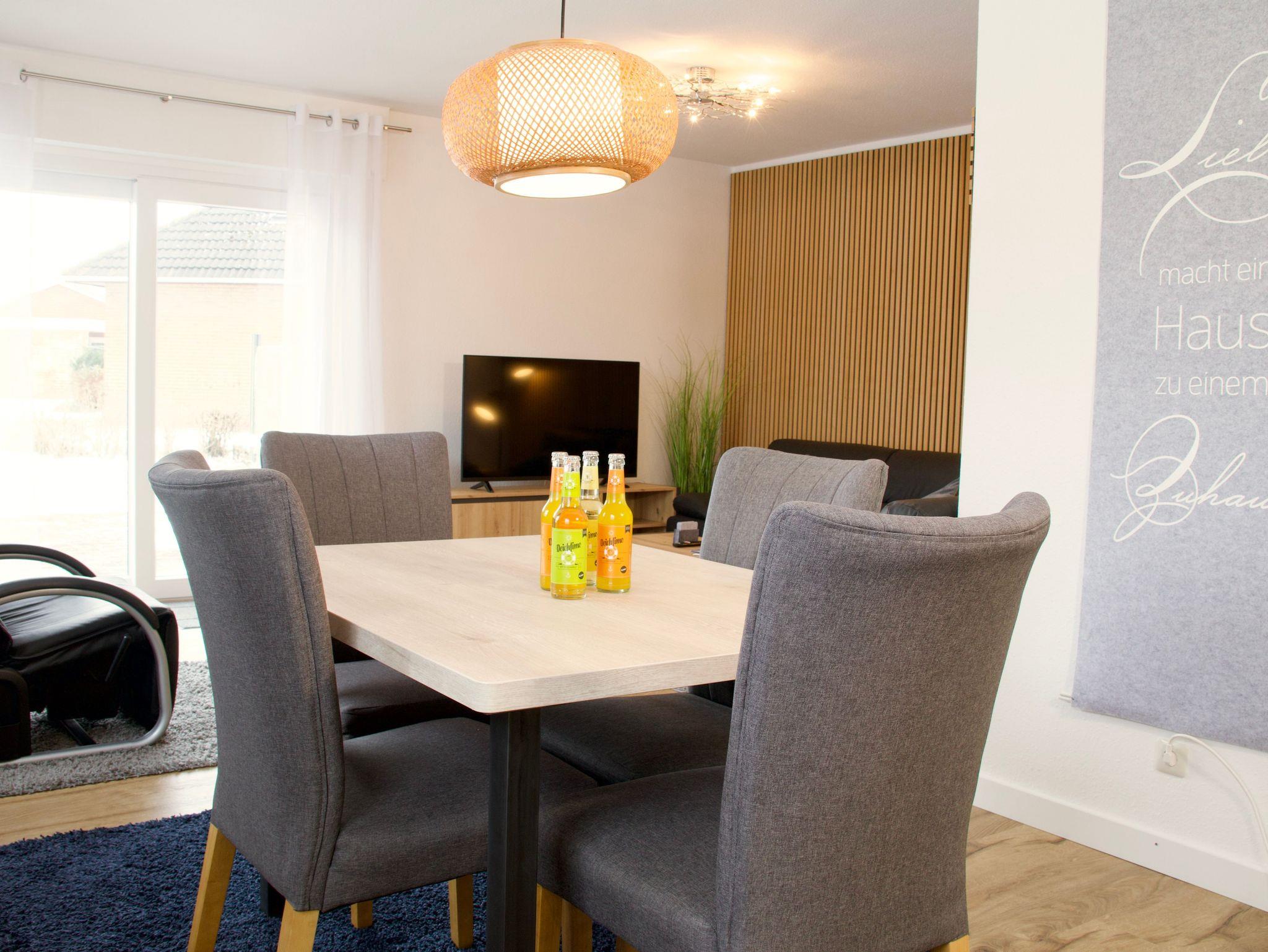 Im Erdgeschoss befindet sich die großzügige Wohnküche mit offenem Wohn- und Essbereich. Große Fenster sowie der direkte Zugang zur Terrasse sorgen für viel Tageslicht und eröffnen den Blick ins Grüne sowie auf den Deich. Der Wohnbereich ist mit moderner Holzvertäfelung gestaltet und vermittelt eine warme, zugleich stilvolle Atmosphäre. Ein Smart-TV ergänzt den Wohnbereich und lädt zu entspannten Abenden ein.