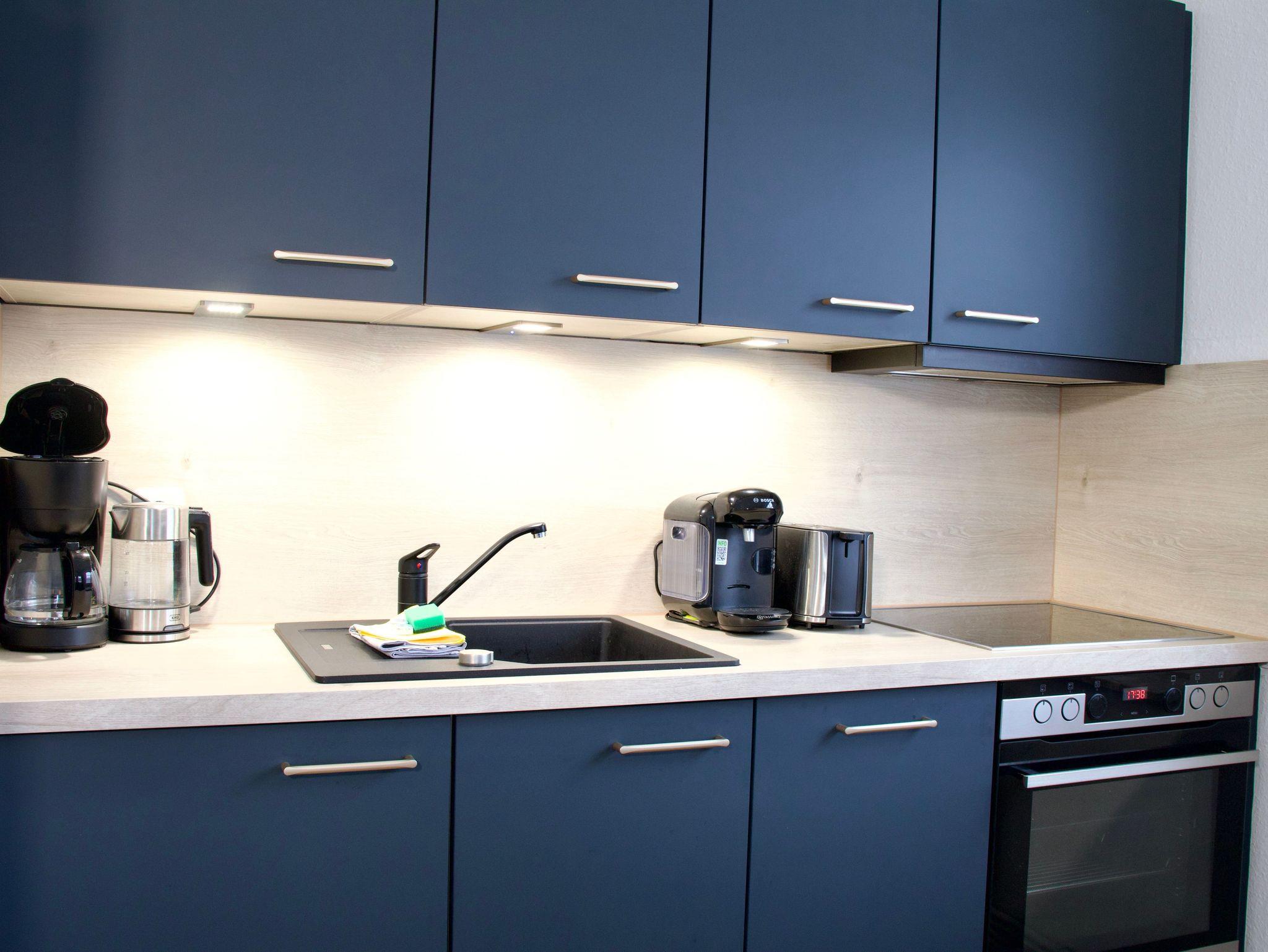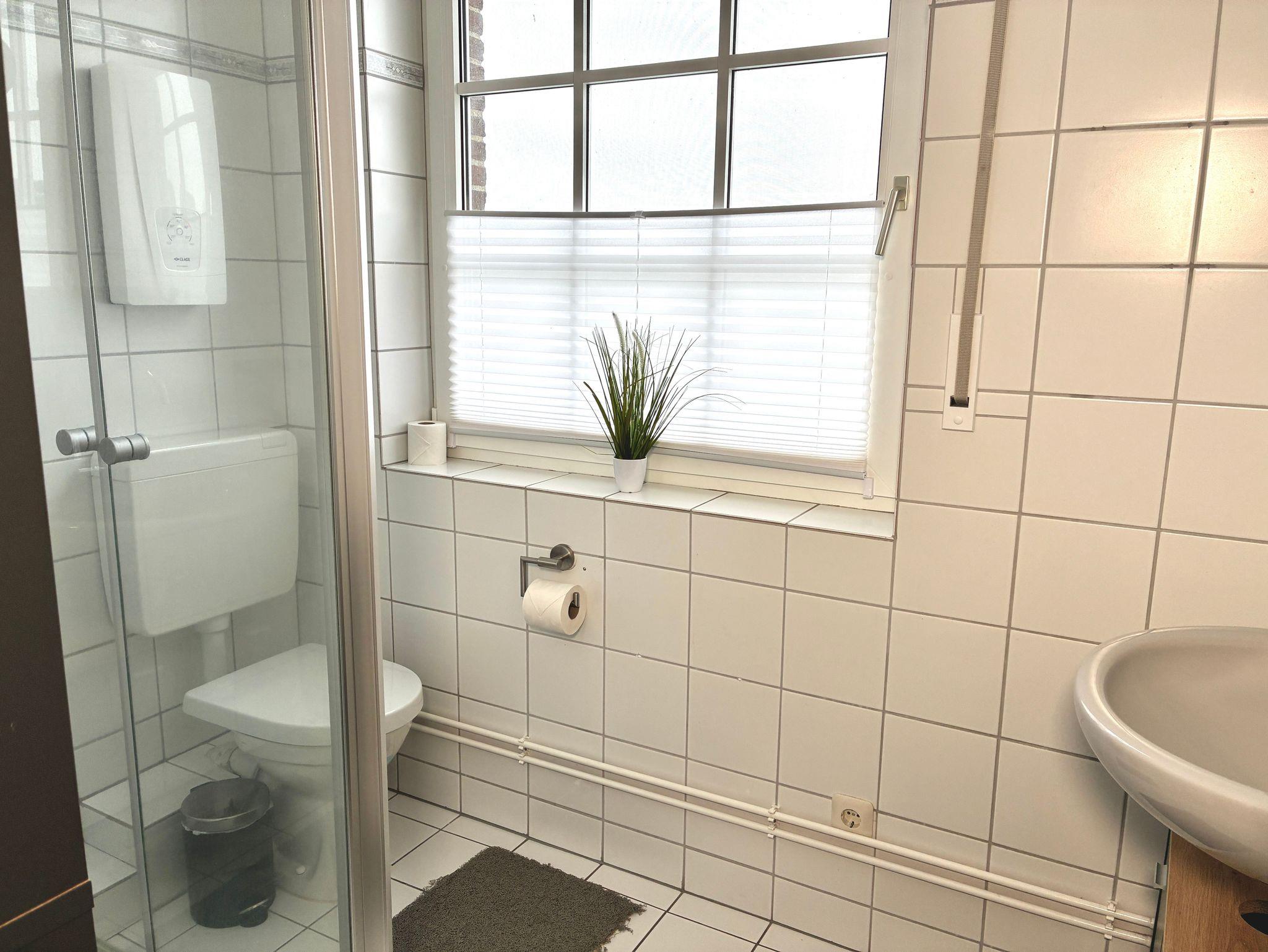 Die Küche ist modern und funktional ausgestattet und bietet alles, was für die Selbstversorgung benötigt wird. Eine Spülmaschine, eine Gefriermöglichkeit sowie eine Kaffeemaschine stehen zur Verfügung. Ein großes Fenster mit Blick auf den Deich unterstreicht den offenen, hellen Charakter des Raumes. Zusätzlich befindet sich im Erdgeschoss ein Gäste-WC.