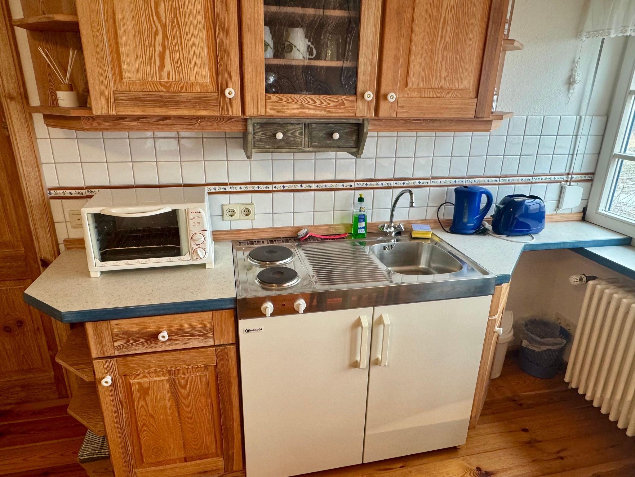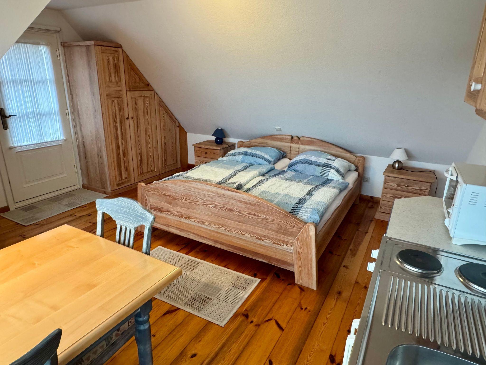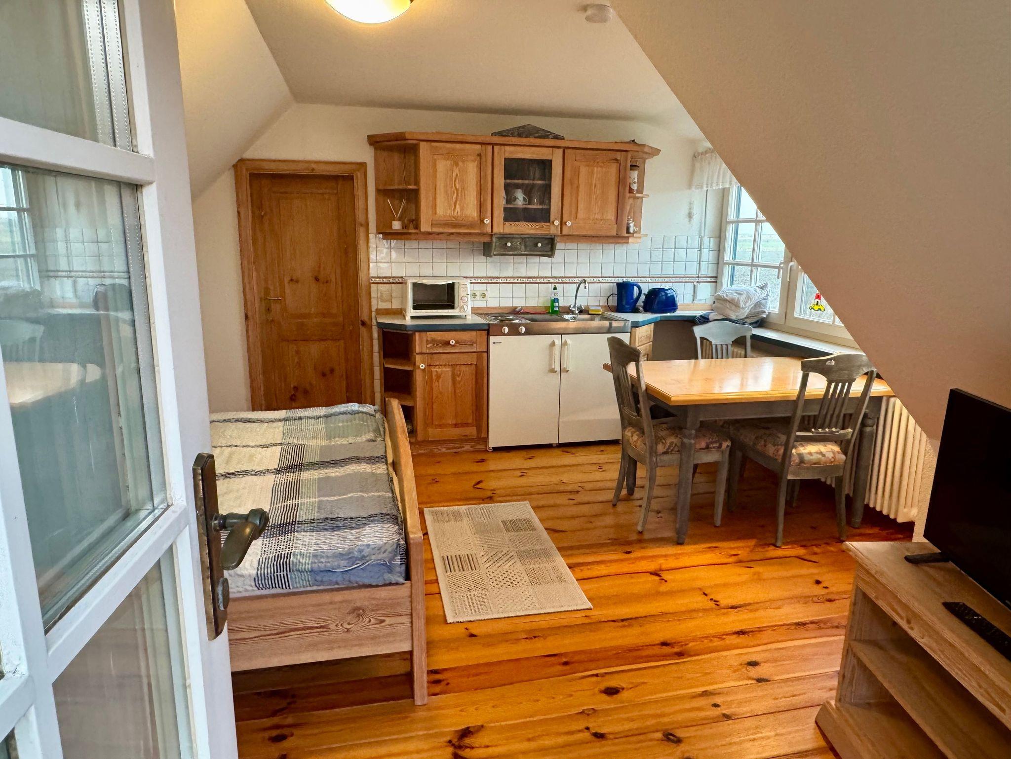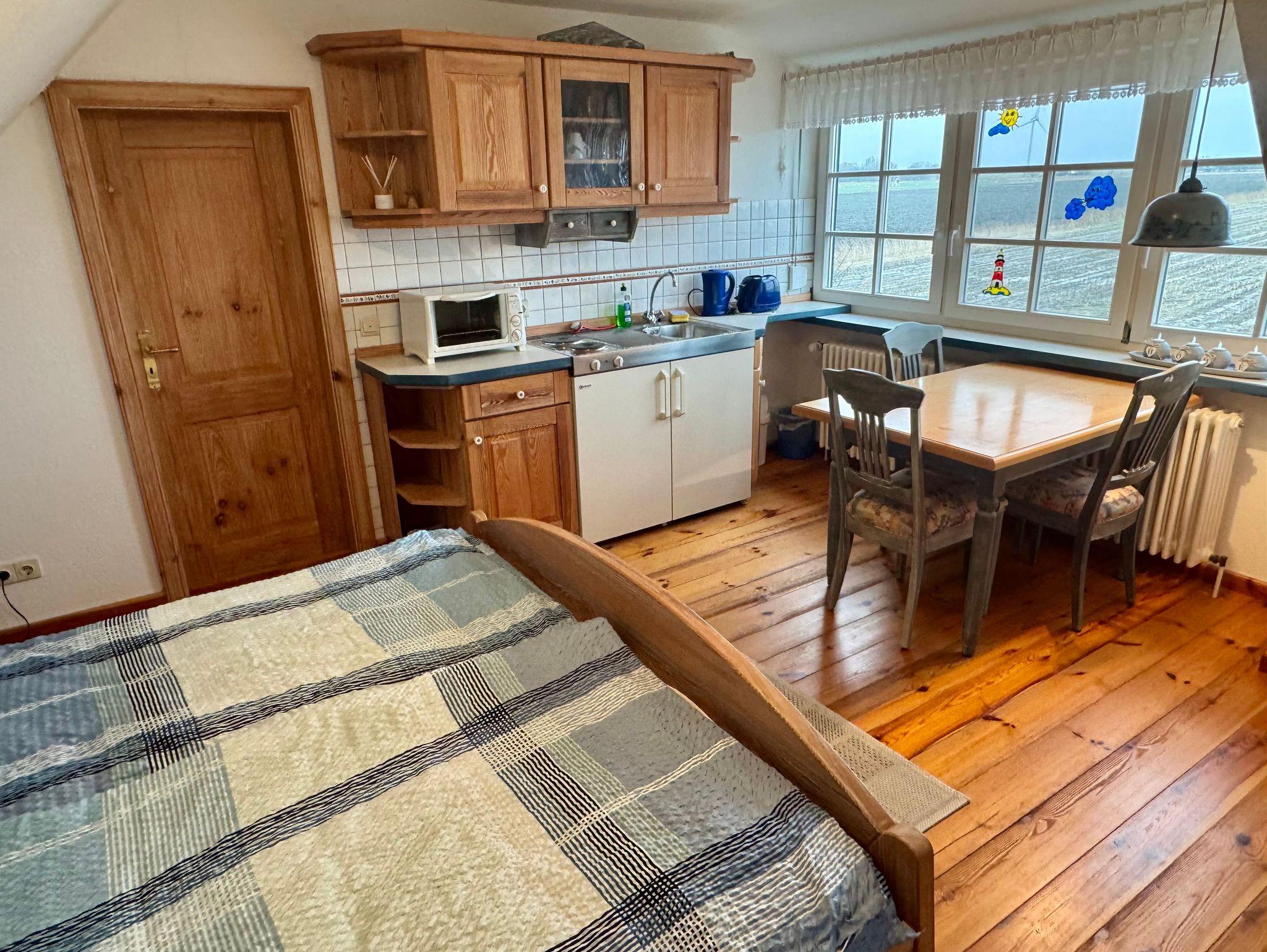 Der kombinierte Wohn- und Schlafraum ist mit einem komfortablen Doppelbett (200 × 90 cm), einem Kleiderschrank sowie einer praktischen Pantryküche ausgestattet. Diese verfügt über einen 2-Platten-Herd, einen kleinen Backofen und eine gemütliche Essecke mit herrlichem Blick auf die Nordstrander Felder und die umliegende Natur. Direkt angrenzend befindet sich das moderne Duschbad.