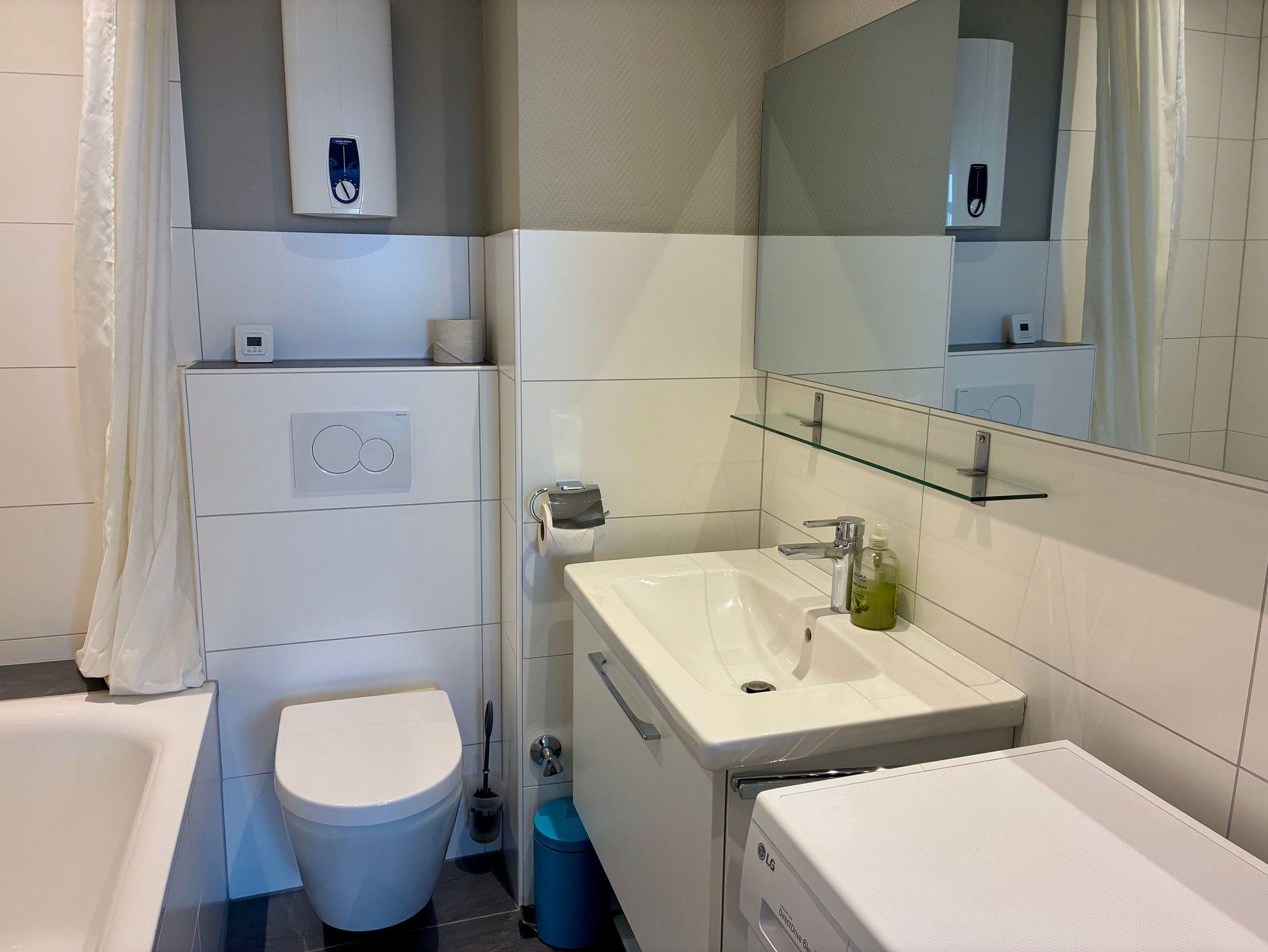 Das Badezimmer ist mit einer Badewanne mit Duschmöglichkeit sowie einer Waschmaschine ausgestattet und bietet auch bei längeren Aufenthalten zusätzlichen Komfort. WLAN steht kostenfrei zur Verfügung, ebenso ein Smart-TV und eine Stereoanlage. Haustiere sind in dieser Wohnung herzlich willkommen.