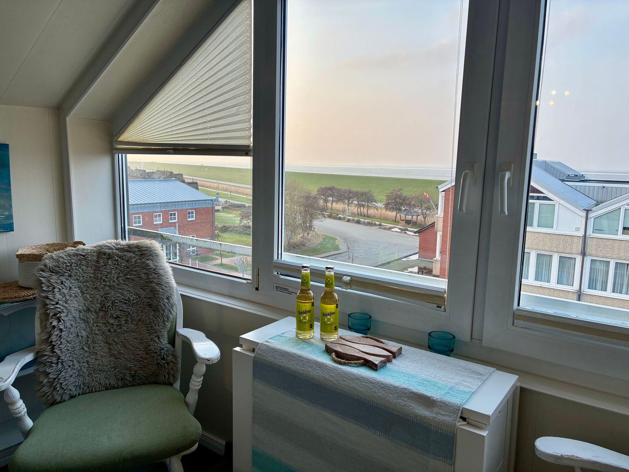Die helle und liebevoll eingerichtete Wohnung greift den Charakter der nordfriesischen Küstenlandschaft auf und wirkt ruhig und einladend. Viele Fenster sorgen für eine freundliche Atmosphäre und lassen viel Tageslicht in die Räume. Eine ruhige Essecke an der Fensterfront bietet einen angenehmen Platz, um den Blick nach draußen schweifen zu lassen.