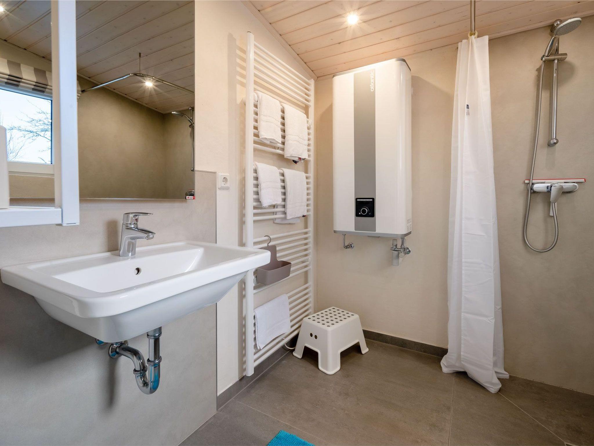 Das Schlafzimmer verfügt über ein Doppelbett (180x200cm) und ein weiteres Schlafzimmer mit ausziehbarem Doppelbett (160x200cm) sorgen für angenehmen Schlafkomfort für bis 4 Personen. Ein schönes Duschbad mit ebenerdiger Dusche, Fön, hängendem WC und beheiztem Handtuchwärmer bieten modernes Urlaubswohngefühl. Ein eigener PKW-Stellplatz, der mit dem Namen des Hauses gekenzzeichnet ist und Waschmaschine/Trockner im Gemeinschaftsserviceraum stehen ebenfalls zur Verfügung. Fahrräder können geschützt abgestellt werden. EIne Erstausstattung an Bettwäsche und Handtüchern kann optional für 20€ pro Person hinzugebucht werden.