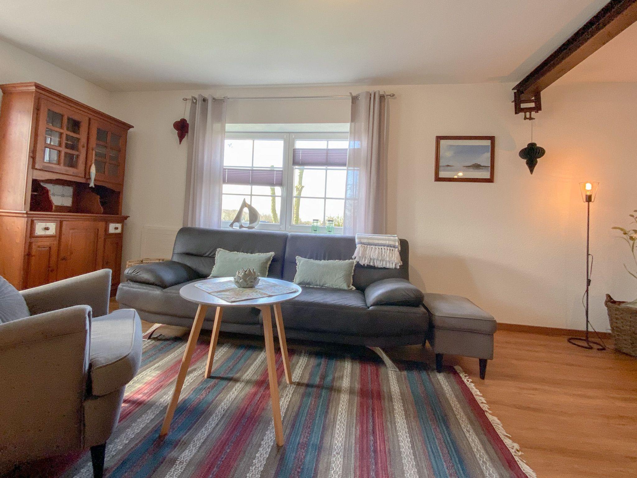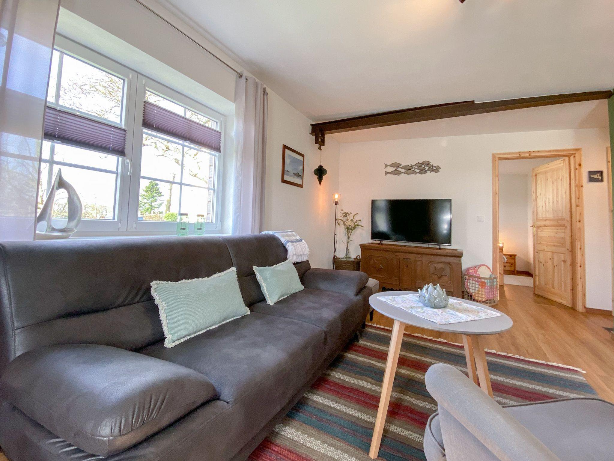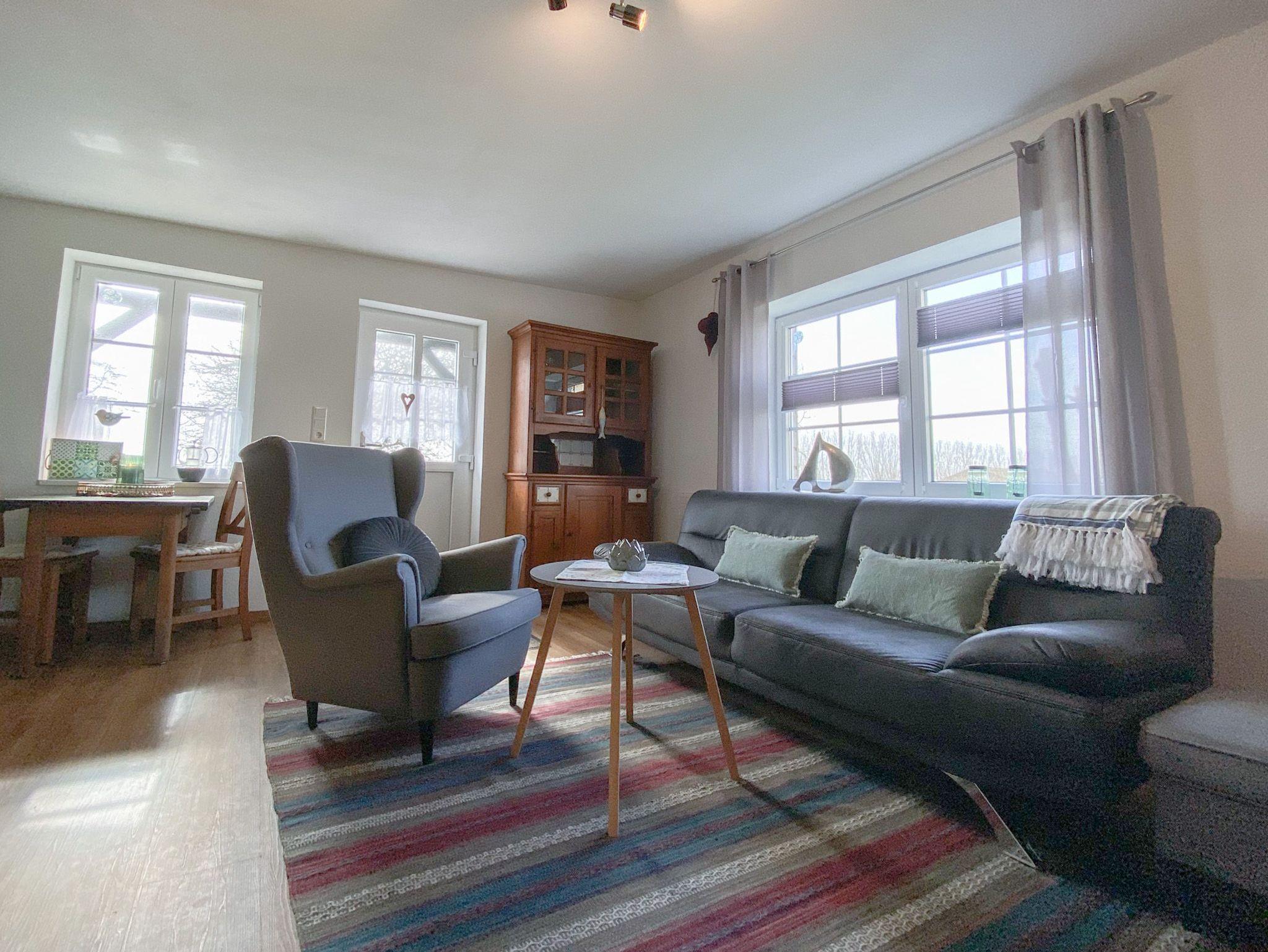 Durch den Eingang betretet ihr das lichtdurchflutete Wohnzimmer mit offener, voll ausgestatteter, moderner Küche im Landhausstil und Essbereich mit Blick auf die Koppeln und den Außendeich.