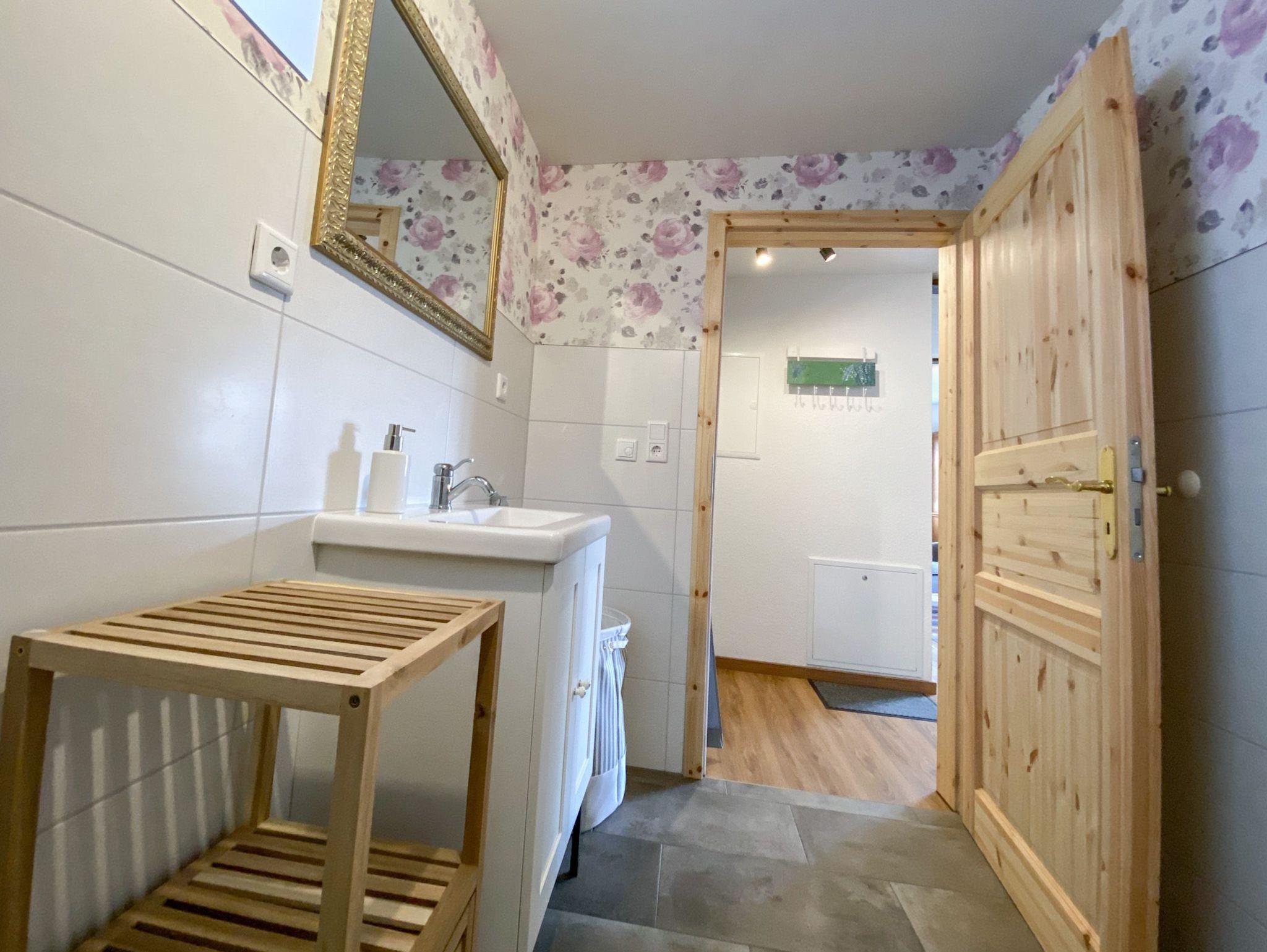 Das ebenfalls neue Badezimmer besticht mit moderner, gepflegter Ausstattung und bietet genügend Platz für alle Habseligkeiten, sowie ein Fenster in Richtung der Terrasse auf der Rückseite des Haupthauses.