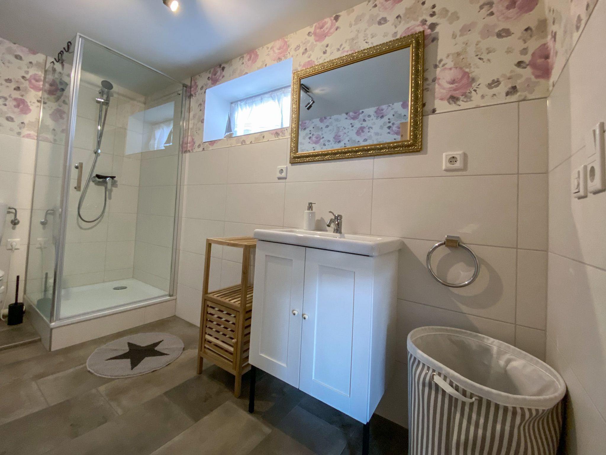 Das Badezimmer lässt mit geräumiger Dusche mit Echtglasfront, WC und Waschtisch mit großzügiger Kommode und Fenster zur Terrasse des Haupthauses keine Wünsche offen. Einen Föhn und Seife stellen wir euch selbstverständlich zur Verfügung.