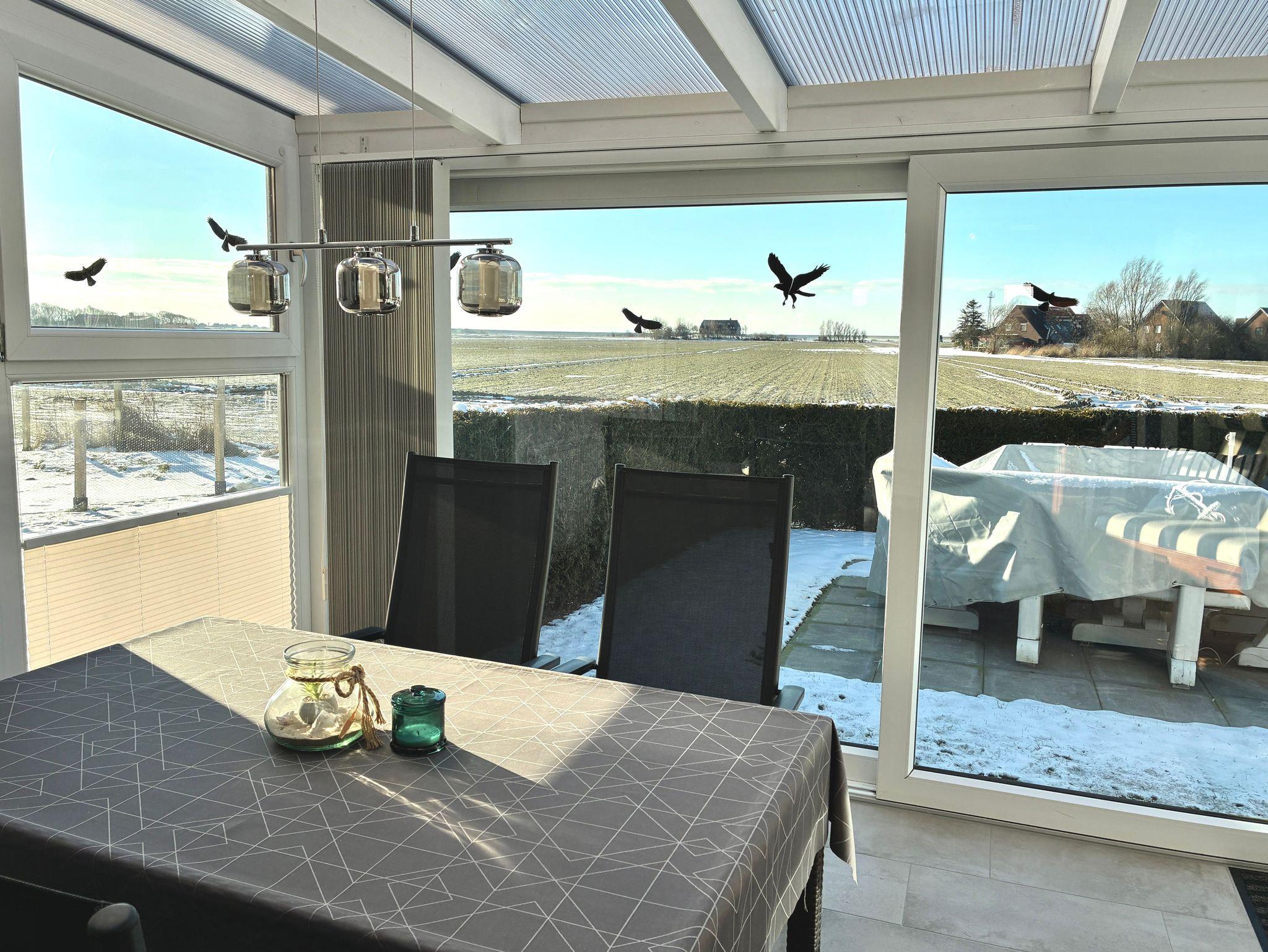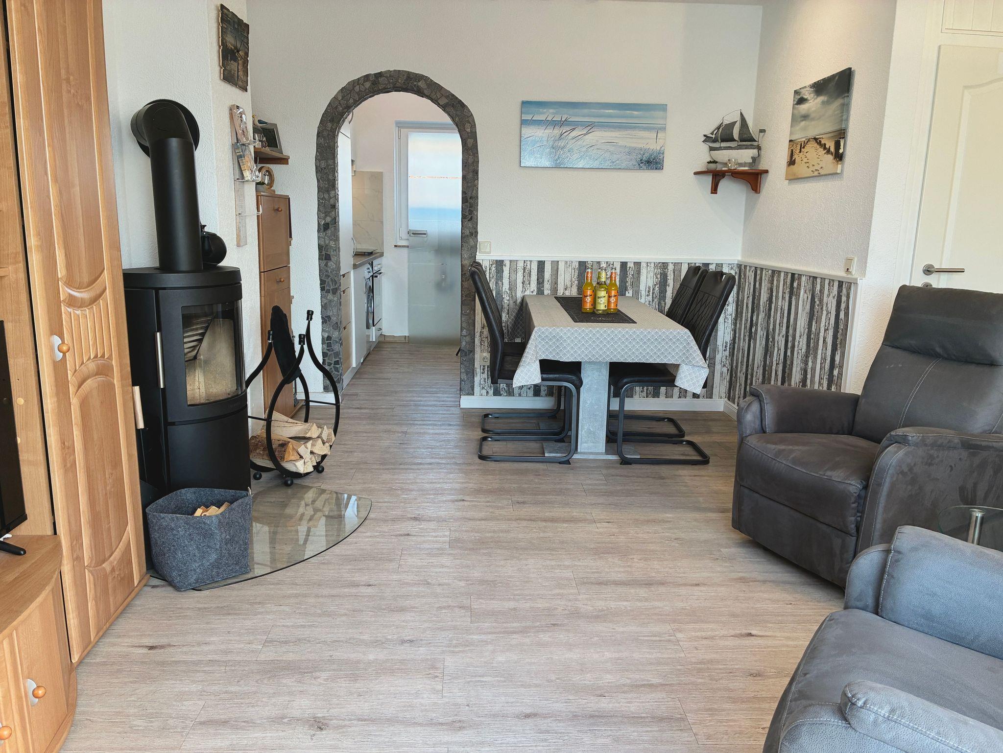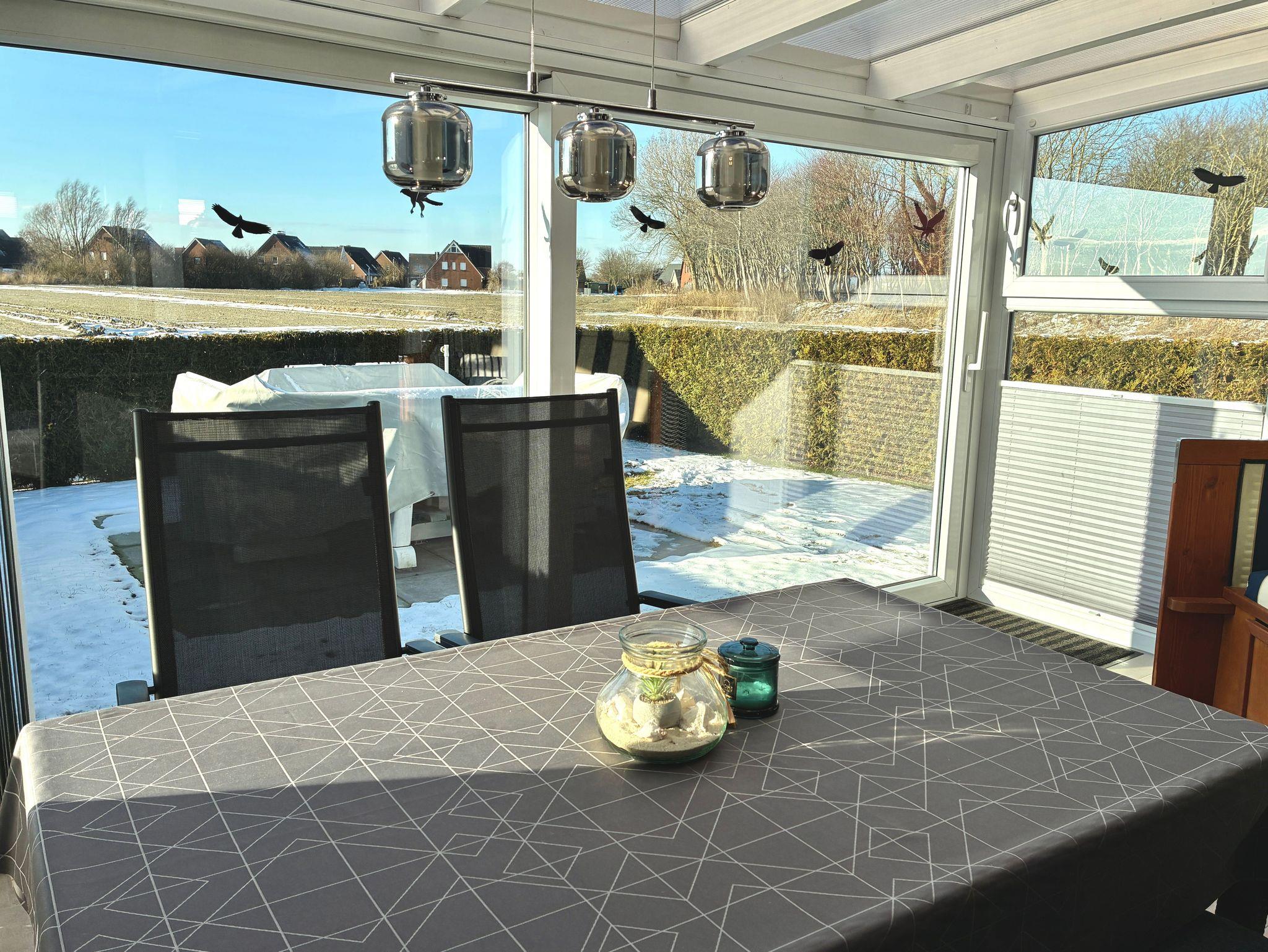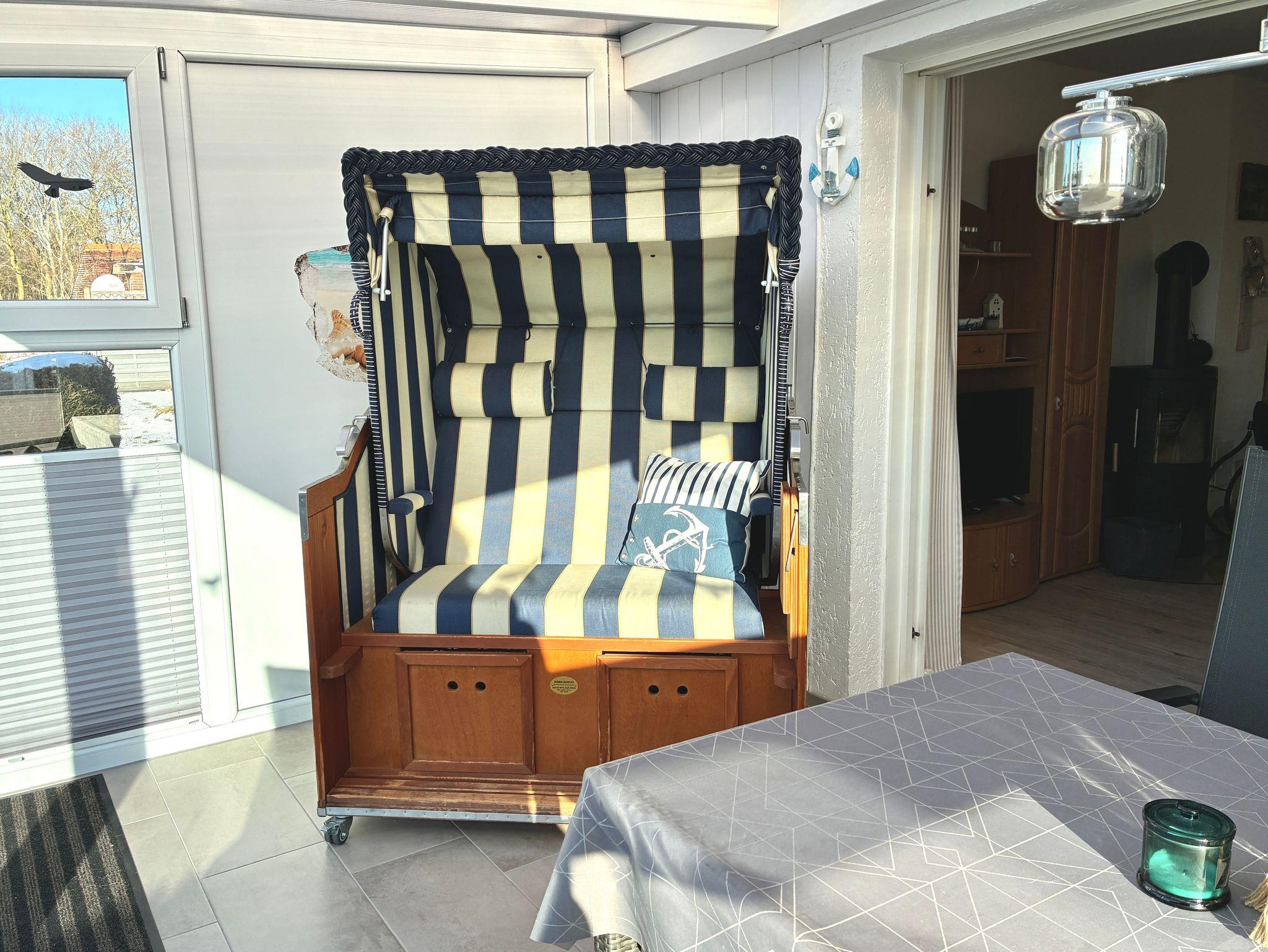 Der Wohnbereich lädt mit einem 2021 erneuerten Kachelofen zu entspannten Stunden ein und bildet das Herz des Hauses. Glastüren und Fenster verbinden den Wohnraum mit dem angrenzenden Wintergarten und lassen viel Tageslicht herein, wodurch ein offenes, freundliches Wohngefühl entsteht. Der Wintergarten ist mit einer Essgarnitur sowie einem Strandkorb ausgestattet und bietet einen schönen Blick auf die Felder Nordstrands, ideal für ruhige Mahlzeiten oder entspannte Momente mit Blick ins Grüne.Zusätzlich sorgen eine Markise am Wintergarten sowie Rollläden an den Fenstern für angenehme Lichtverhältnisse. Eine Terrasse ergänzt den Außenbereich und bietet weiteren Raum zum Verweilen im Freien.