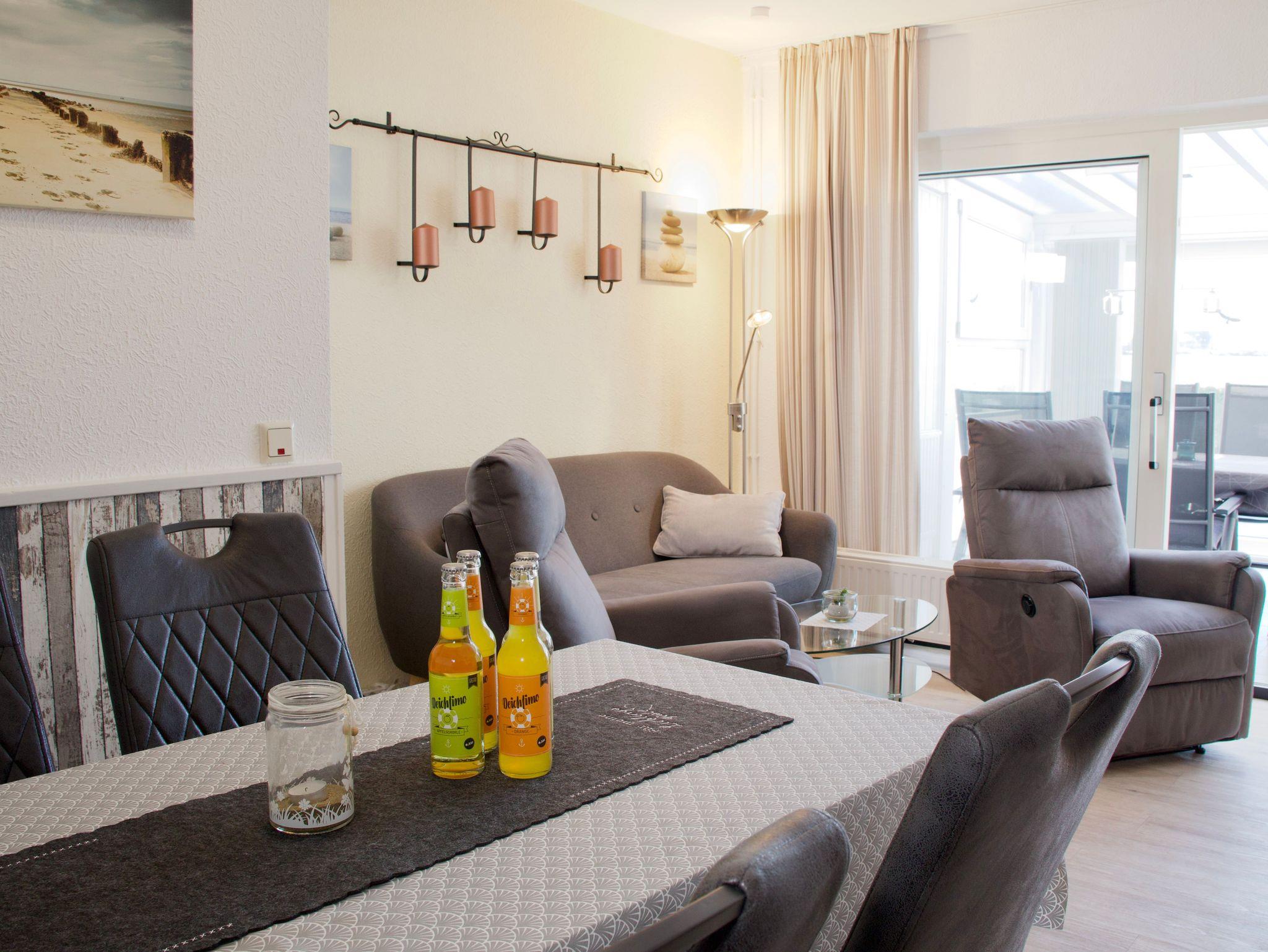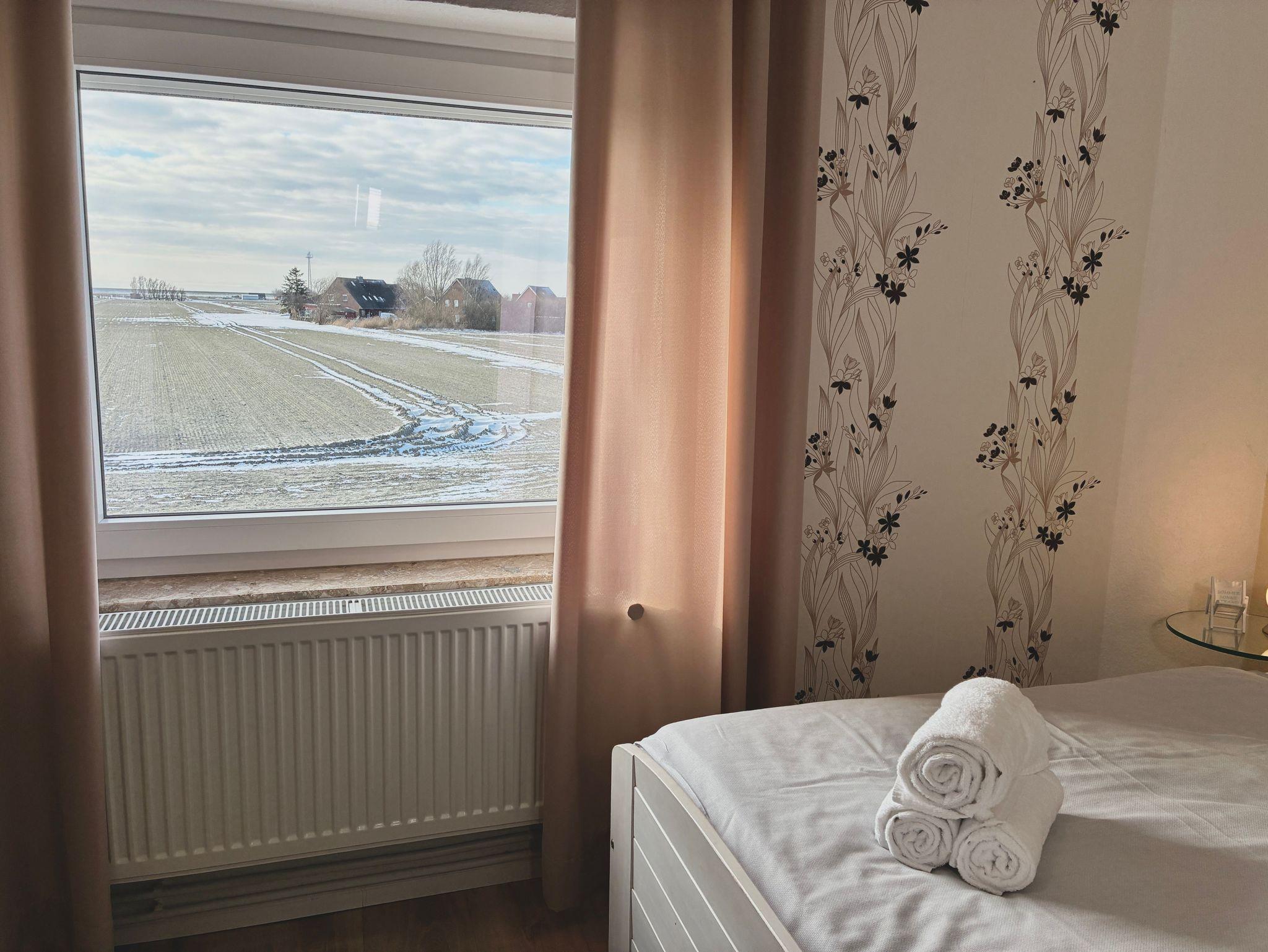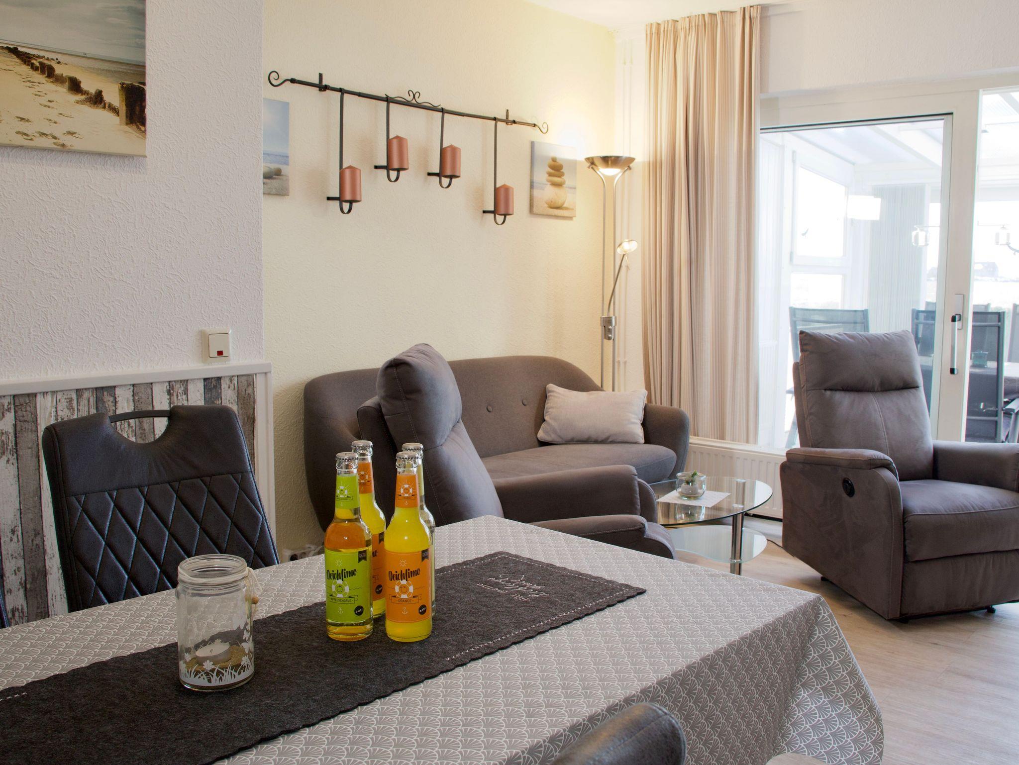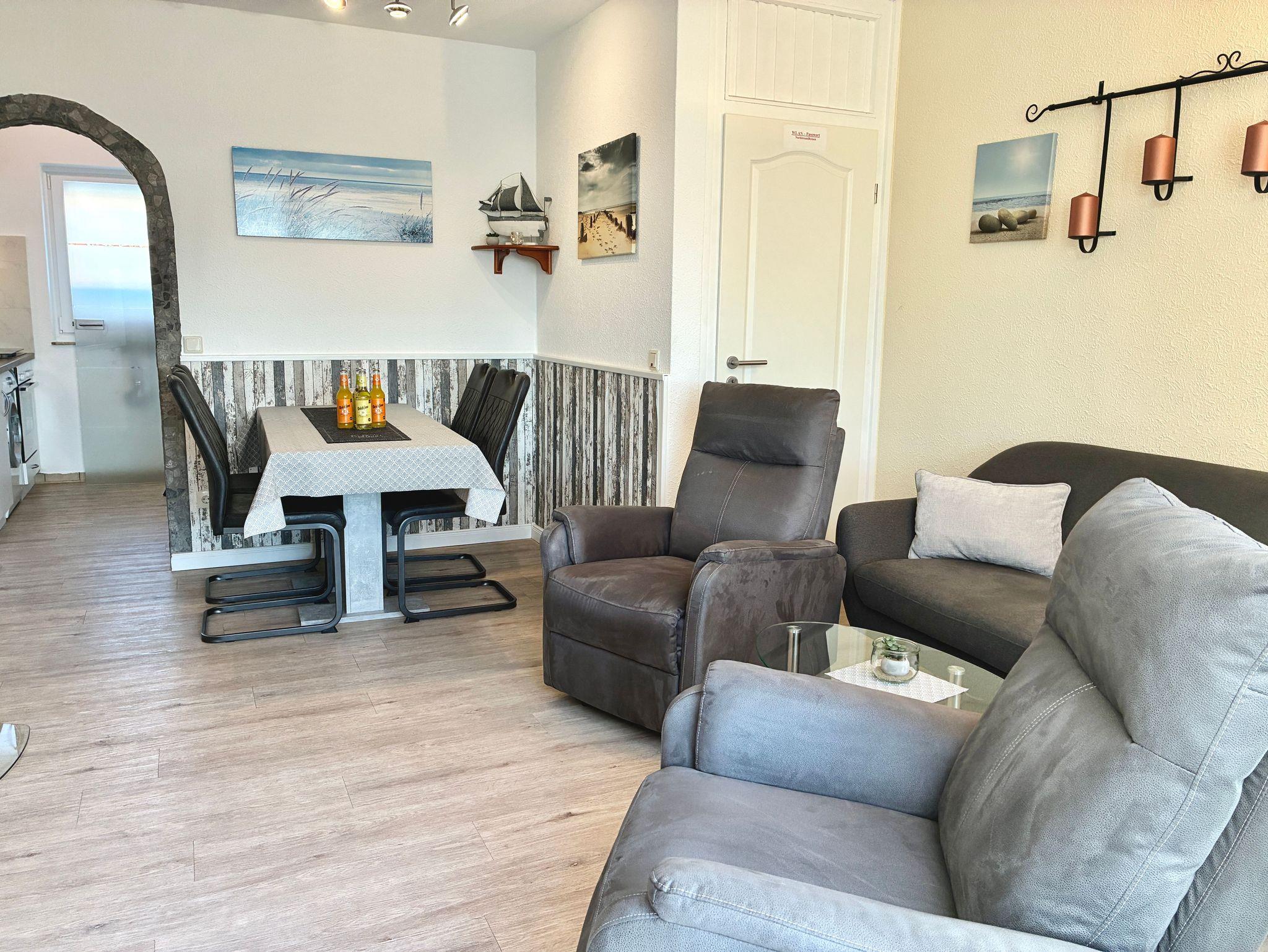Der Wohnbereich lädt mit einem 2021 erneuerten Kachelofen zu entspannten Stunden ein und bildet das Herz des Hauses. Glastüren und Fenster verbinden den Wohnraum mit dem angrenzenden Wintergarten und lassen viel Tageslicht herein, wodurch ein offenes, freundliches Wohngefühl entsteht. Der Wintergarten ist mit einer Essgarnitur sowie einem Strandkorb ausgestattet und bietet einen schönen Blick auf die Felder Nordstrands, ideal für ruhige Mahlzeiten oder entspannte Momente mit Blick ins Grüne.Zusätzlich sorgen eine Markise am Wintergarten sowie Rollläden an den Fenstern für angenehme Lichtverhältnisse. Eine Terrasse ergänzt den Außenbereich und bietet weiteren Raum zum Verweilen im Freien.