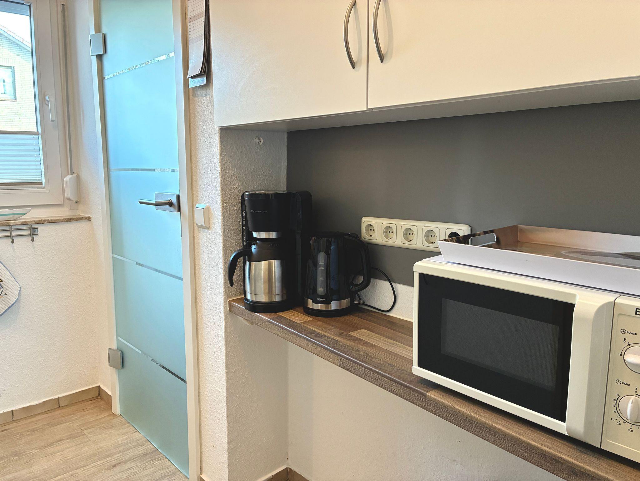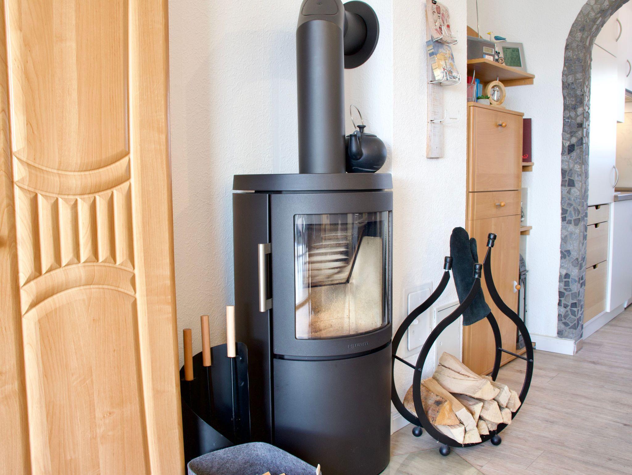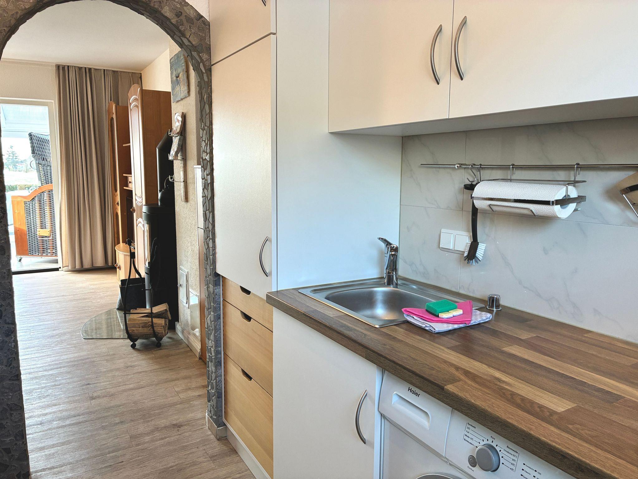 Die helle Küche wurde Anfang 2021 modernisiert und ist mit Holzelementen gestaltet, die sich stimmig in das Gesamtbild einfügen. Über einen charakteristischen Steinbogen ist sie mit dem Wohnzimmer verbunden und verbindet Funktionalität mit einem wohnlichen Übergang zwischen Kochen und Wohnen. Eine Spülmaschine, eine Gefriermöglichkeit sowie eine Kaffeemaschine stehen für Sie bereit.