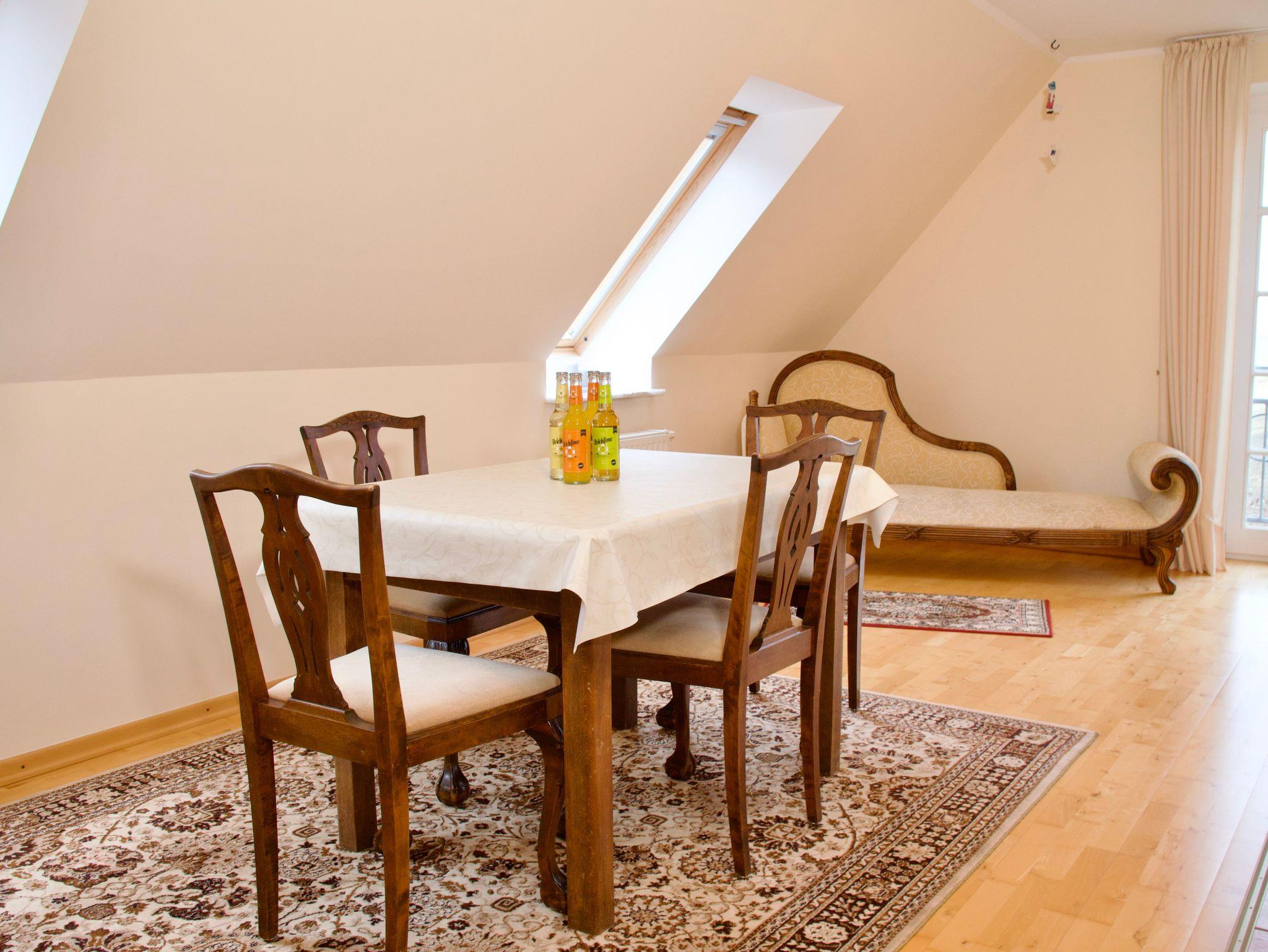 Herzstück der Wohnung ist das große Wohnzimmer. Eine gemütliche Sitzecke, der Kamin sowie der Esstisch bilden einen offenen Wohnbereich mit viel Platz für gemeinsame Zeit. Der Blick aus dem Wohnzimmer reicht über die weite Landschaft und unterstreicht das Gefühl von Freiheit und Entschleunigung. Besonders an kühleren Tagen sorgt der Kamin für eine behagliche Atmosphäre.