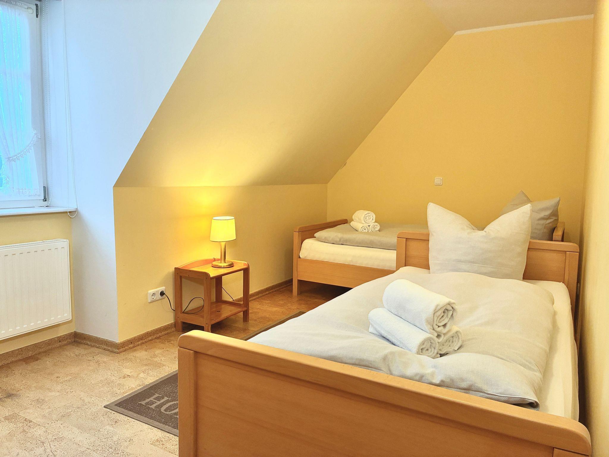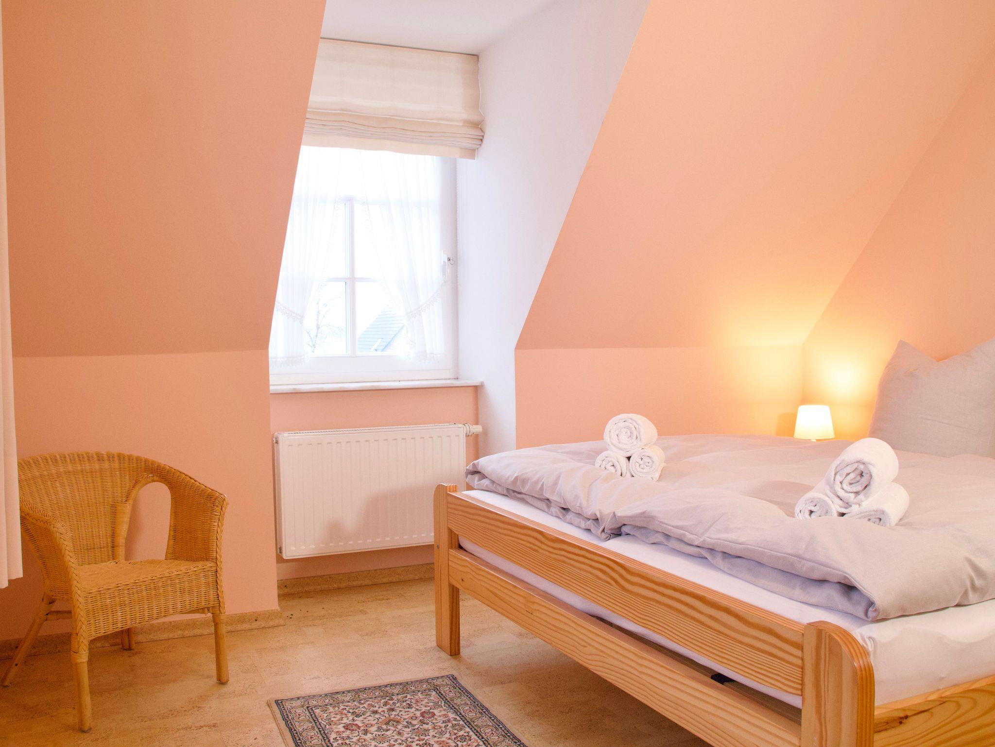 Die Wohnung verfügt über zwei Schlafzimmer, eines mit einem Doppelbett, das andere mit zwei Einzelbetten. Beide Räume sind klar gestaltet, hell gehalten und in warmen Tönen eingerichtet. Sie strahlen Ruhe aus und bieten angenehme Rückzugsorte für erholsame Nächte.