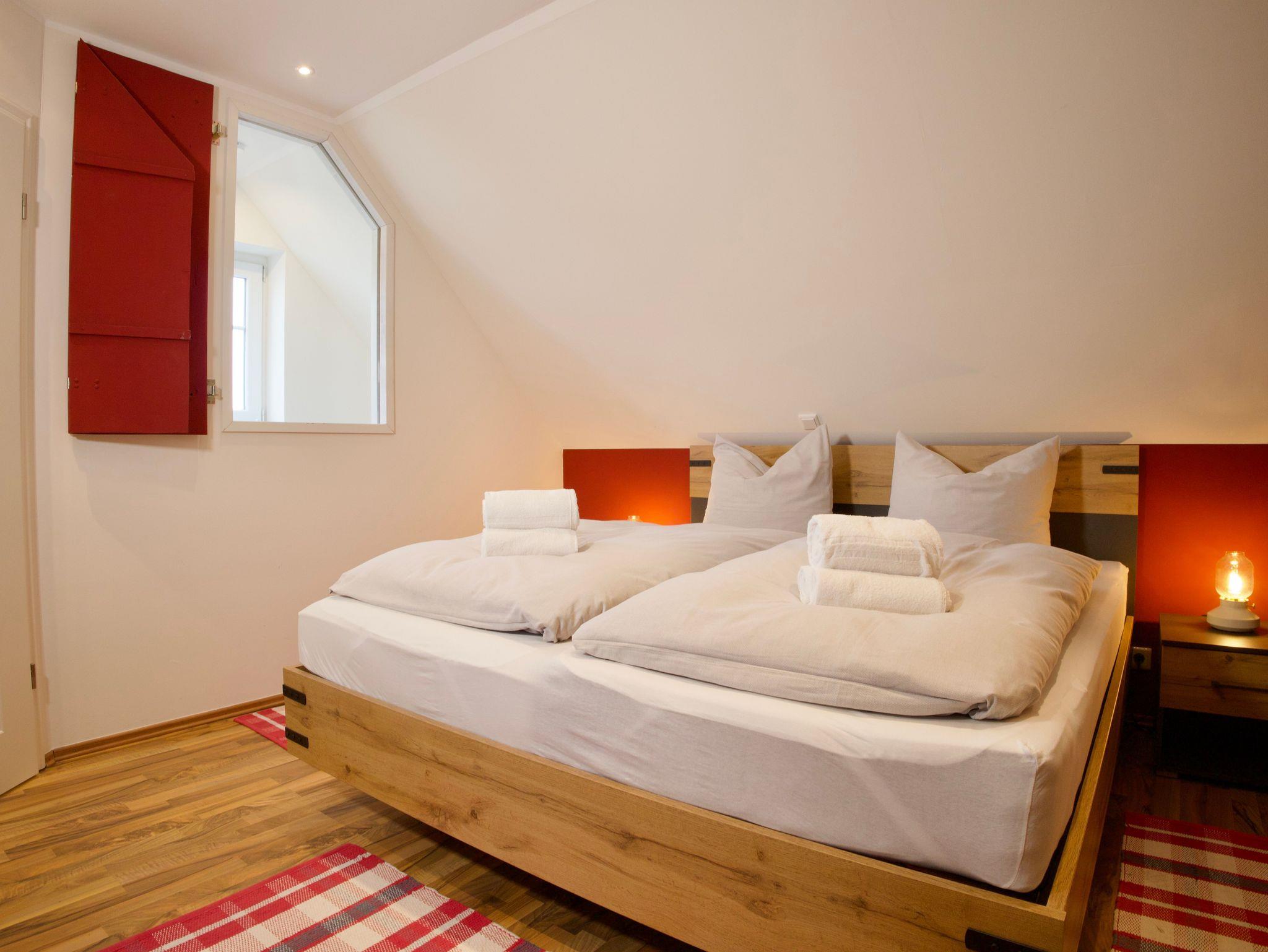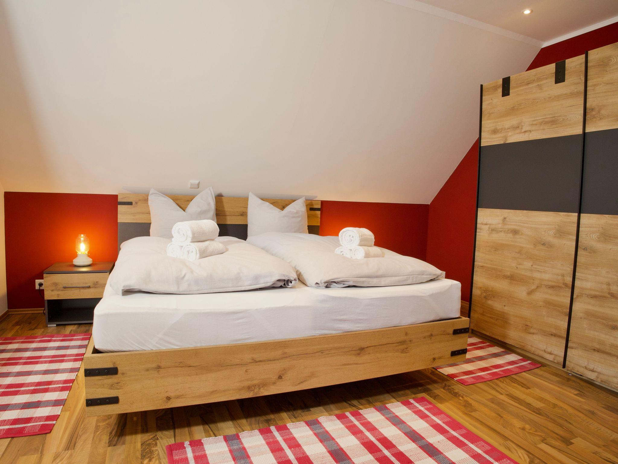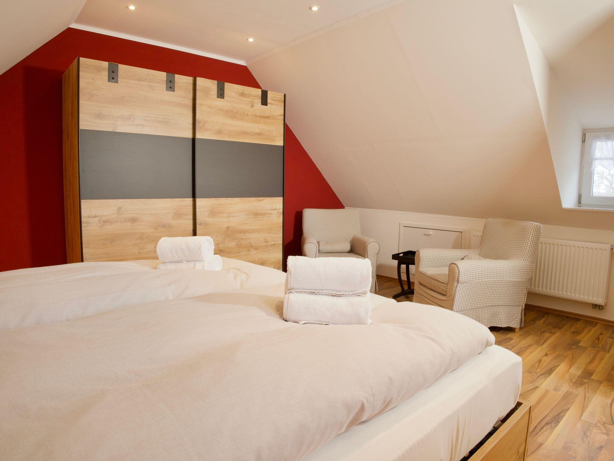 Im Obergeschoss erwartet Sie ein weiteres großzügiges Schlafzimmer mit einem Doppelbett in der Größe 180 Zentimeter und einer kleinen Rückzugsecke, ideal für ruhige Momente für sich.