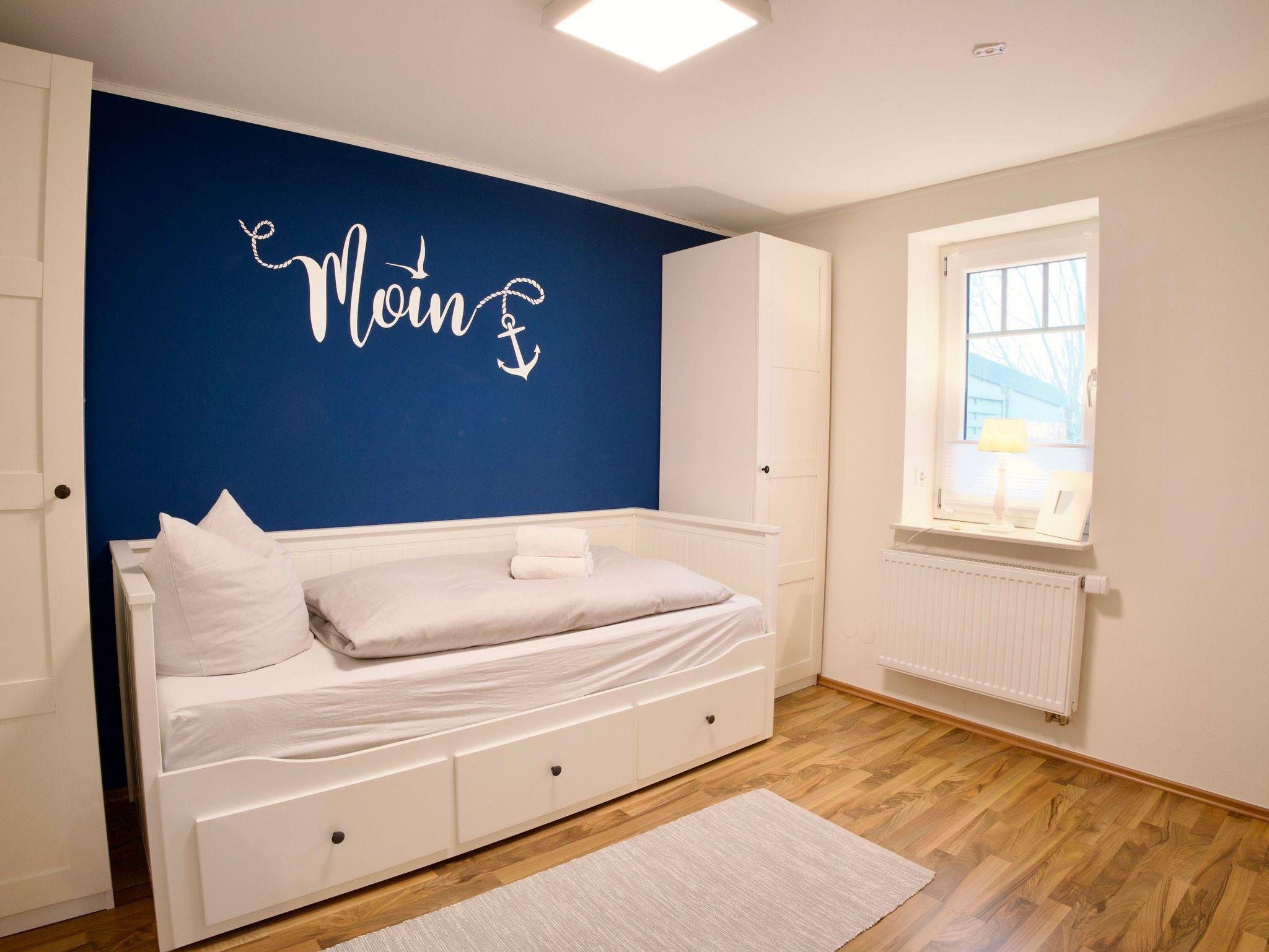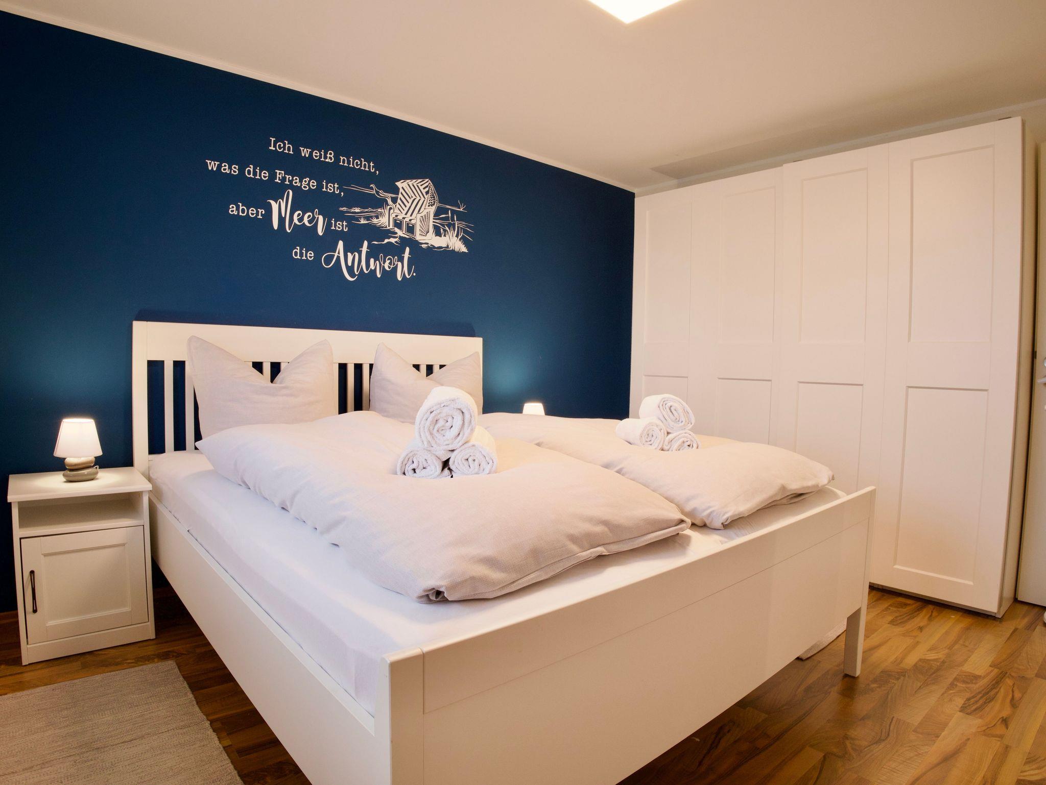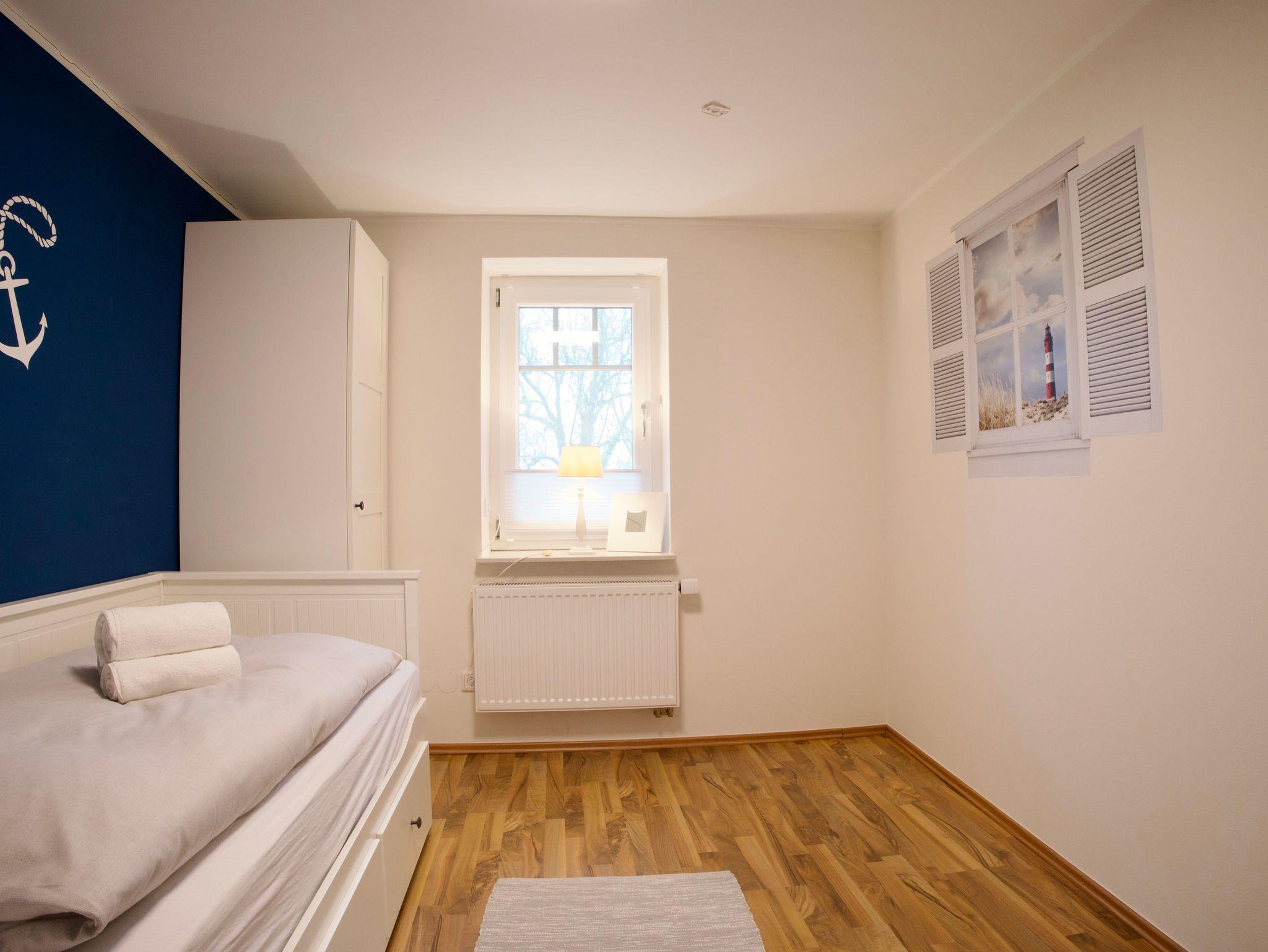 Ebenfalls im Erdgeschoss befinden sich zwei Schlafzimmer. Eines ist mit einem französischen Bett in der Größe 160 Zentimeter ausgestattet, das zweite verfügt über eine ausziehbare Schlafcouch. Ein hell und ruhig gestaltetes Duschbad ergänzt das Raumangebot auf dieser Ebene.