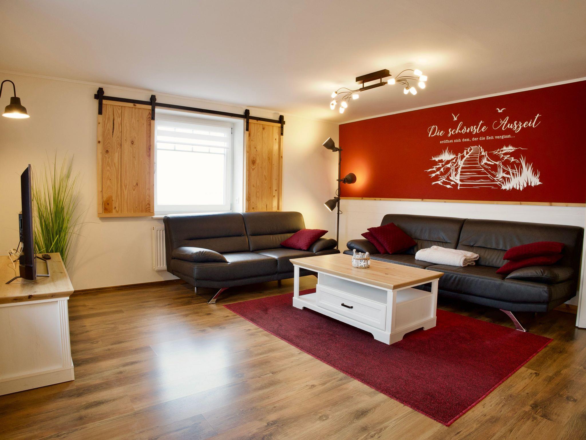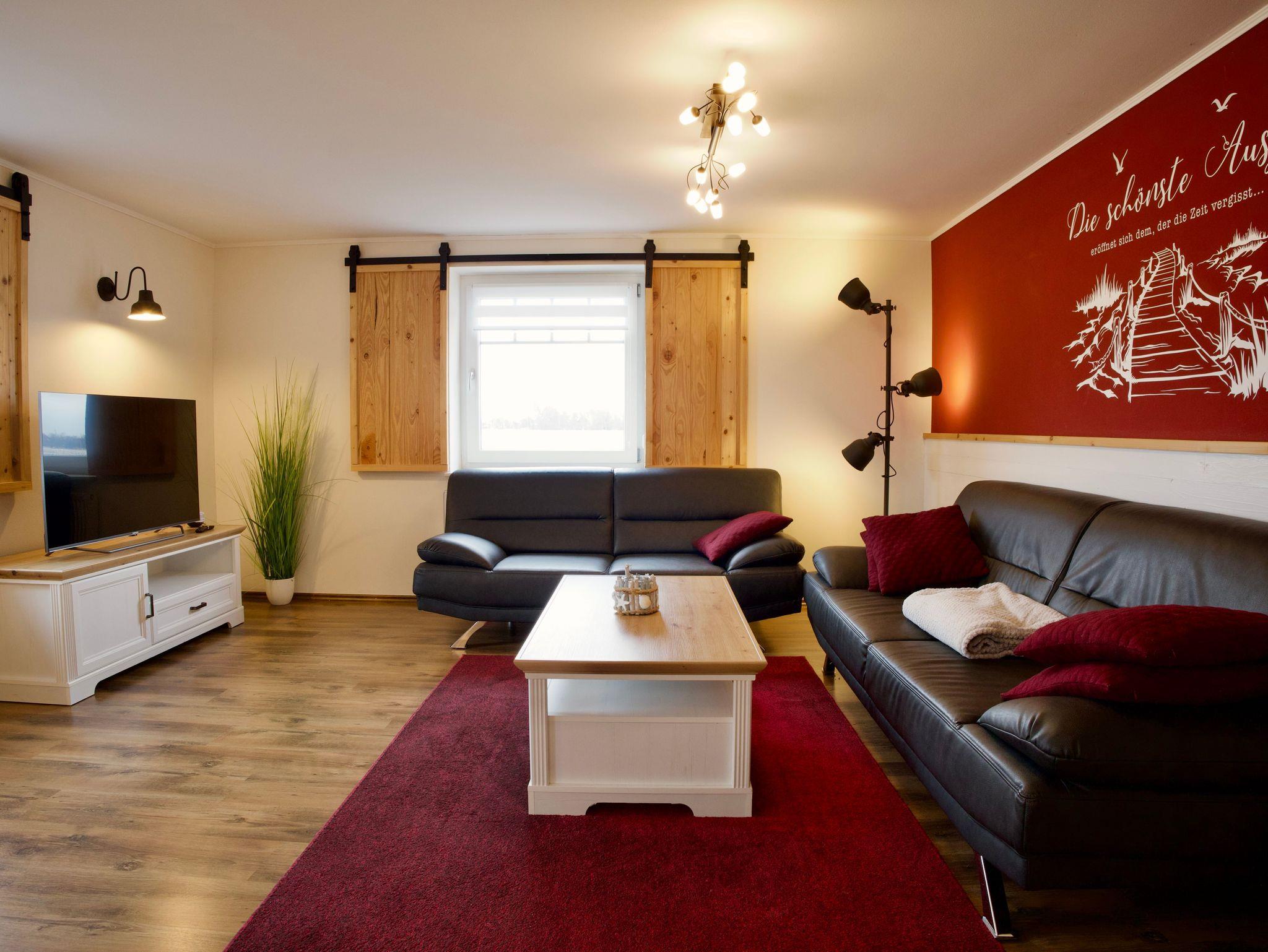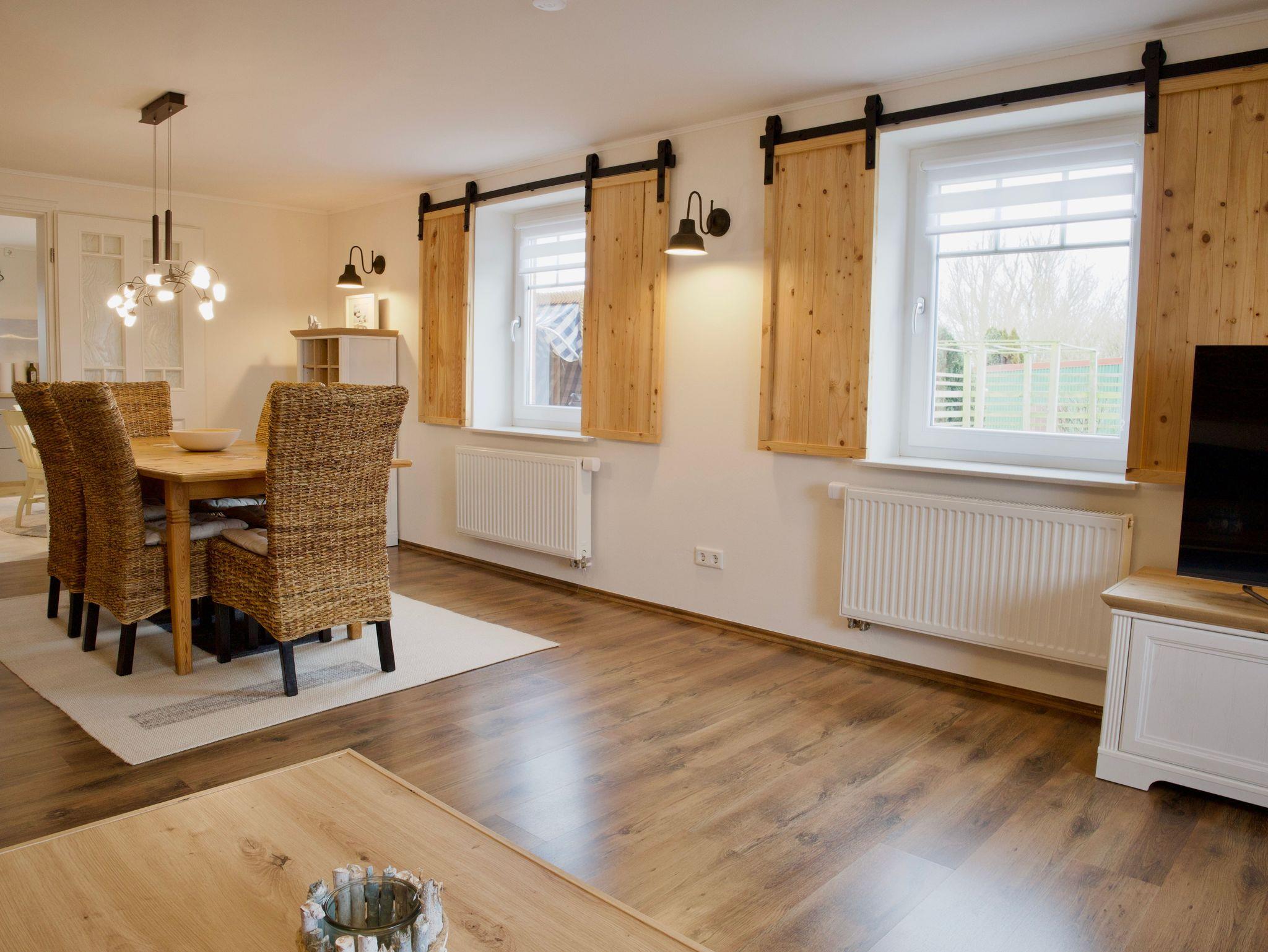 Im Erdgeschoss empfängt Sie der großzügige Wohn- und Essbereich, der durch große Fensterflächen lichtdurchflutet ist. Warme Farbtöne, weiche Holzakzente, sowie klassische Innenfensterläden aus Holz verleihen dem Raum eine ruhige, einladende Atmosphäre. Der Wohnbereich ist mit einem Smart-TV ausgestattet und bietet viel Platz für gemeinsame Zeit.