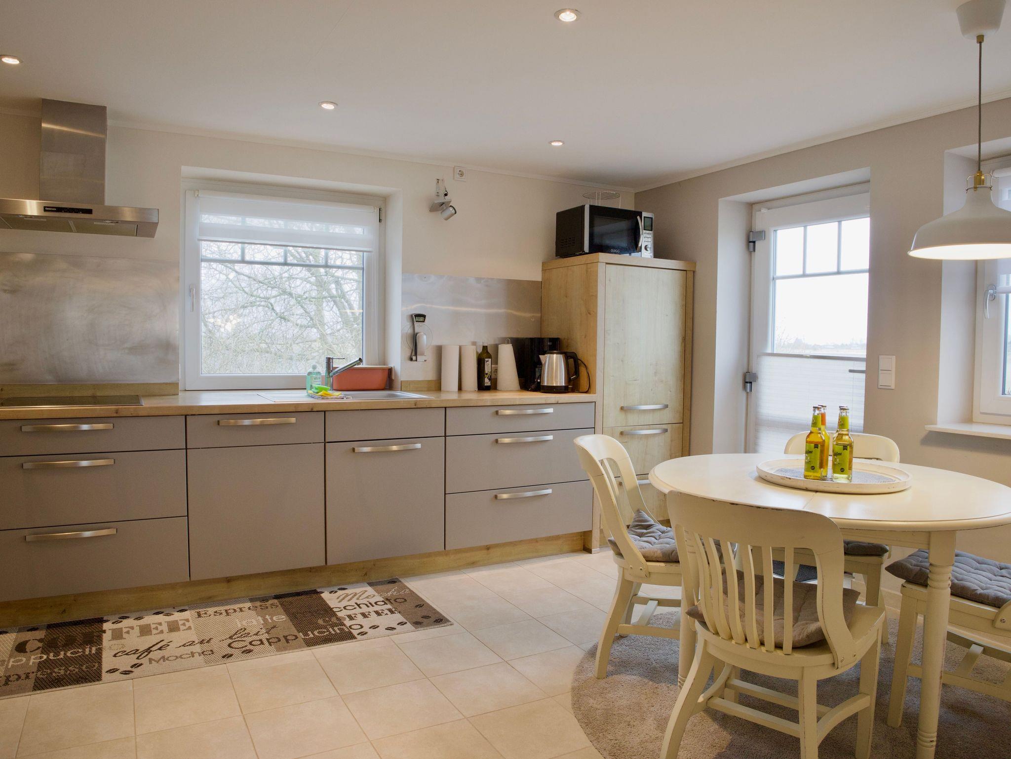Über elegante Flügeltüren ist der Wohnbereich mit der hellen, modernen Küche verbunden. Je nach Wunsch lässt sich dieser Bereich offen nutzen oder räumlich trennen. Die Küche ist klar gestaltet und lässt kaum Wünsche offen. Eine Spülmaschine, eine Kaffeemaschine, sowie eine Gefriermöglichkeit gehören zur Ausstattung und bieten beste Voraussetzungen für gemeinsame Mahlzeiten in der eigenen Essecke. Eine Waschmaschine ist ebenfalls im Haus vorhanden.