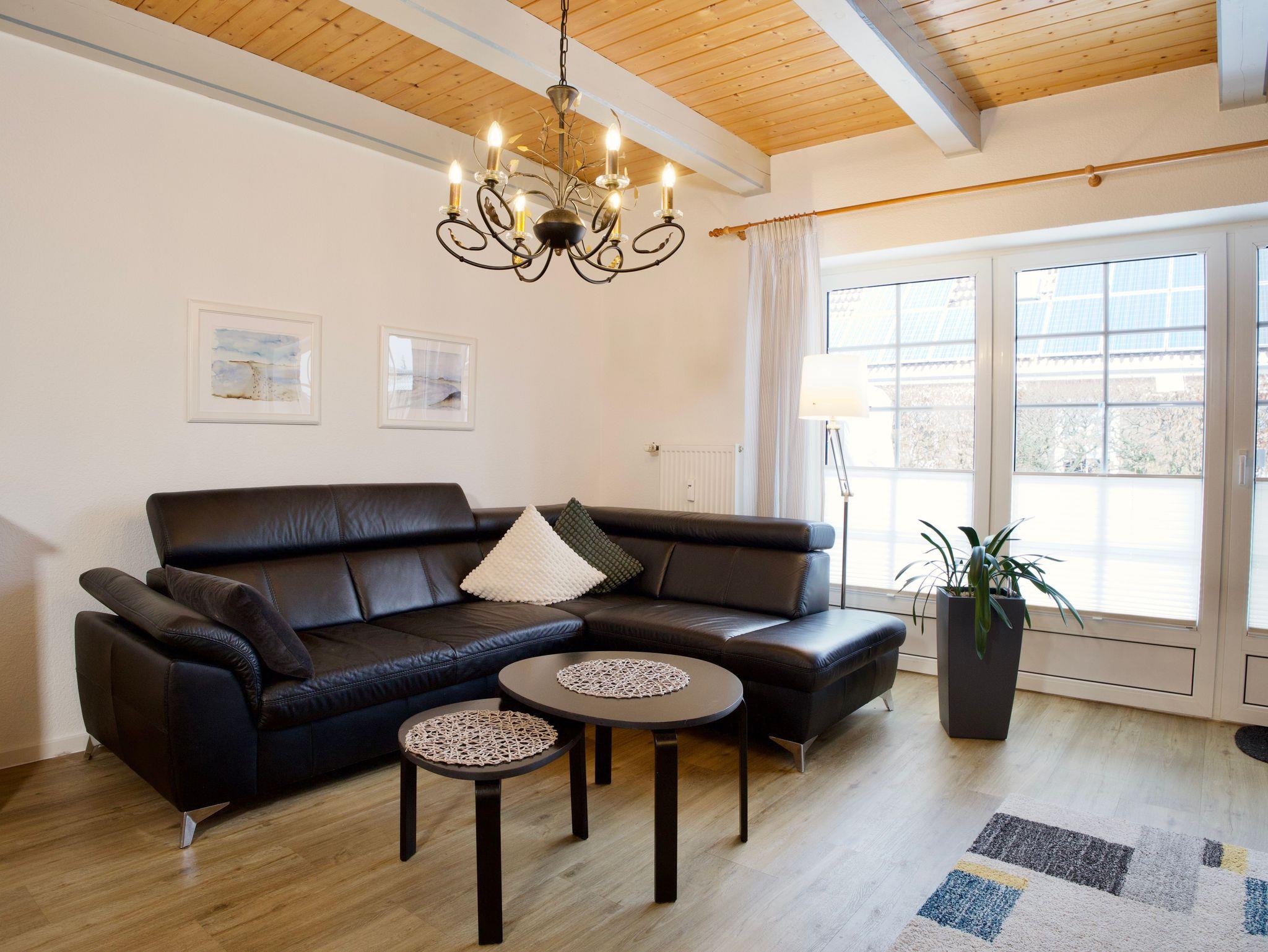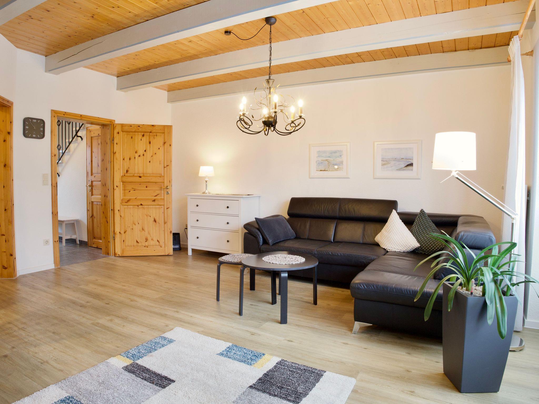 Im Erdgeschoss befindet sich der offen gestaltete Wohn- und Essbereich. Große Fenster sorgen für viel Tageslicht und schaffen eine angenehme, offene Atmosphäre. Die sichtbare Holzbalkendecke verleiht dem Raum zusätzlichen Charakter und unterstreicht den nordischen Stil. Der Wohnbereich ist gemütlich eingerichtet und mit einem Smart-TV ausgestattet. Von hier aus gelangen Sie direkt auf die möblierte Außenterrasse, die sich ideal für Mahlzeiten im Freien oder ruhige Stunden an der frischen Luft eignet. Ein Strandkorb ergänzt den Außenbereich.