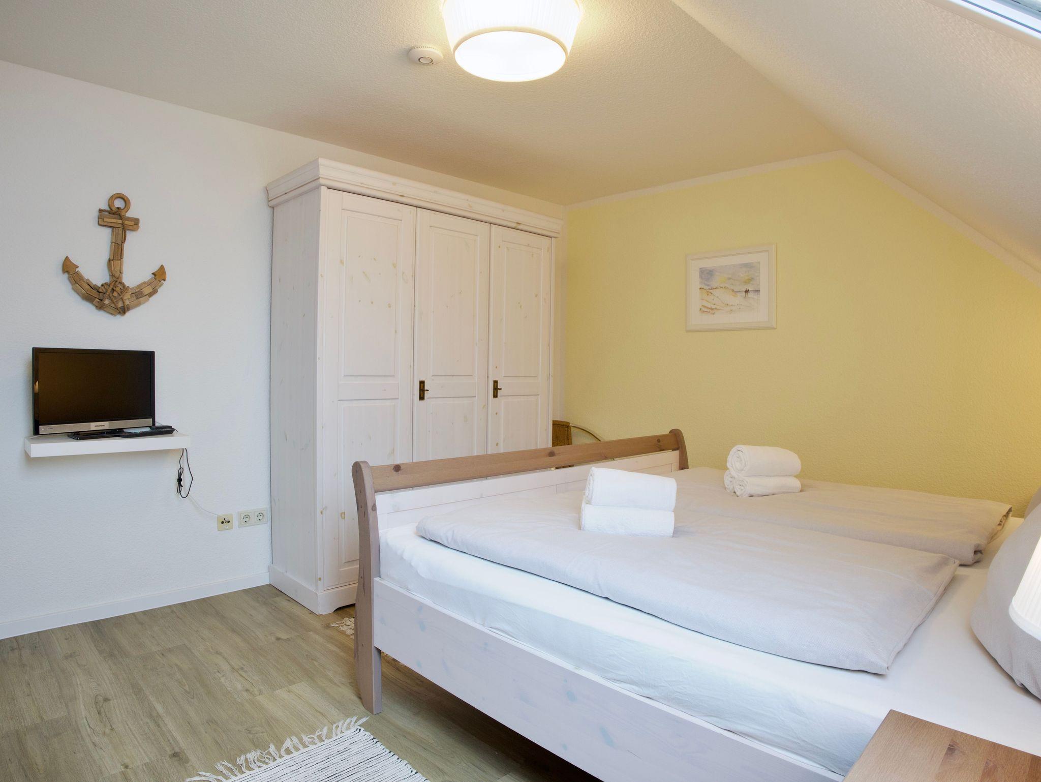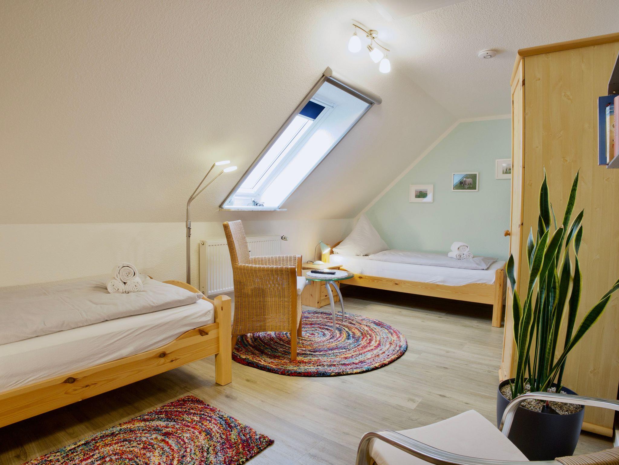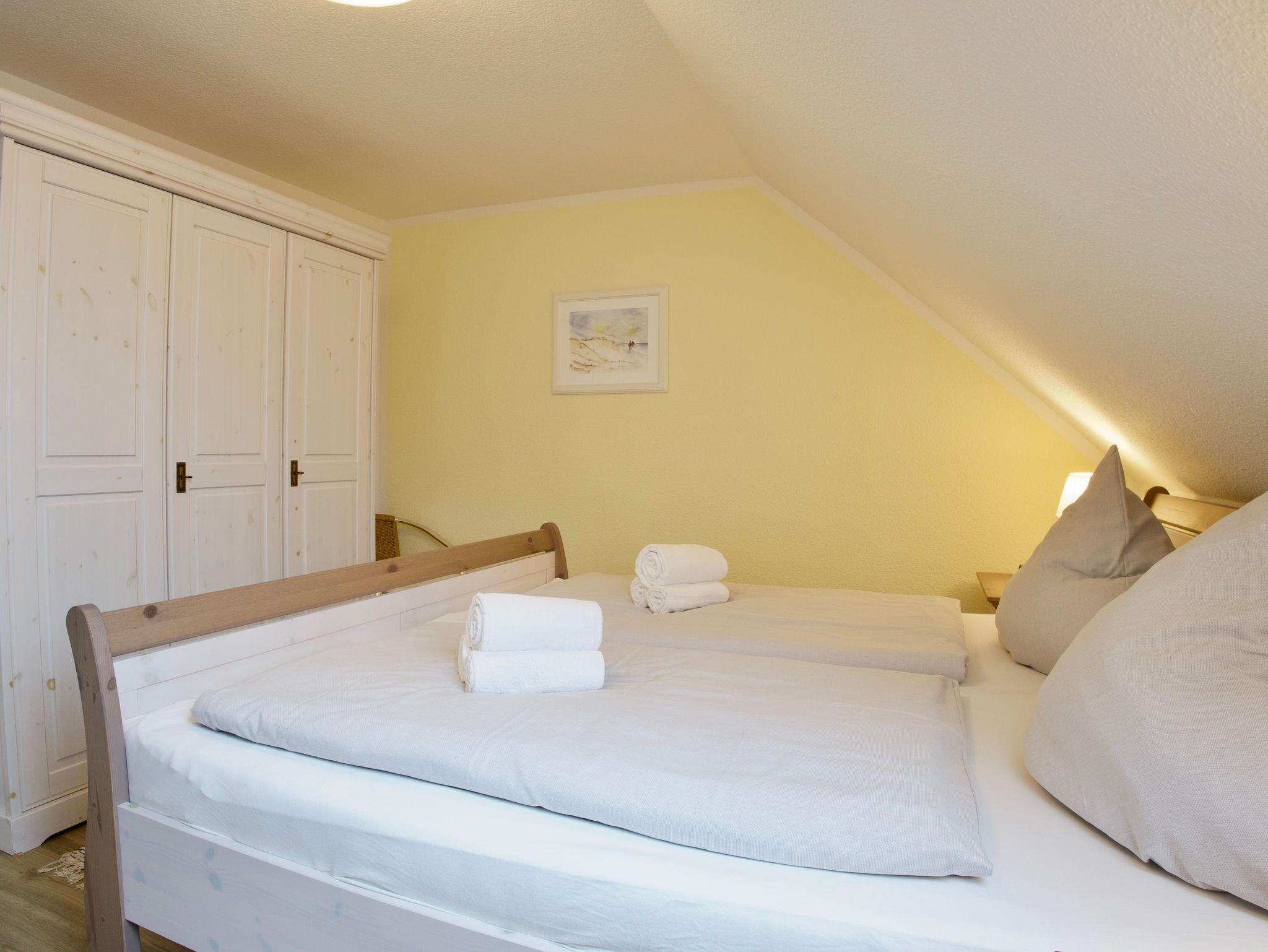 Im Obergeschoss erwarten Sie zwei Schlafzimmer. Eines ist mit einem Doppelbett eingerichtet, das zweite mit zwei Einzelbetten. Beide Räume sind hell und ruhig gehalten und bieten angenehme Rückzugsorte nach einem erlebnisreichen Tag auf der Insel.