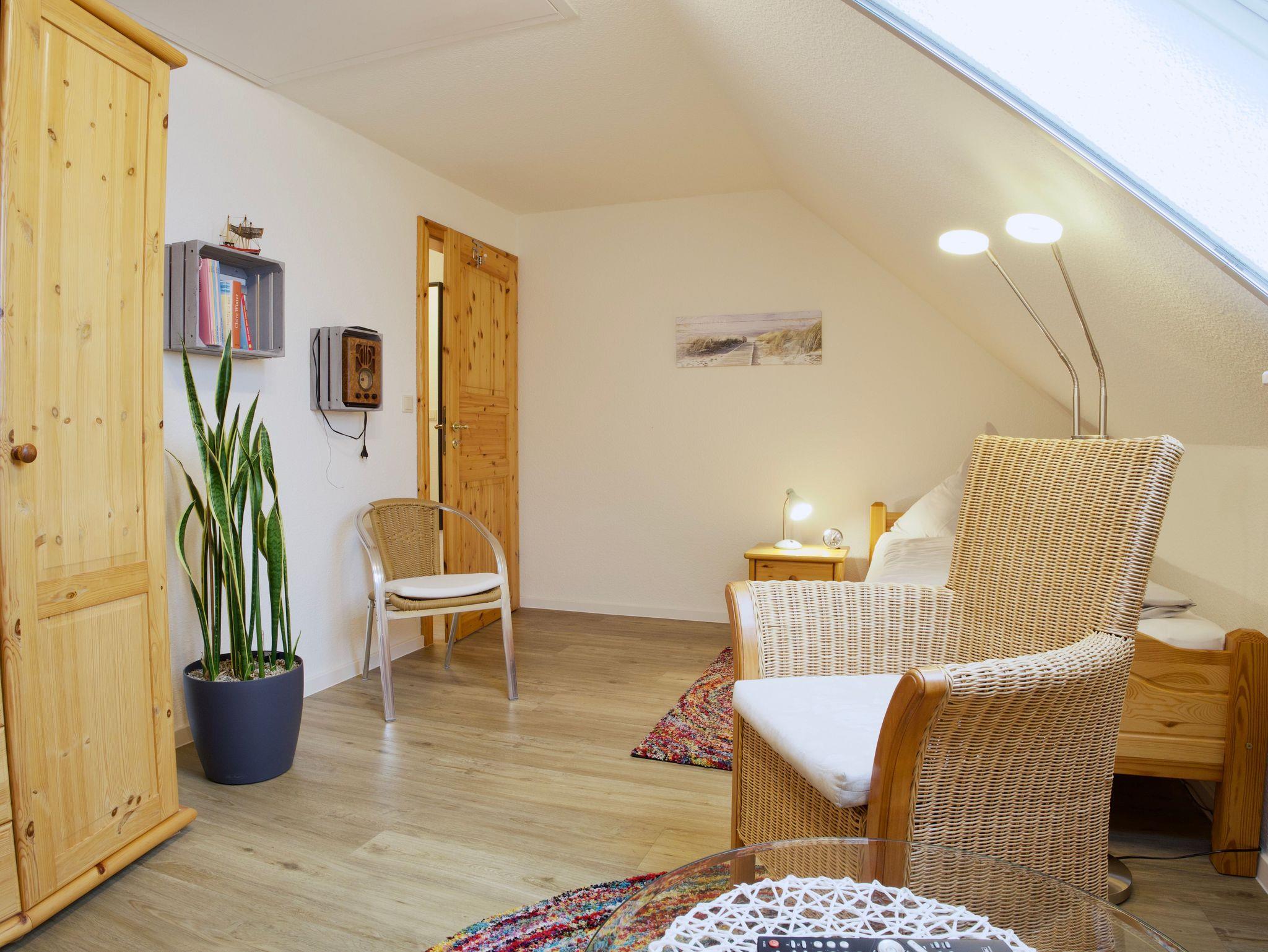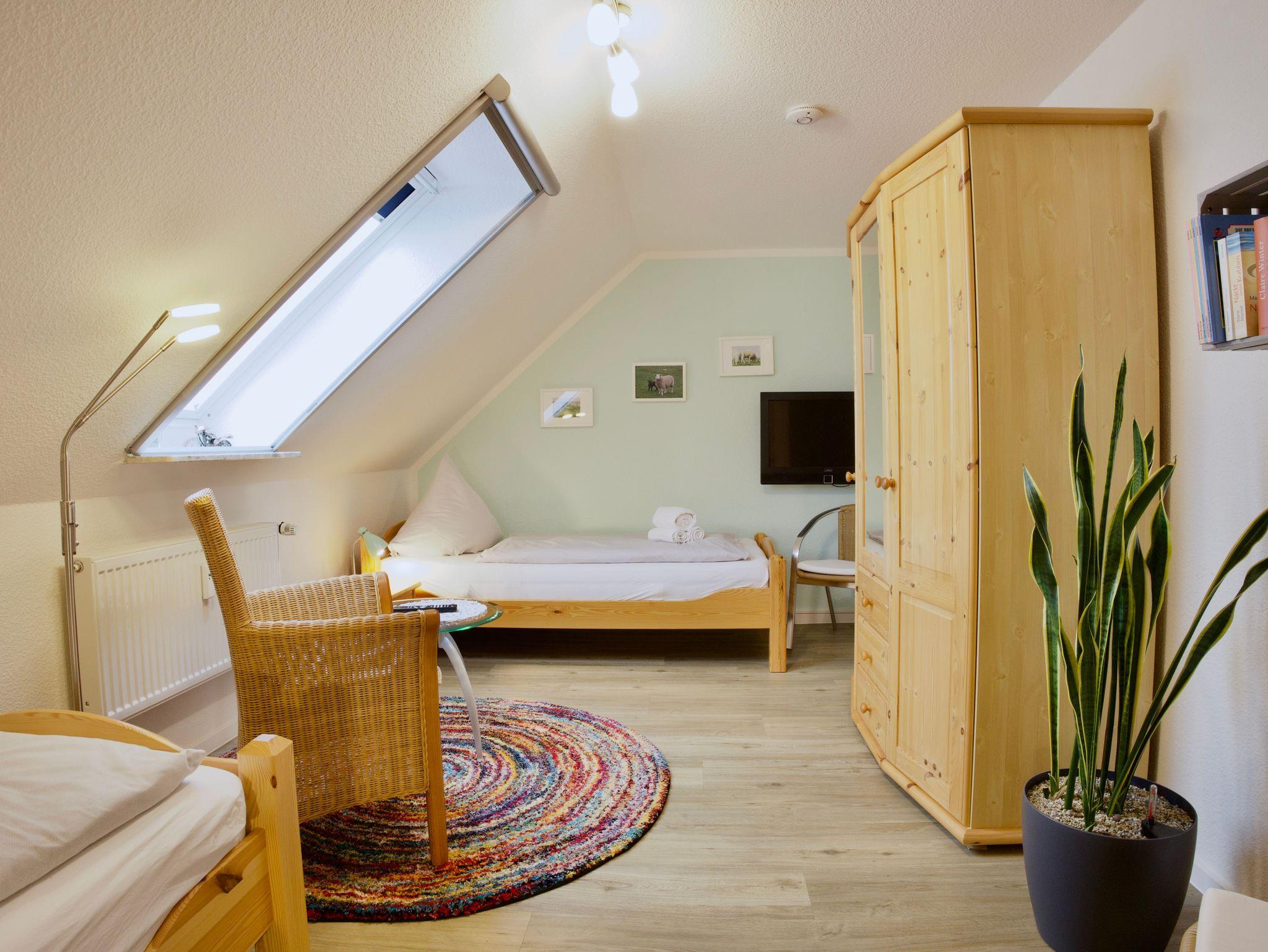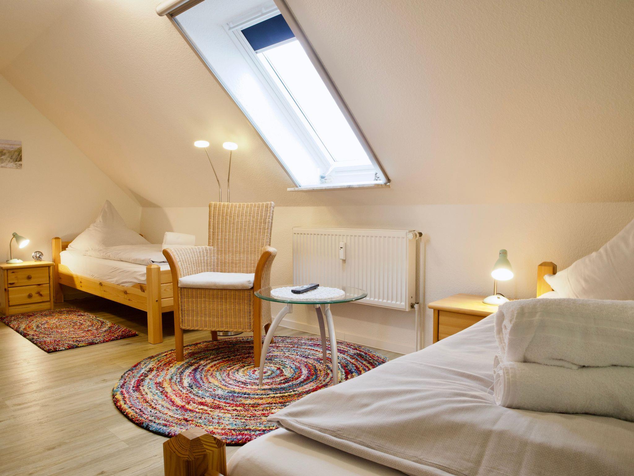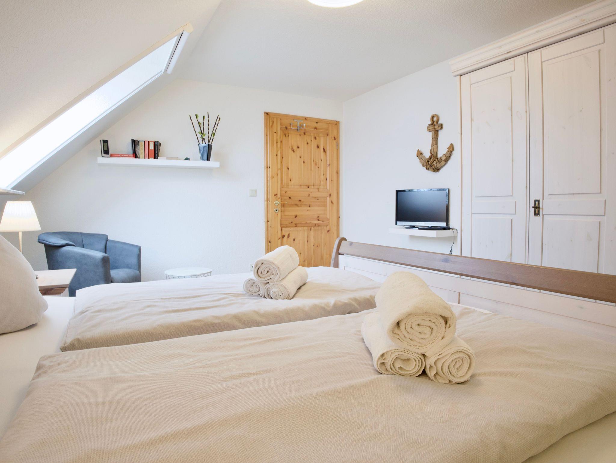 Im Obergeschoss erwarten Sie zwei Schlafzimmer. Eines ist mit einem Doppelbett eingerichtet, das zweite mit zwei Einzelbetten. Beide Räume sind hell und ruhig gehalten und bieten angenehme Rückzugsorte nach einem erlebnisreichen Tag auf der Insel.