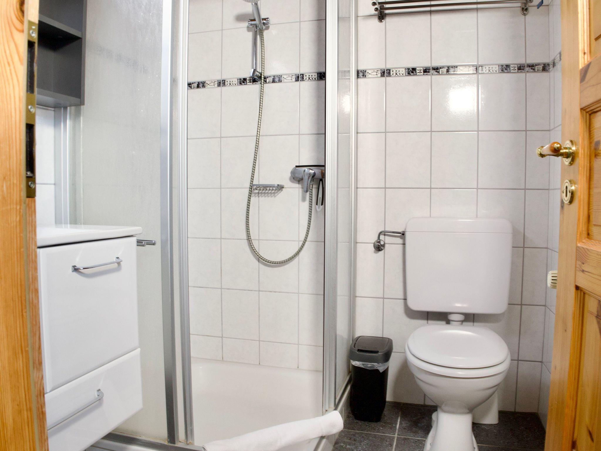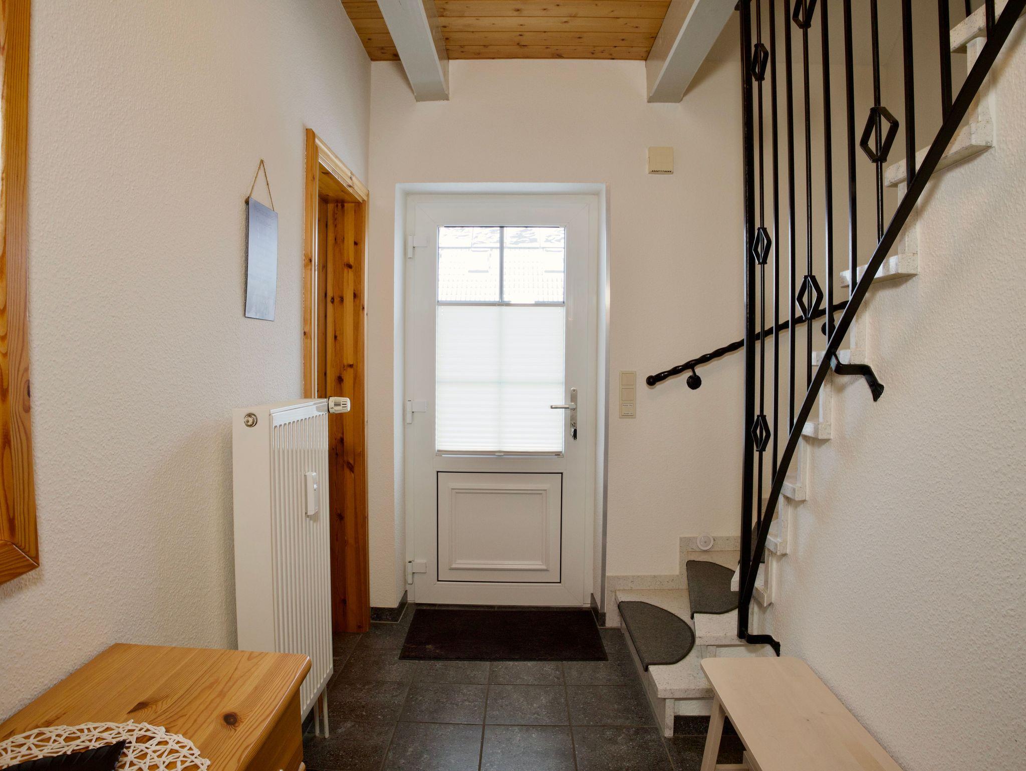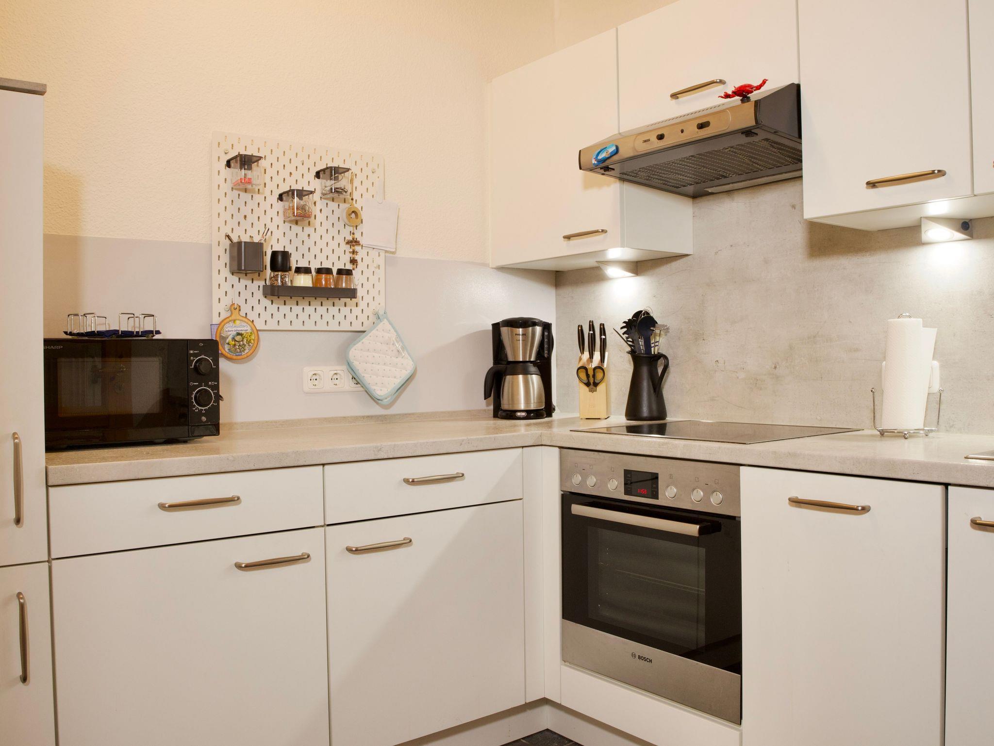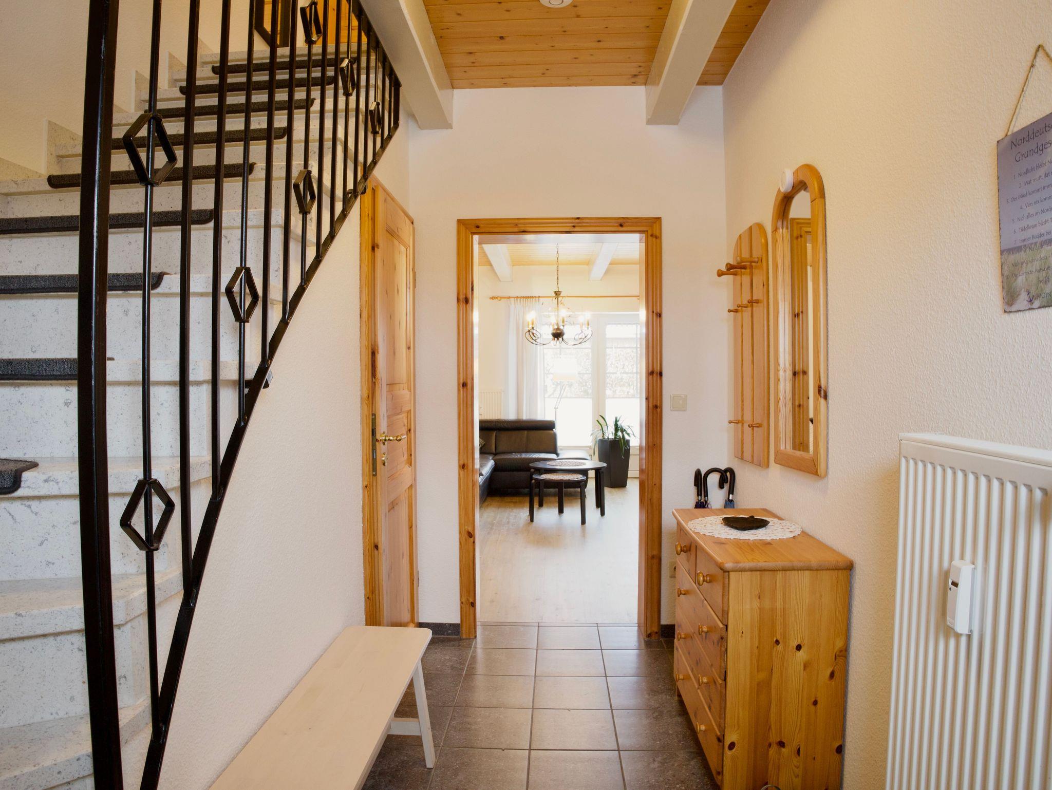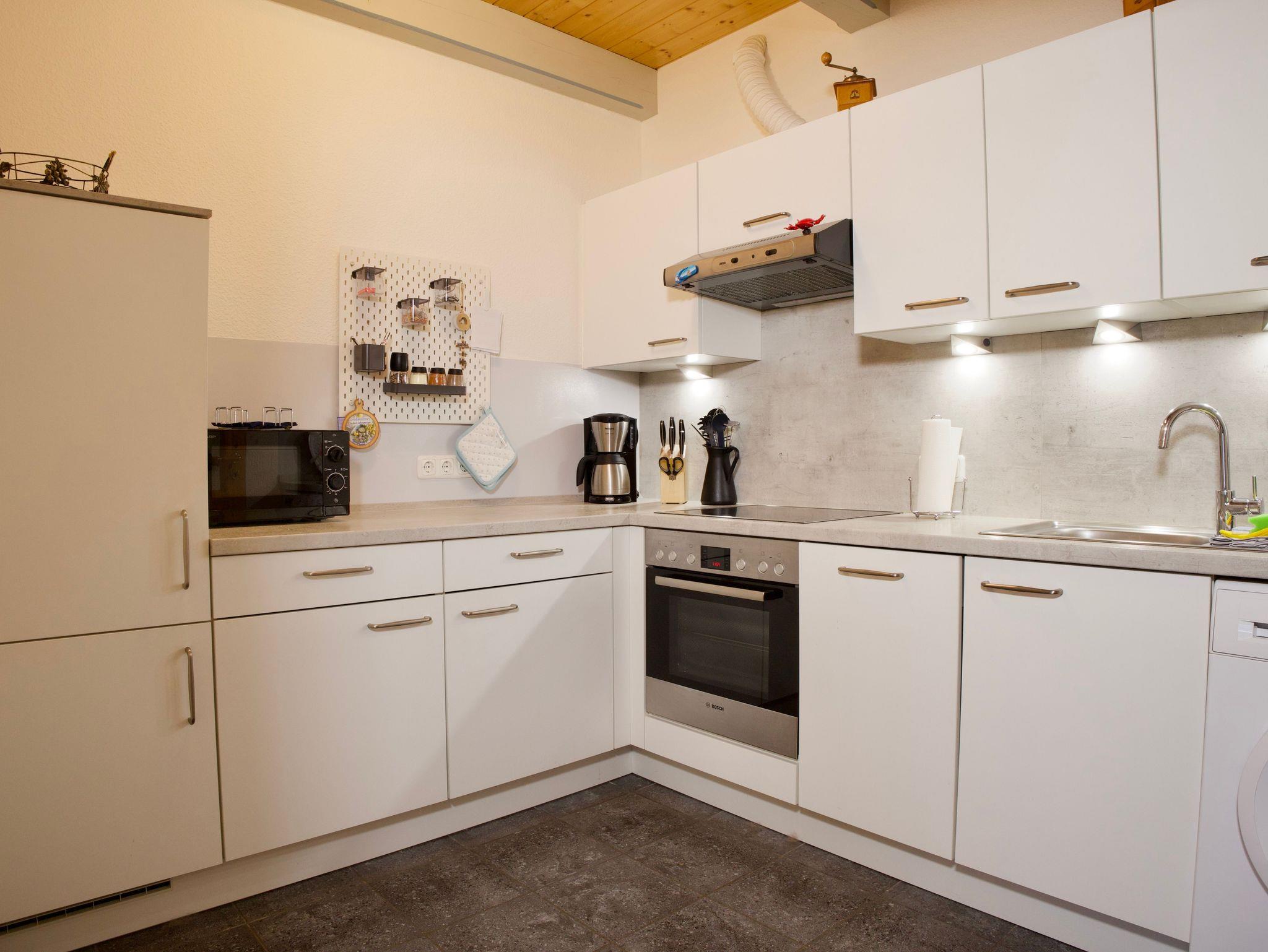 Ebenfalls im Erdgeschoss liegt die separate, vollständig ausgestattete Küche. Neben Kaffeemaschine, Spülmaschine und Gefriermöglichkeit befindet sich hier auch eine Waschmaschine. Das maritim gestaltete Duschbad mit WC rundet das Raumangebot auf dieser Ebene ab.