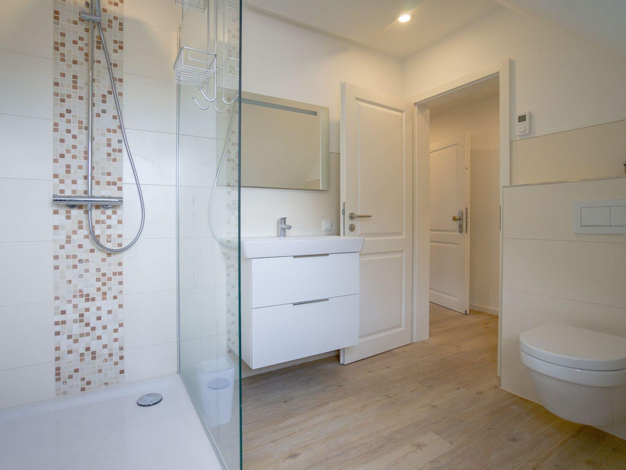 Das Bad bietet eine einladende ebenerdige Regendusche. In einem kleinen Hauswirtschaftsraum steht Ihnen eine Waschmaschine zur Verfügung. Die Wohnung wird über eine Fußbodenheizung und indirekte Infrarotelemente erwärmt.