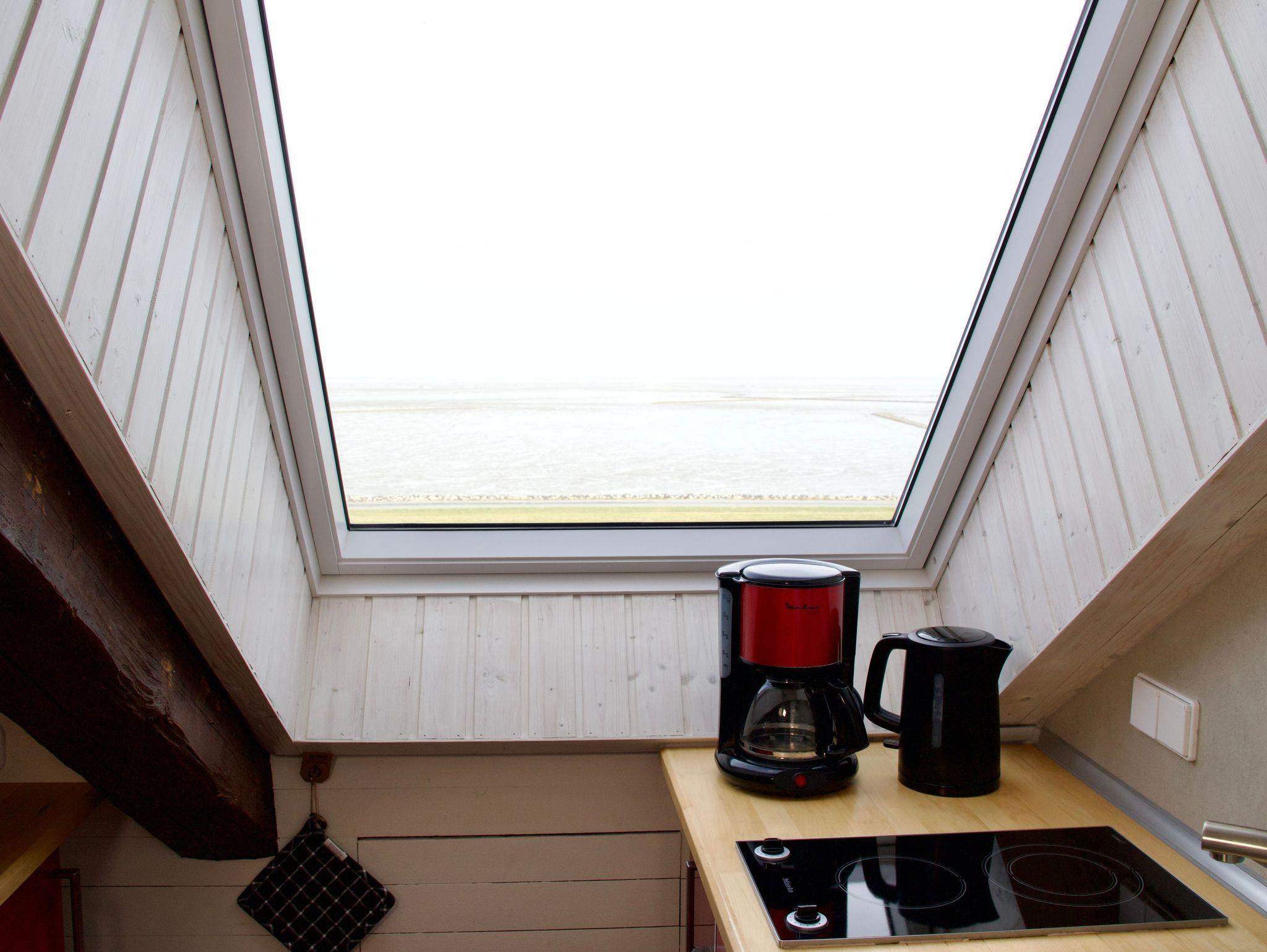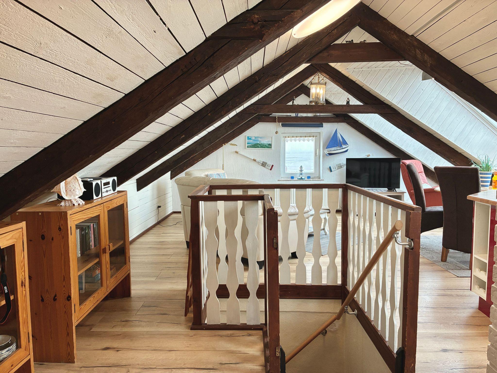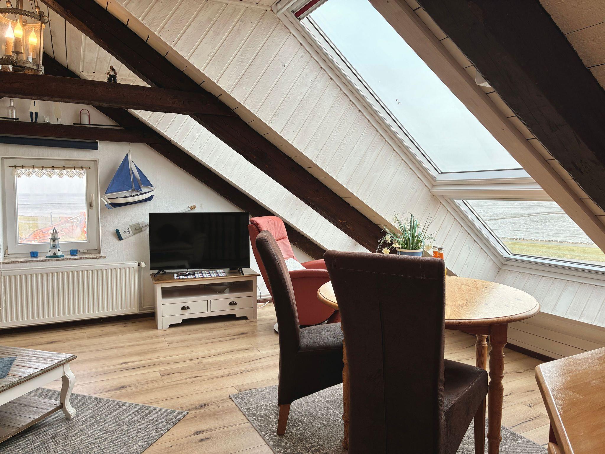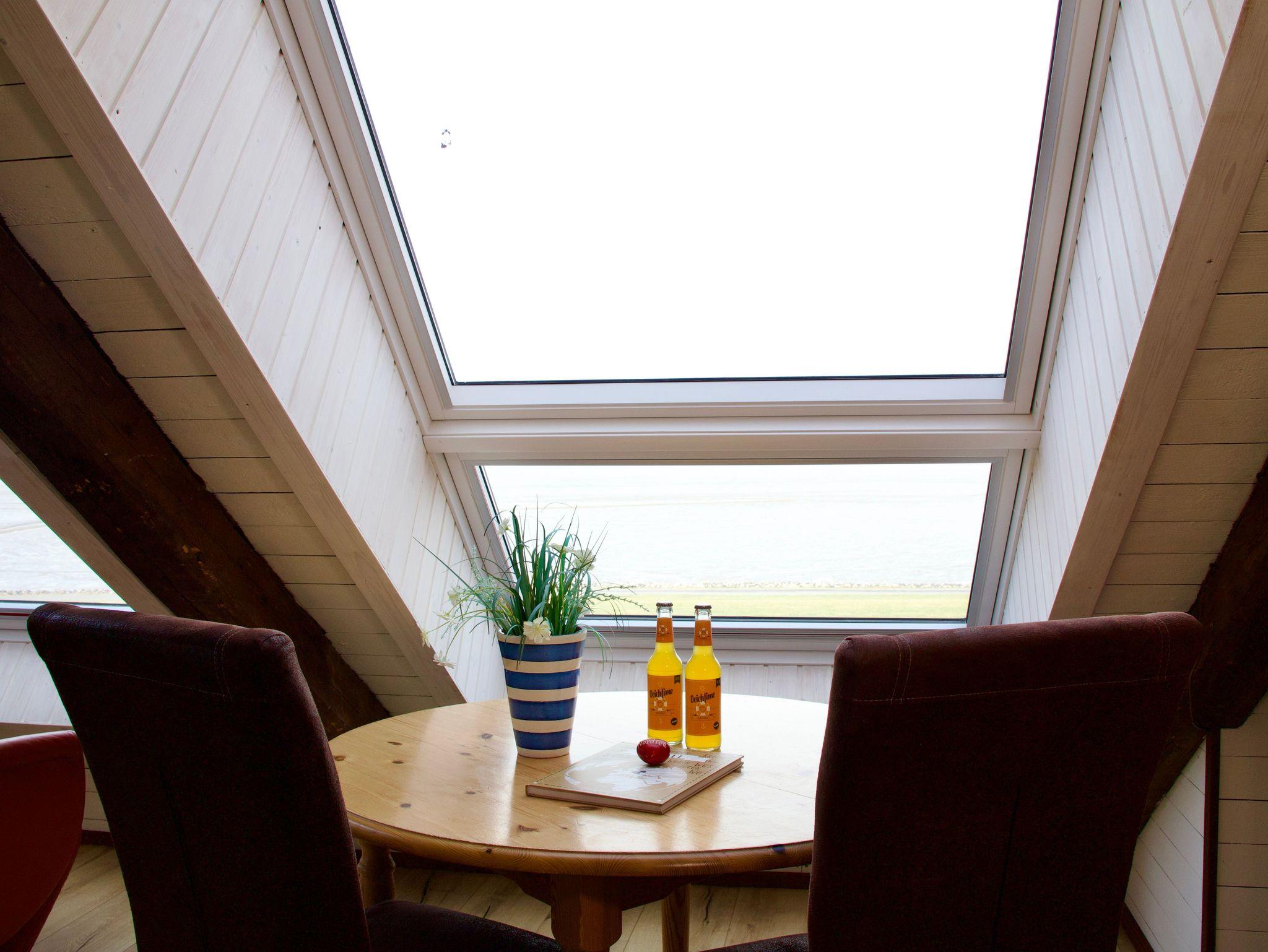 Die rund 45 Quadratmeter große Wohnung ist für bis zu drei Personen geeignet und gemütlich mit viel Liebe zum Detail eingerichtet. Dachschrägen und das offene Raumgefühl verleihen der Wohnung ihren besonderen Charakter und unterstreichen die Atmosphäre des Dachgeschosses. Der Zugang zum Wohnbereich erfolgt über eine schmale Treppe, die typisch für nordstrander Deichhäuser ist. Vom Wohnbereich aus schweift der Blick über das Wattenmeer und hinaus auf die Nordsee.
