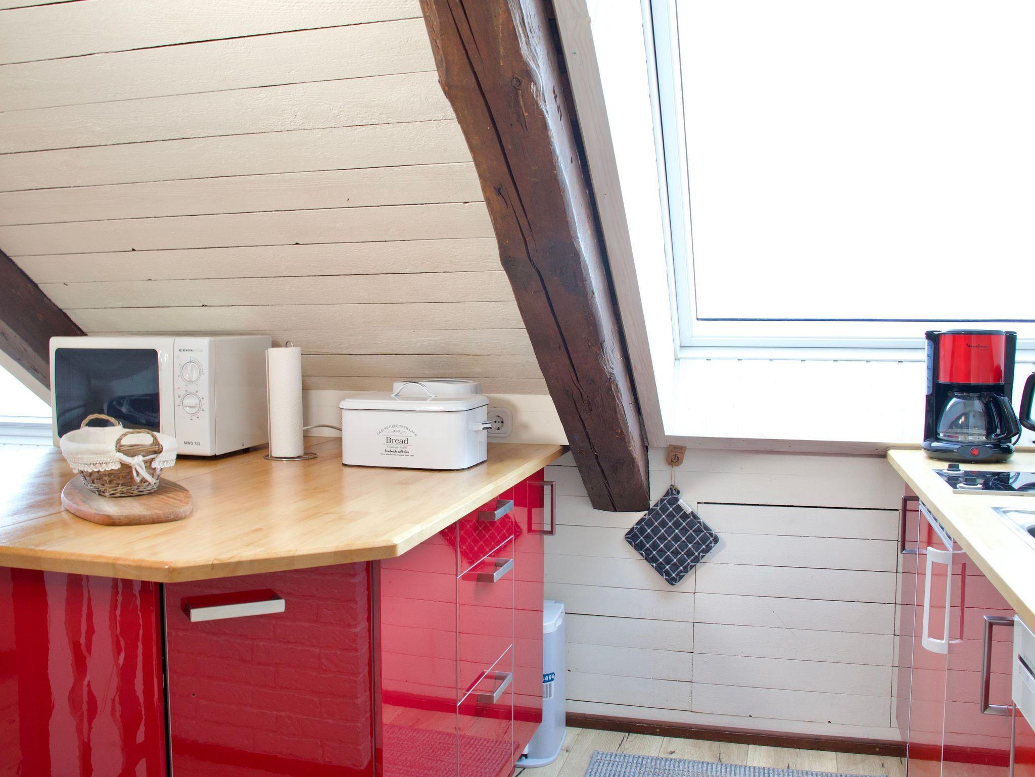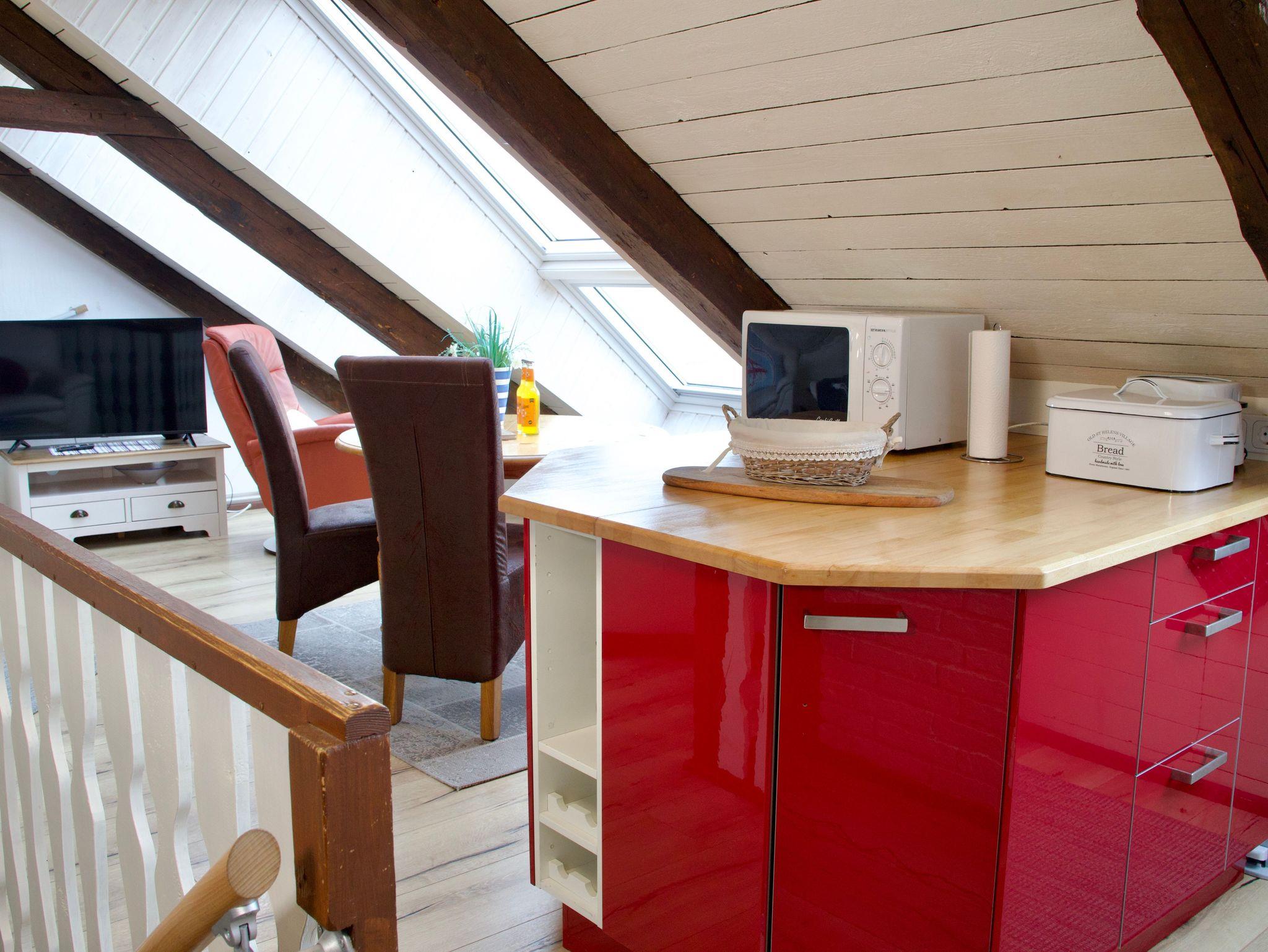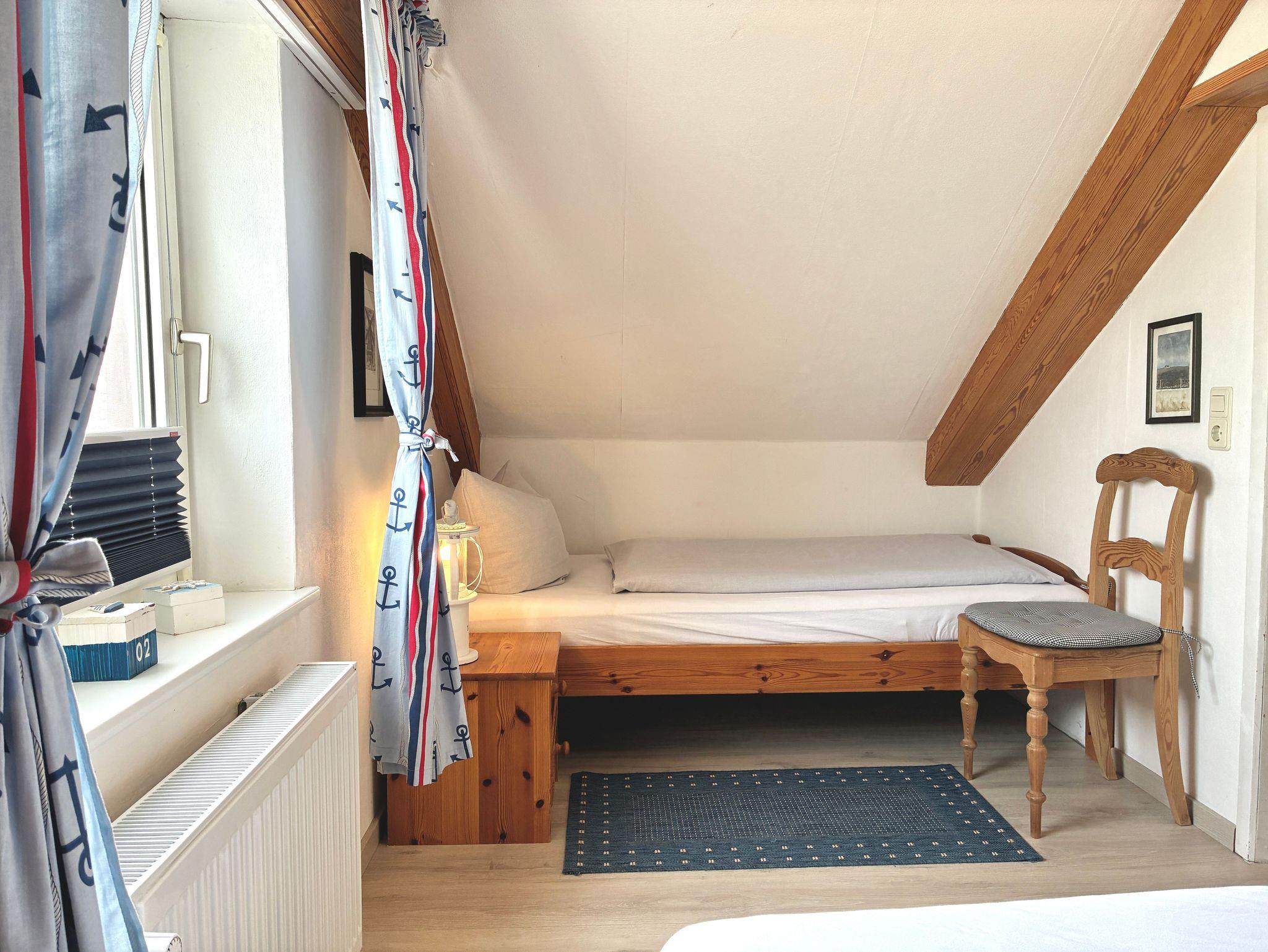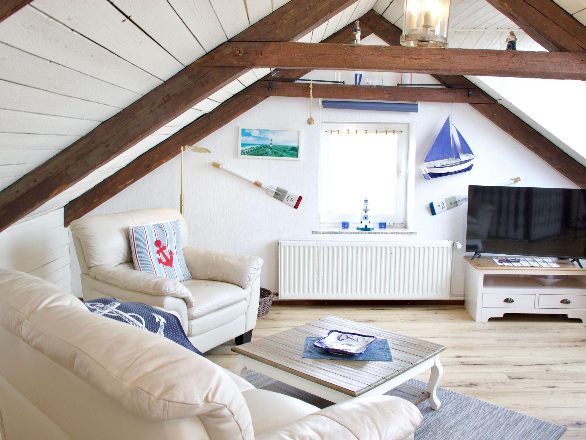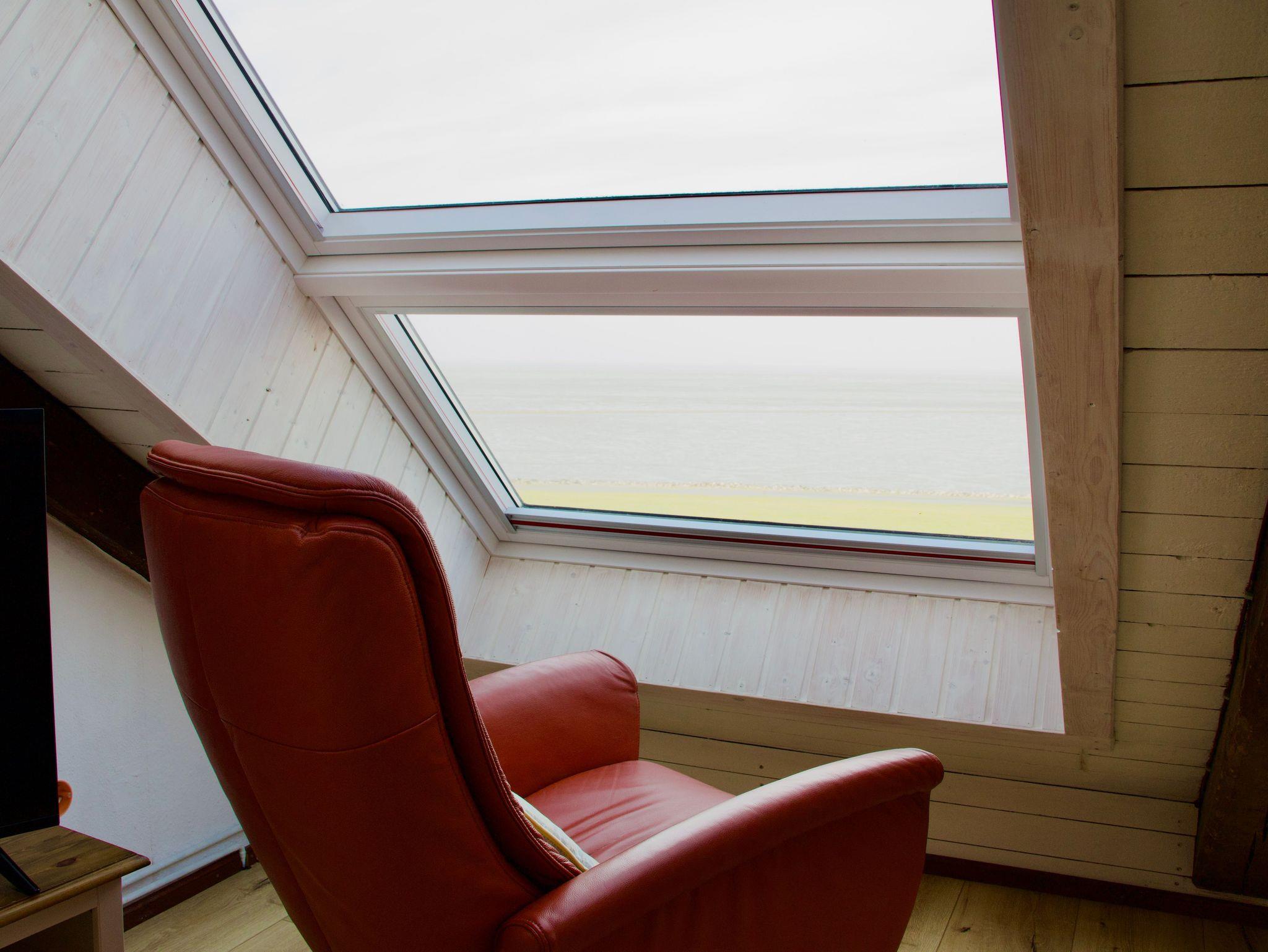 Die rund 45 Quadratmeter große Wohnung ist für bis zu drei Personen geeignet und gemütlich mit viel Liebe zum Detail eingerichtet. Dachschrägen und das offene Raumgefühl verleihen der Wohnung ihren besonderen Charakter und unterstreichen die Atmosphäre des Dachgeschosses. Der Zugang zum Wohnbereich erfolgt über eine schmale Treppe, die typisch für nordstrander Deichhäuser ist. Vom Wohnbereich aus schweift der Blick über das Wattenmeer und hinaus auf die Nordsee.
